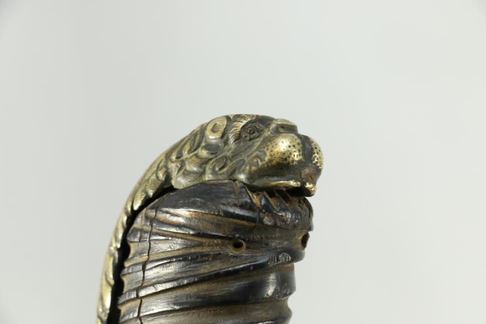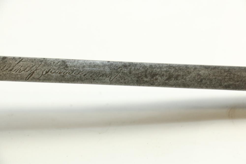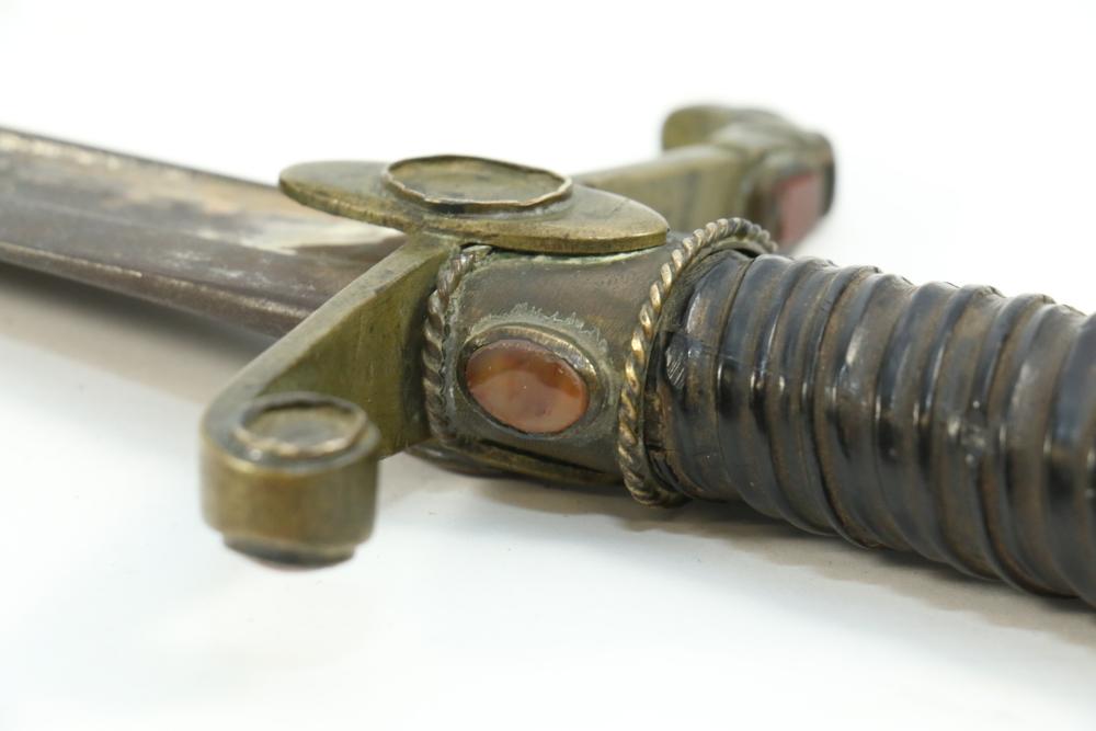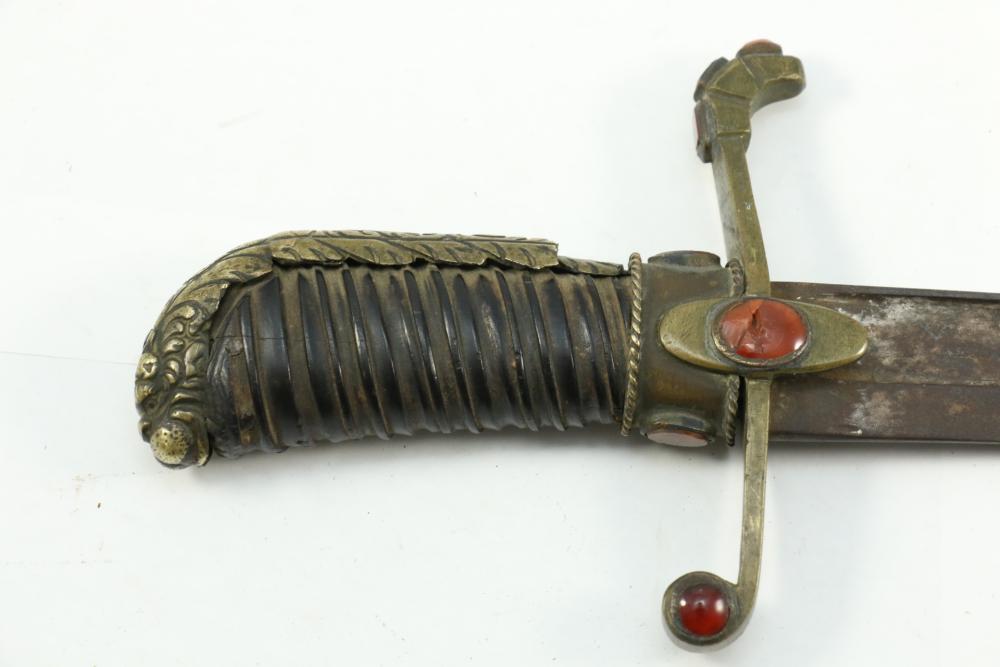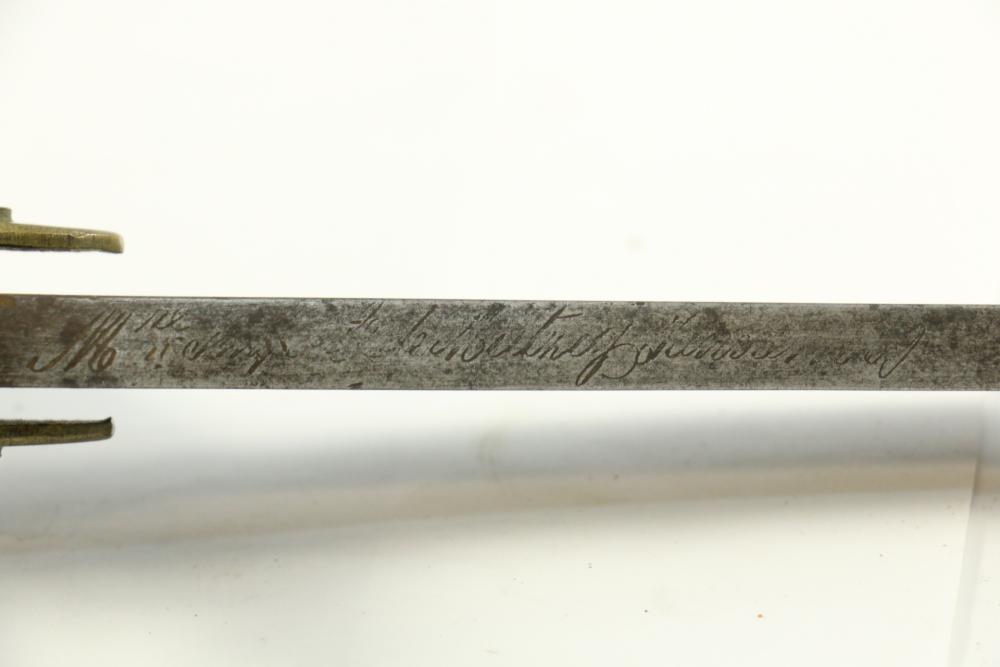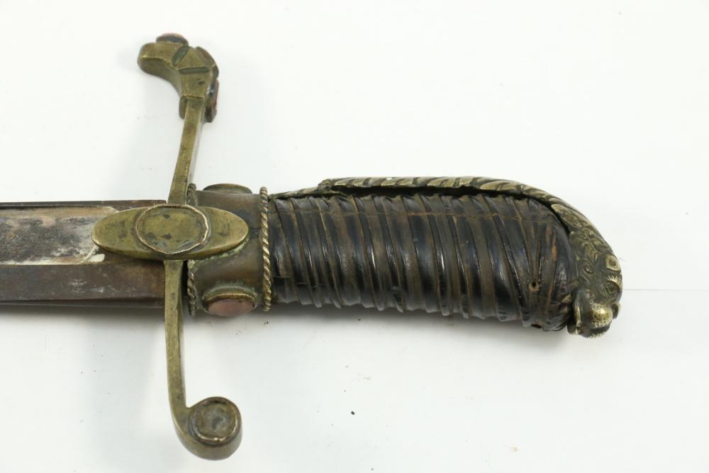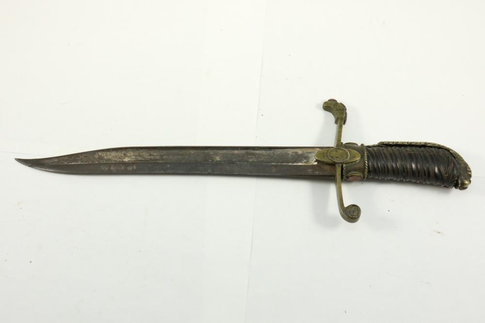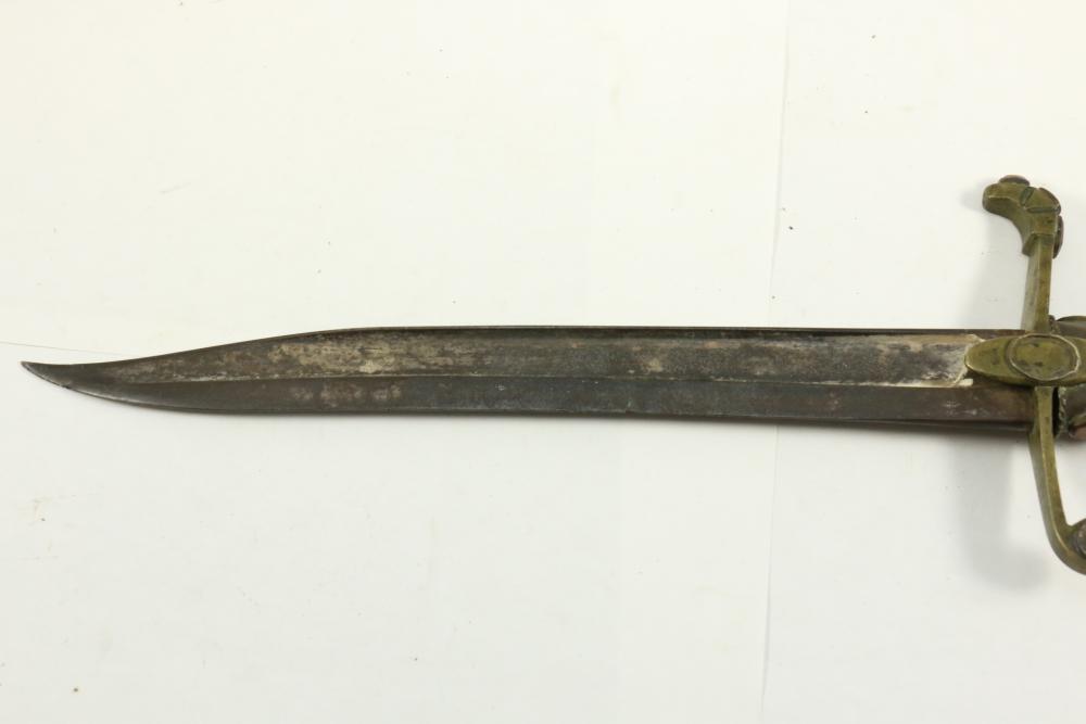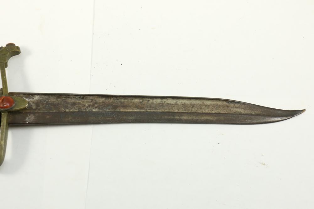 Believed to be cut down 1866 chassepot sword spine having only visible markings incl "Mo re Imp" remainder of writing illegible, brass cross guard, and animal head pommel originating at cross guard blade measuring 10.75"L, handle including cross guard measuring 5", total length 15"L.