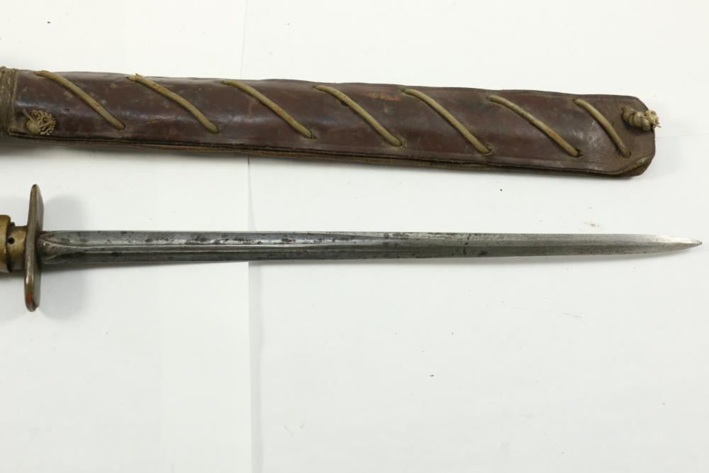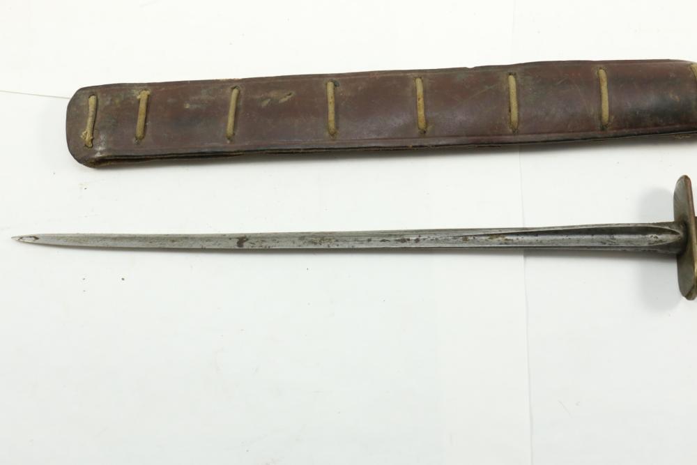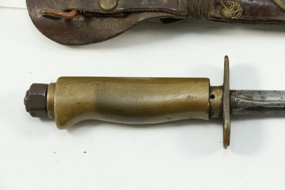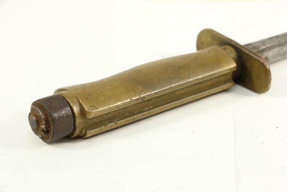 Bayonet with crucifix blade and scabbard, cross guard marked "M.M16" "003-5", having brass handle, serial number on scabbard 28462*(asterisk represents unidentifiable digit), overall length of bayonet without scabbard 16"L.