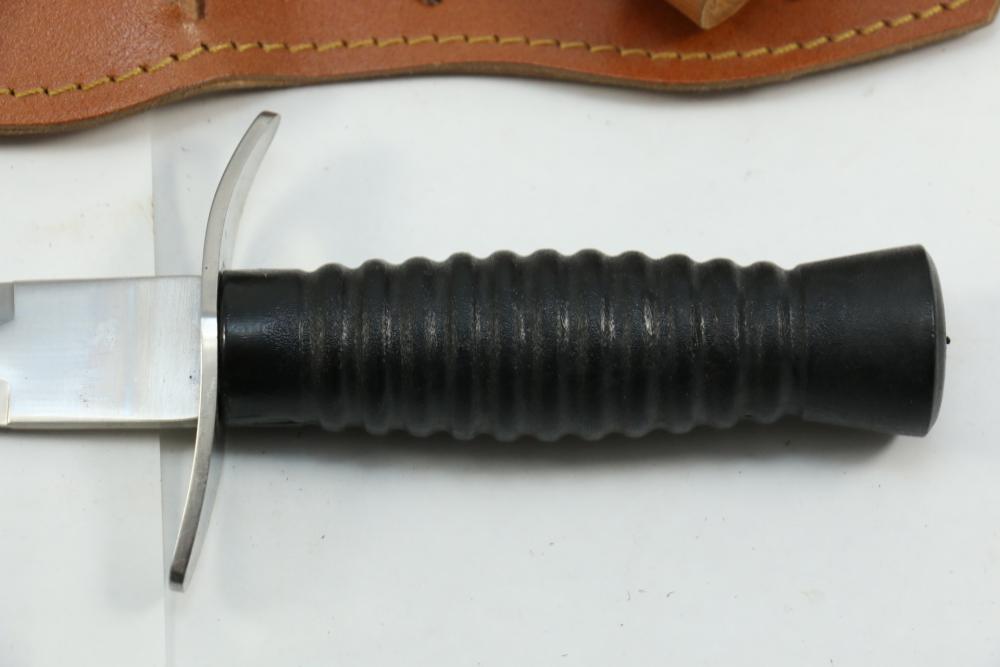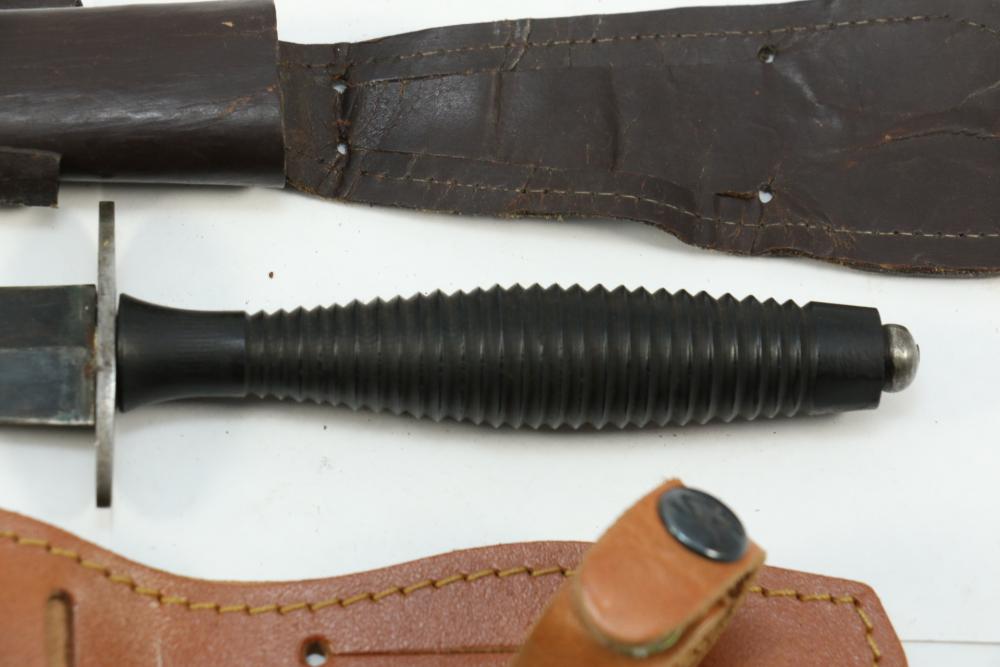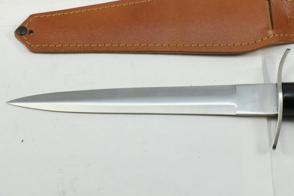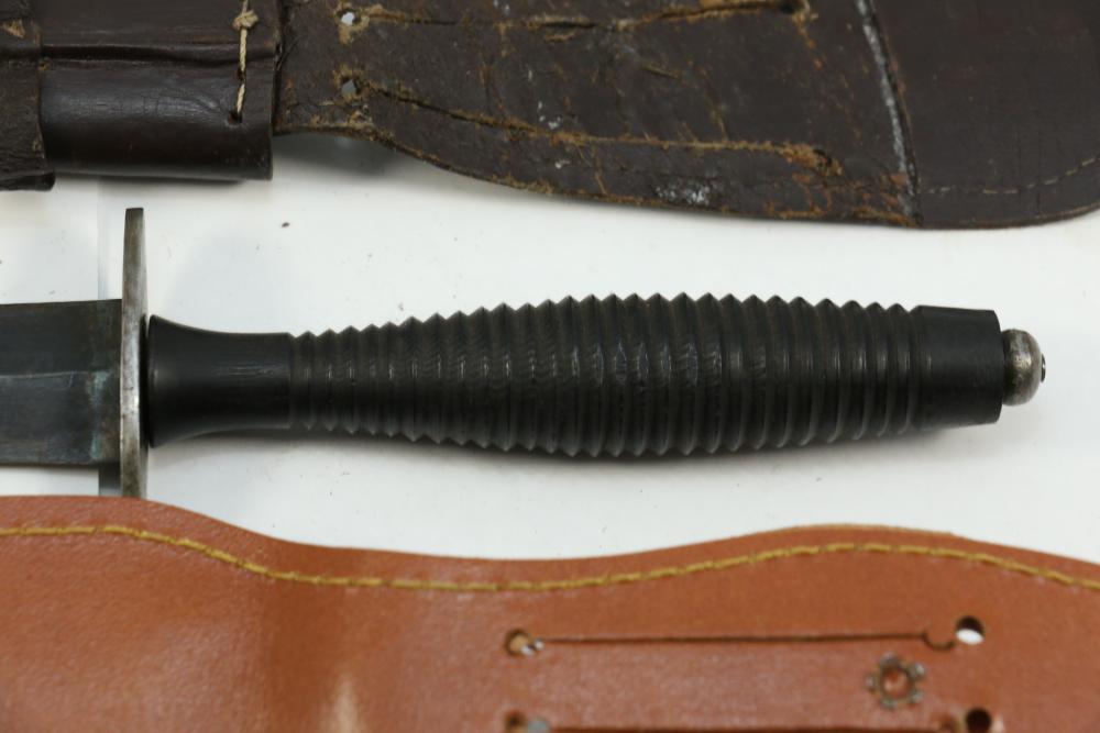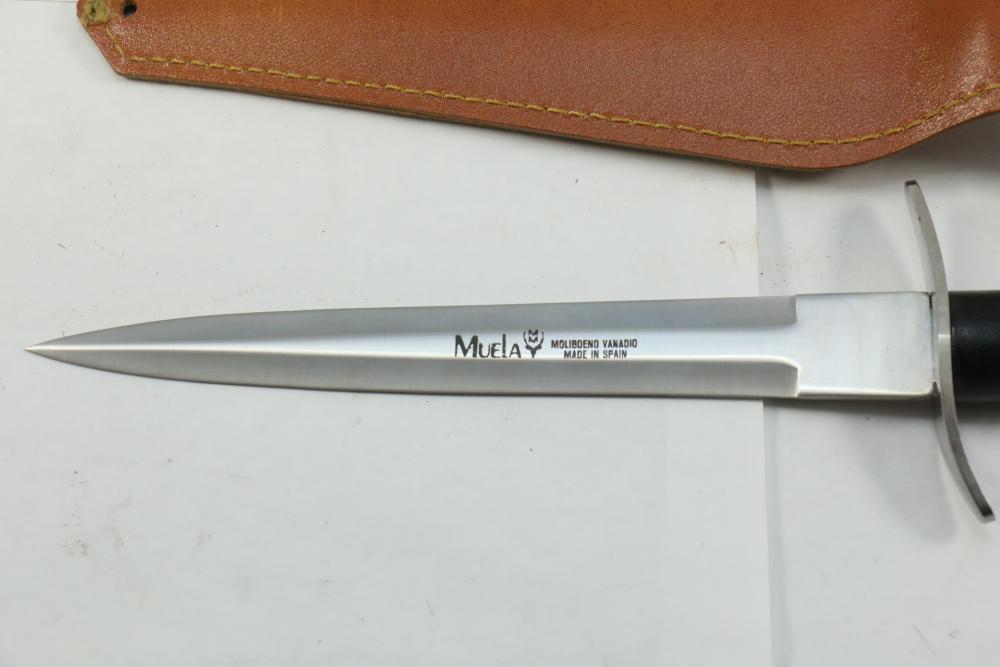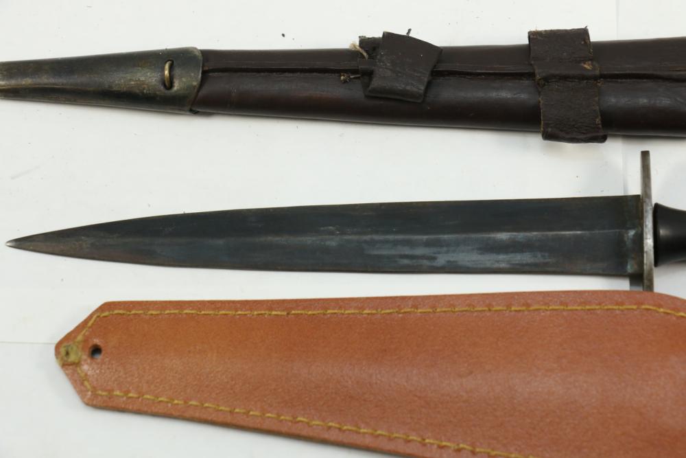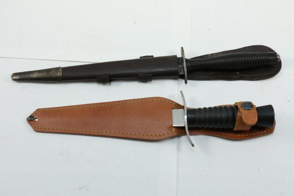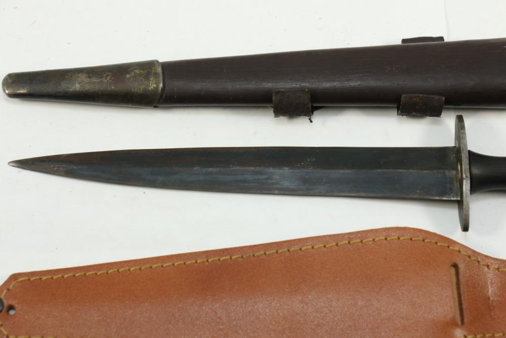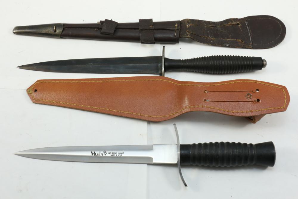 Reproduction British Commando 7" fighting knife attributed to Fairbairn-Sykes, no visible markings, length of dagger without scabbard 13.25"L, also incl dagger marked on blade " Muela Molibdeno Vanadiq Made In Spain" with no additional markings length without scabbard 11.25"L.