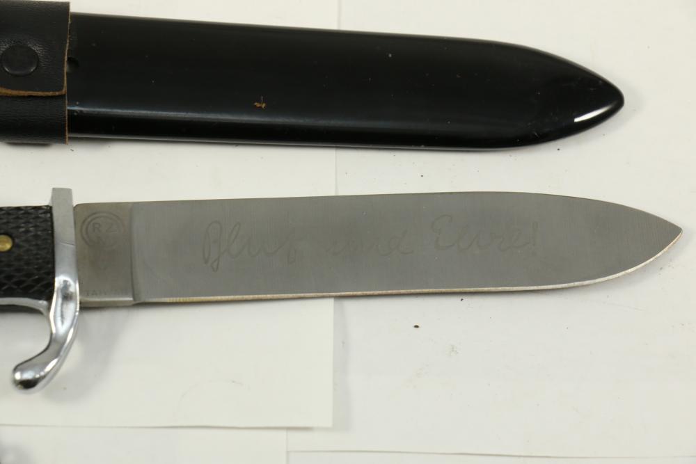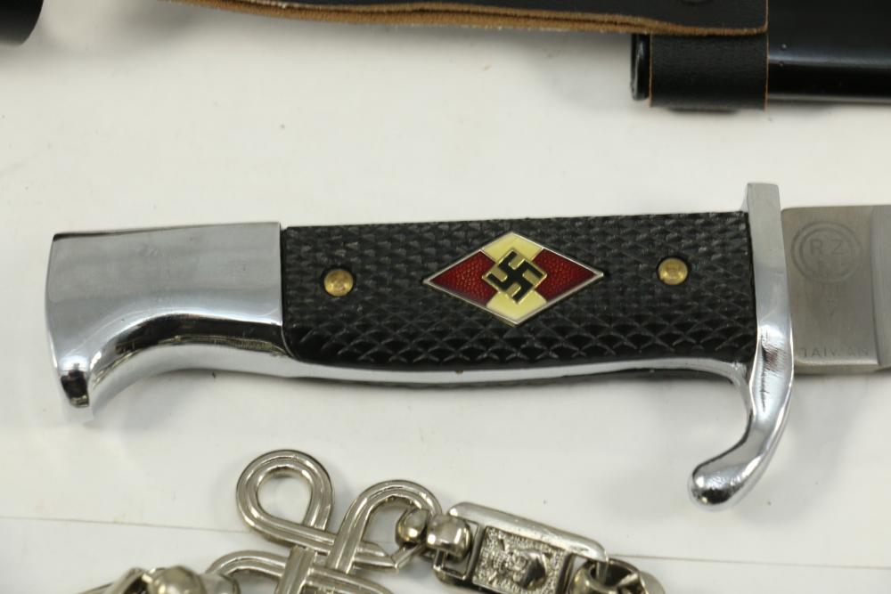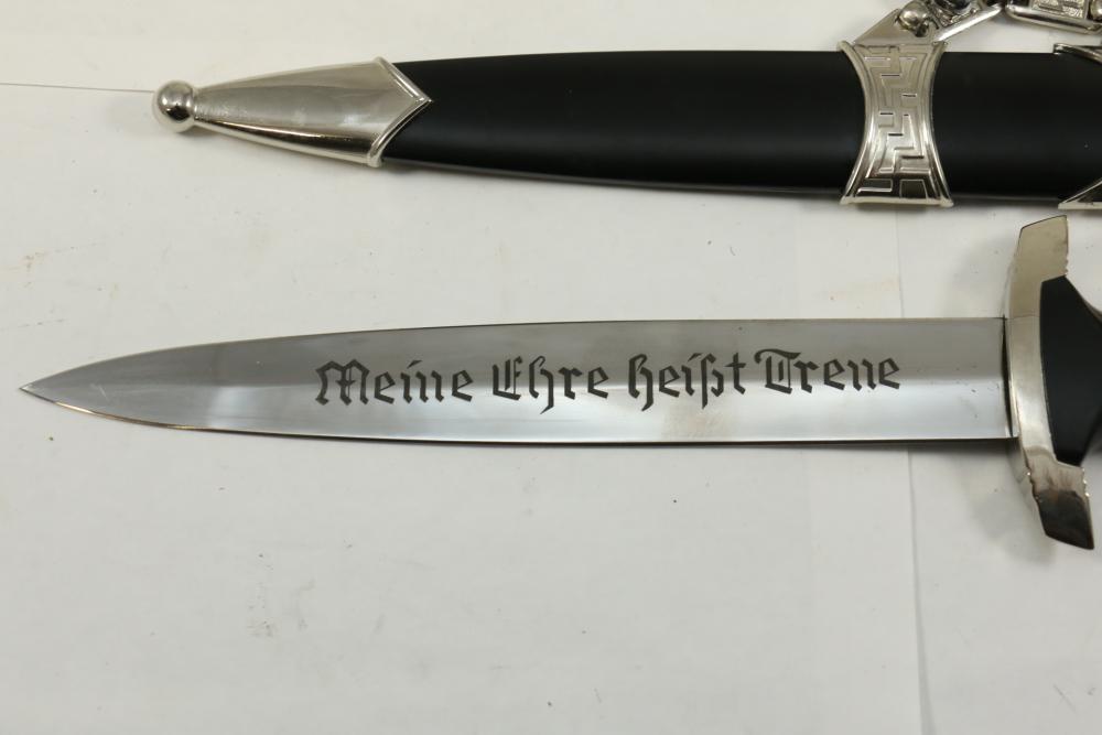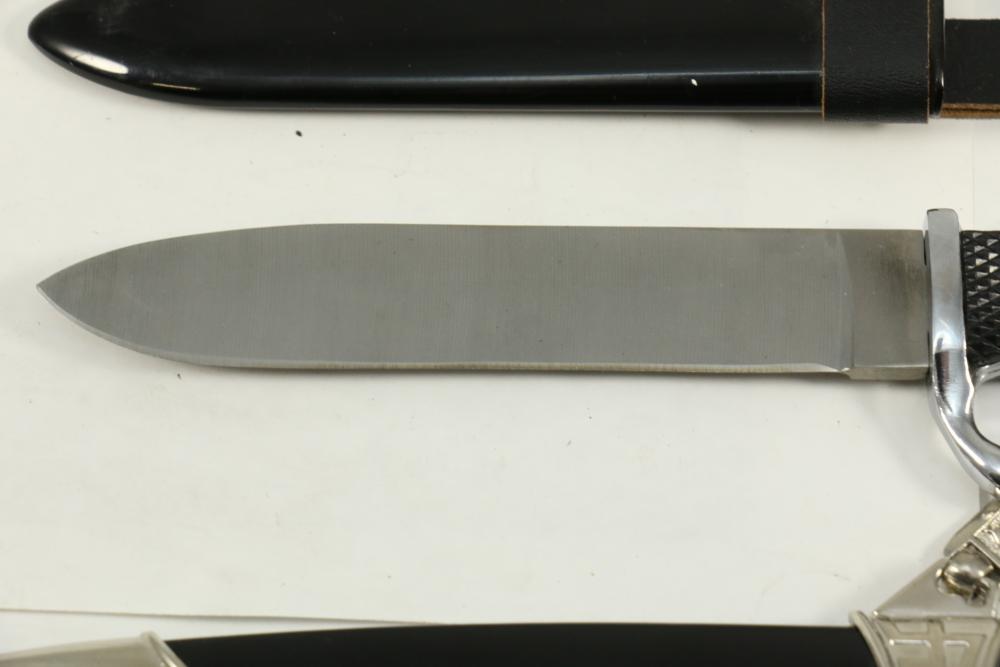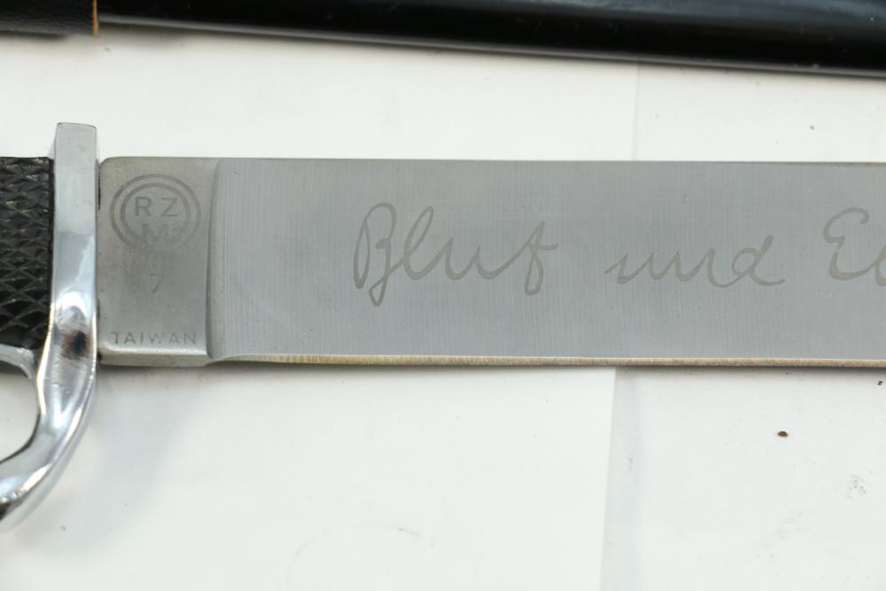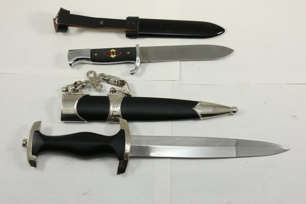Two reproduction Nazi Germany daggers both in scabbards, one "SS" dagger marked on blade appearing to read "Meine Ehre Heipt Treue"(My Honor Is Loyalty), reverse marked "China" larger measuring 13-7/8", Hitler Youth dagger marked on blade "Blut und Eure!(Blood and Honor!) ricasso marked "RZM 7 Taiwan" measuring 9.5"L without scabbard.