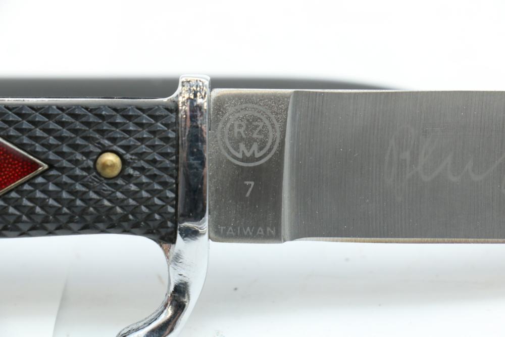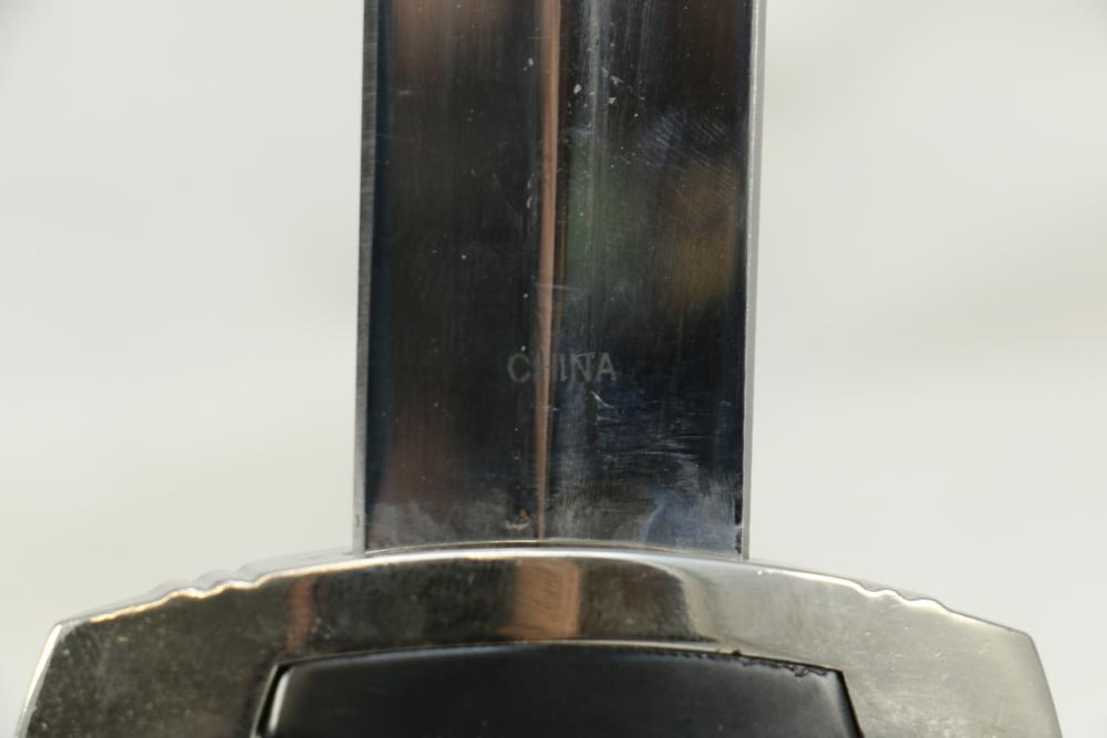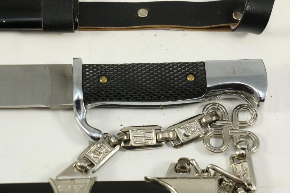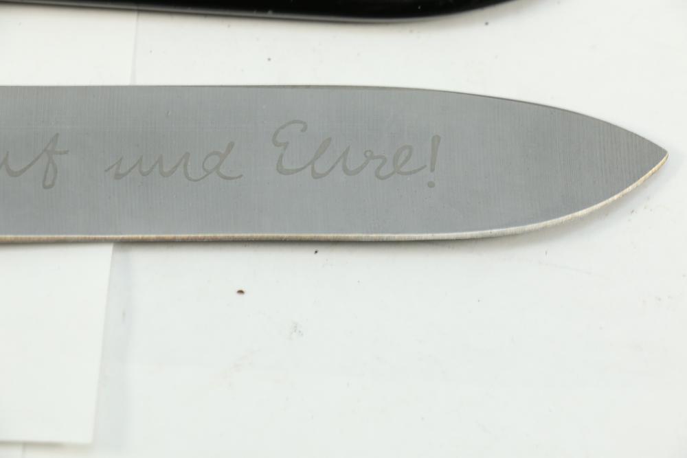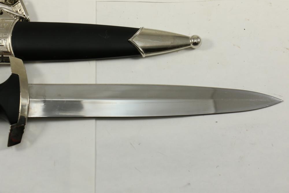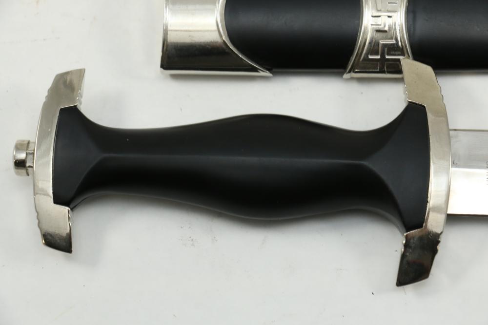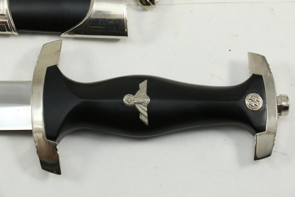 Two reproduction Nazi Germany daggers both in scabbards, one "SS" dagger marked on blade appearing to read "Meine Ehre Heipt Treue"(My Honor Is Loyalty), reverse marked "China" larger measuring 13-7/8", Hitler Youth dagger marked on blade "Blut und Eure!(Blood and Honor!) ricasso marked "RZM 7 Taiwan" measuring 9.5"L without scabbard.