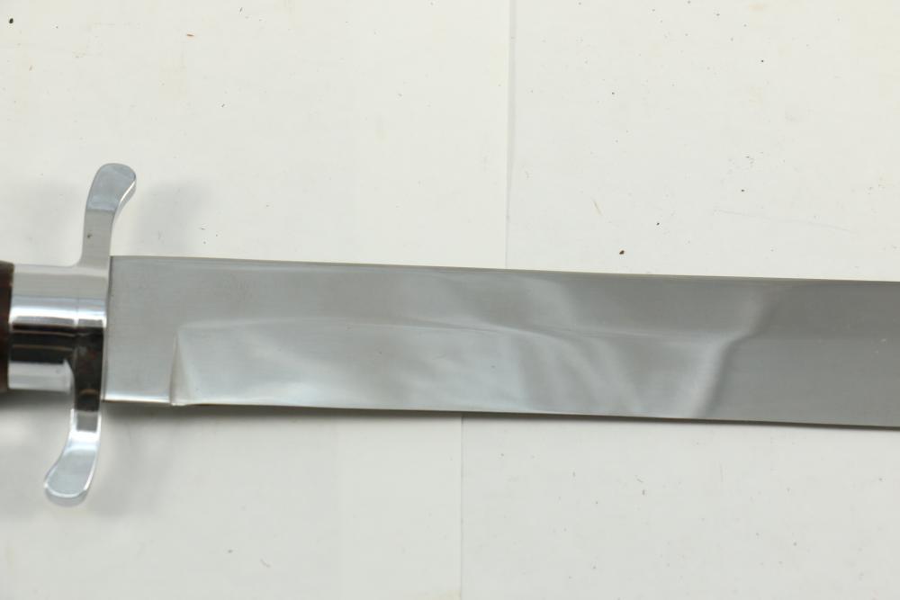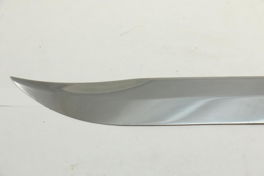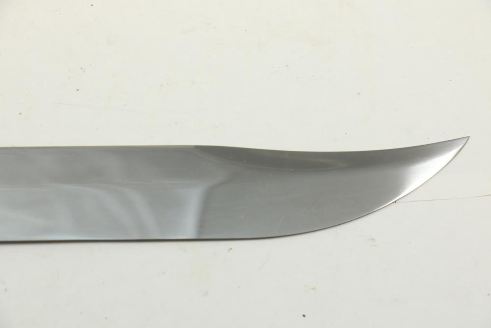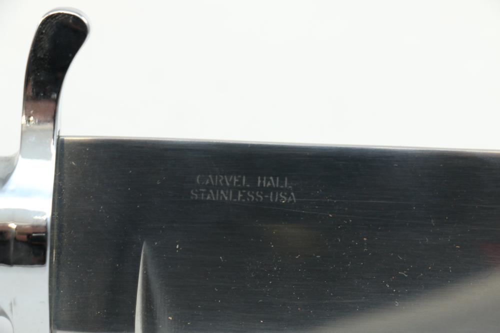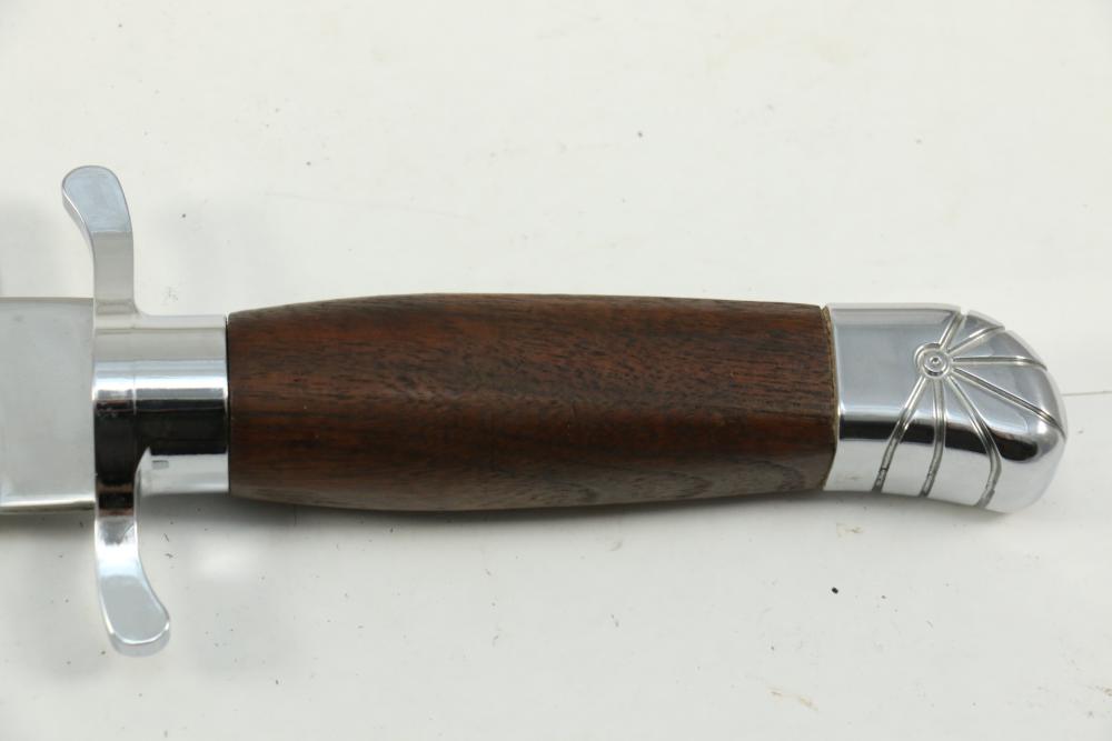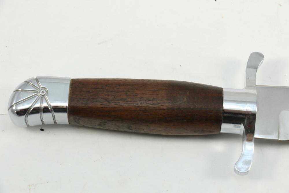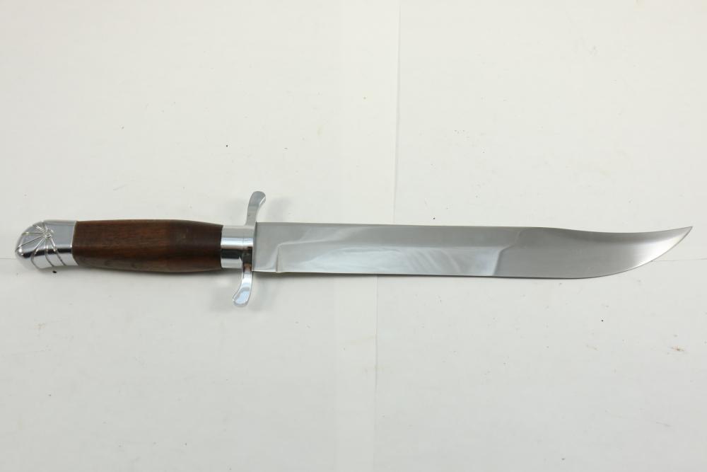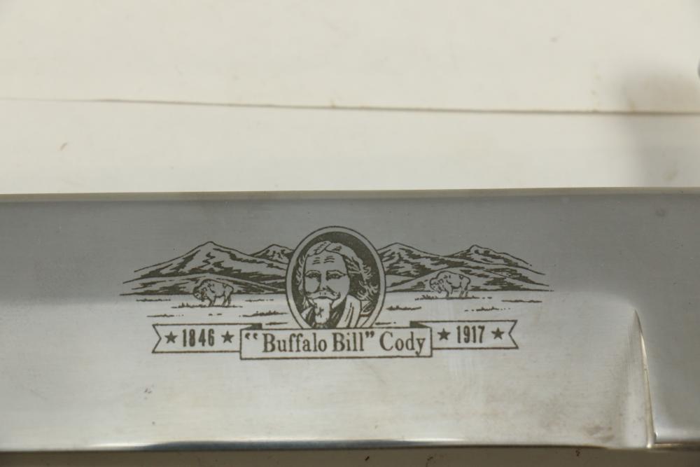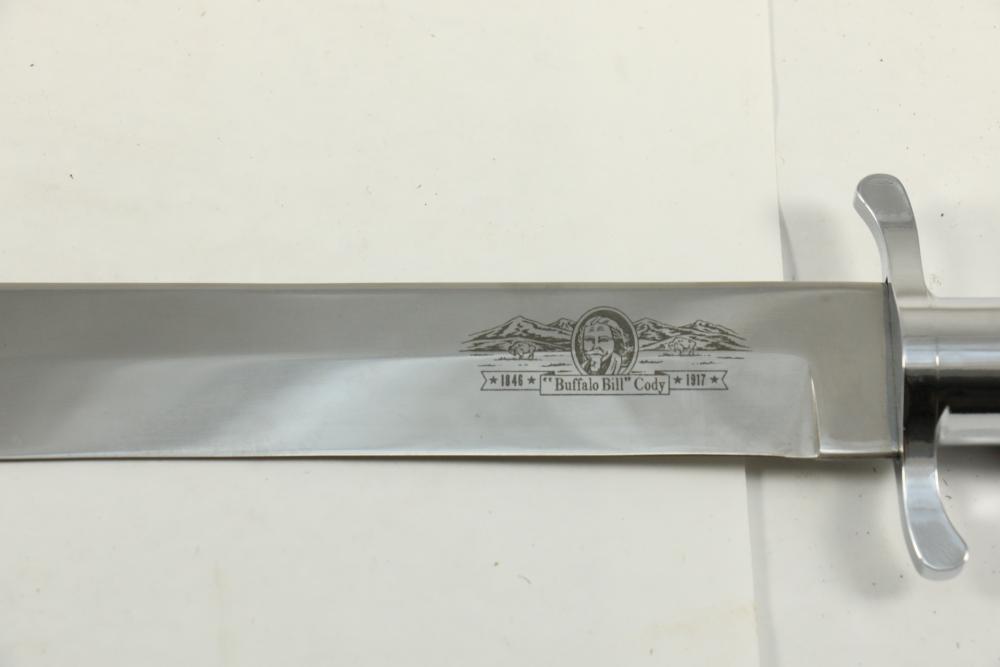 Buffalo Bill Bowie knife marked on blade "1846 "Buffalo Bill" Cody 1917" reverse marked "Carvel Hall Stainless-USA" with wood handle, overall measuring 15.75"L.