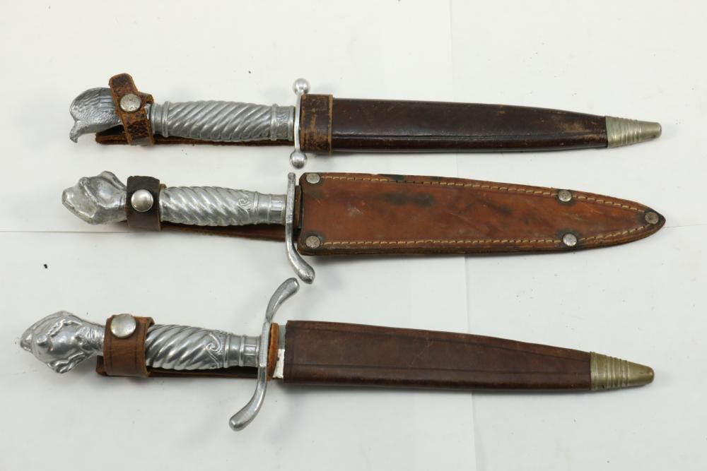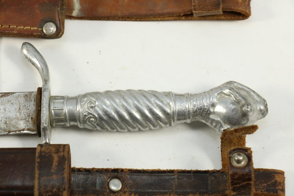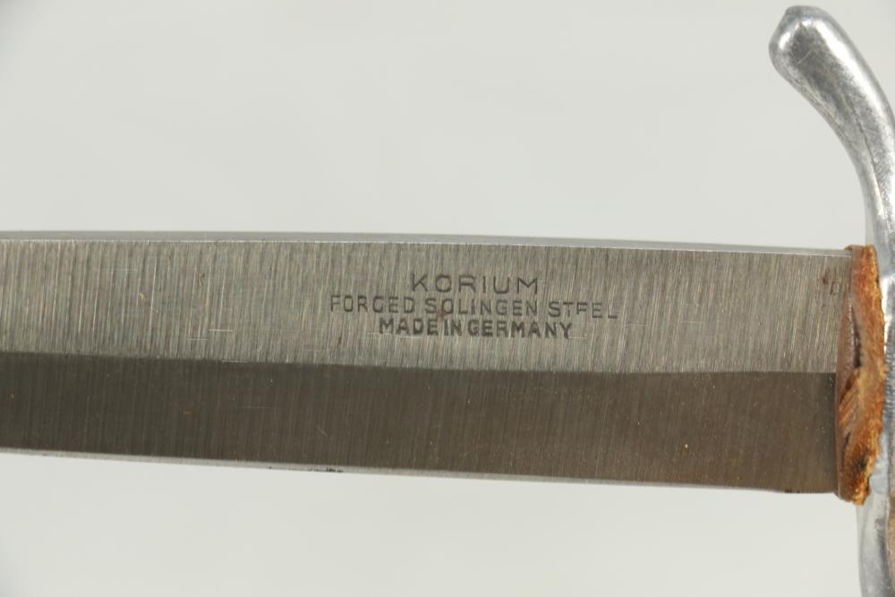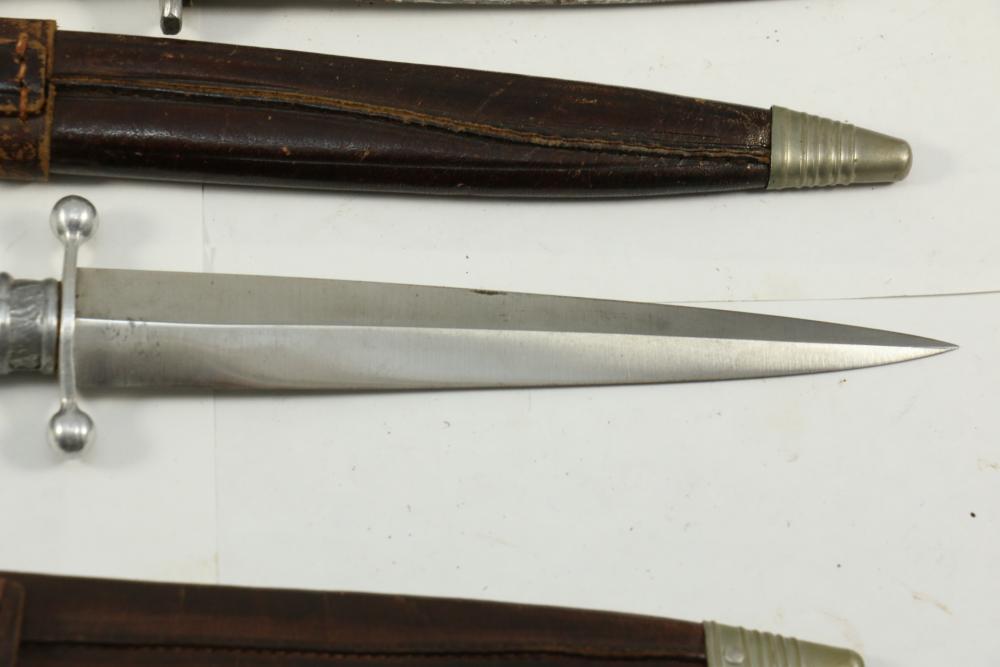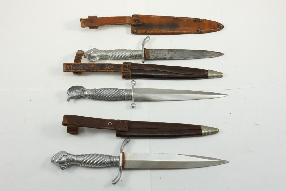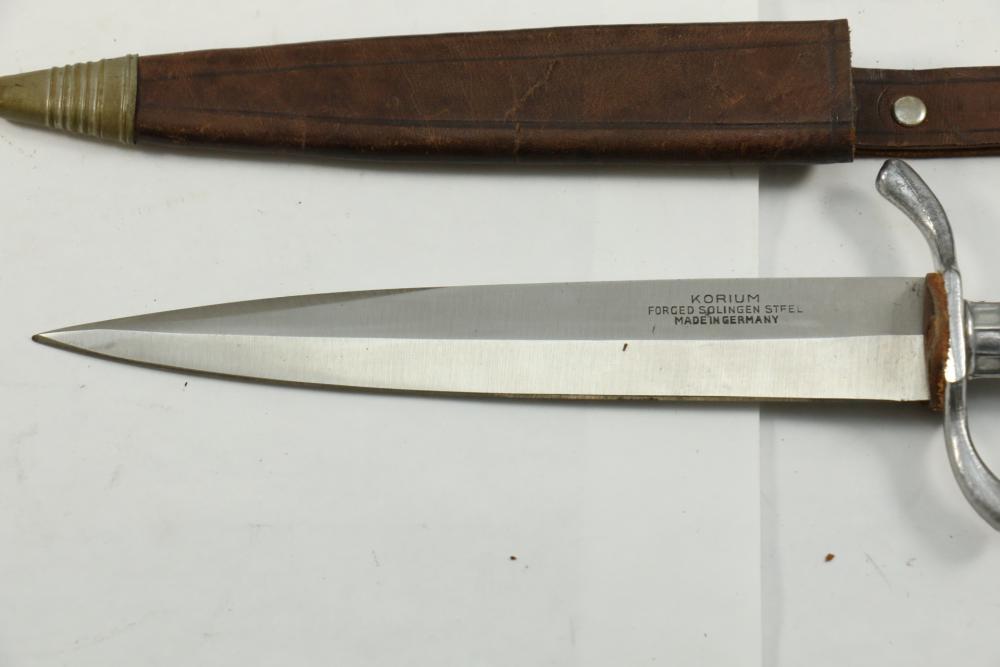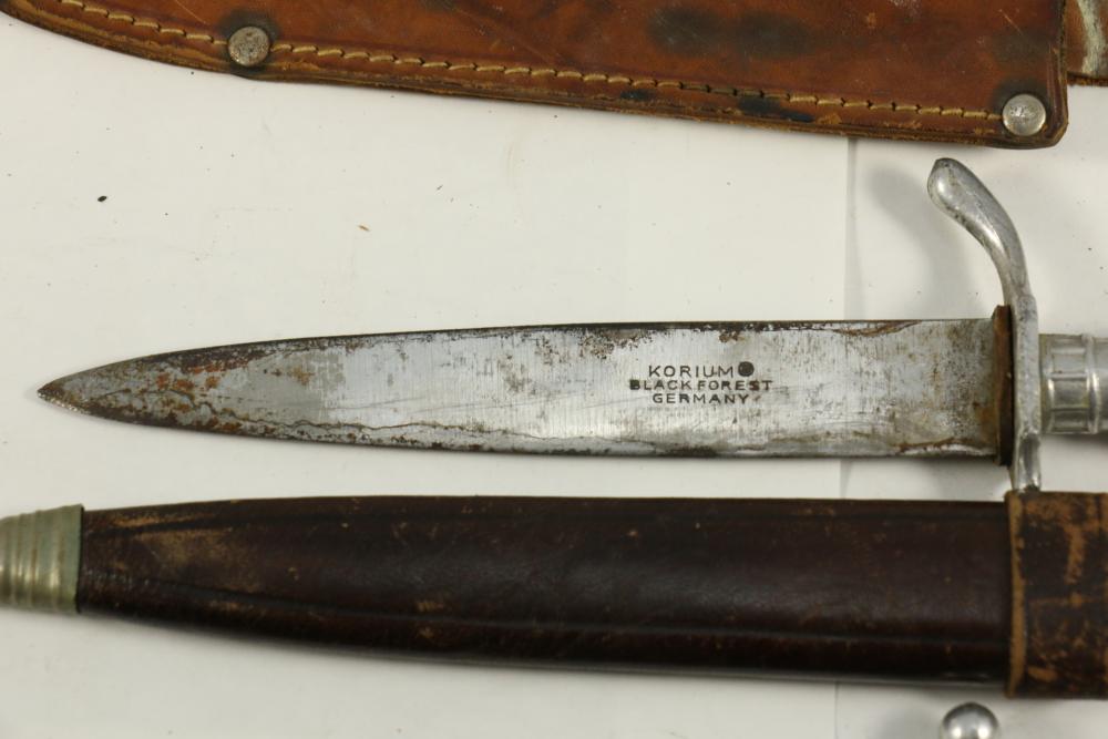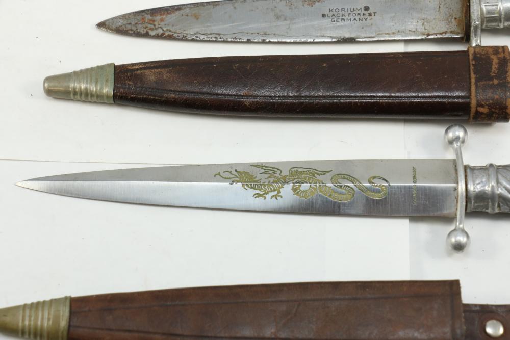 Three German knives all with sheaths, all with markings incl one with claw and ball pommel marked on blade "Korium Black Forest Germany" having one quillon snapped off measuring 9.25"L without sheath, second claw and ball pommel marked on blade "Korium Forged Solingen Steel Made In Germany" measuring 10-3/8"L without sheath, one having eagle pommel marked on blade "Solingen Germany" having engraved dragon motif on blade measuring 10"L without sheath.