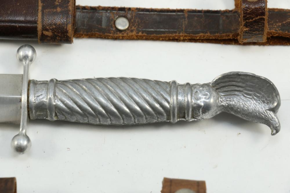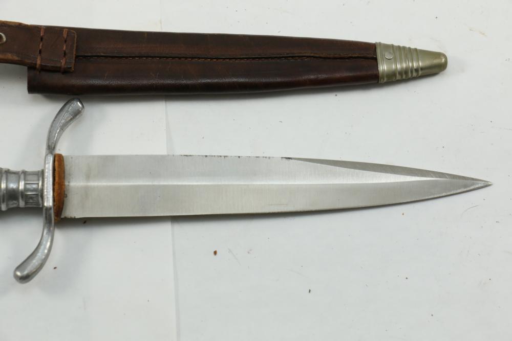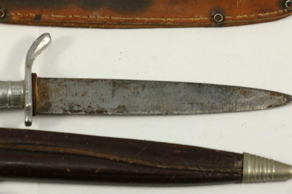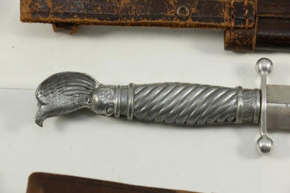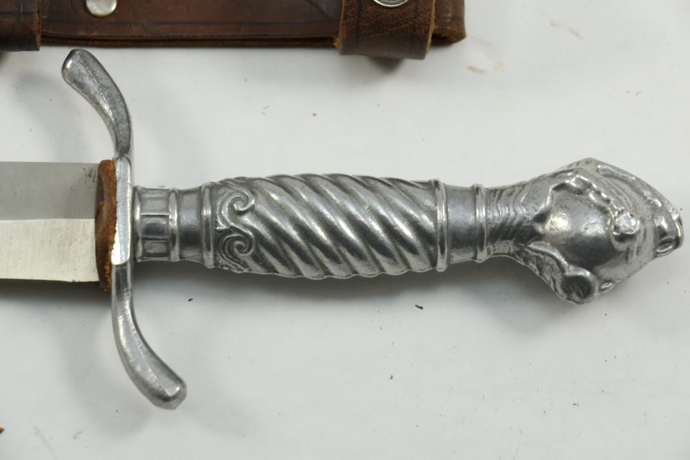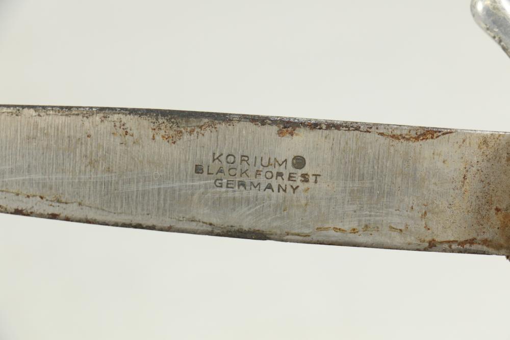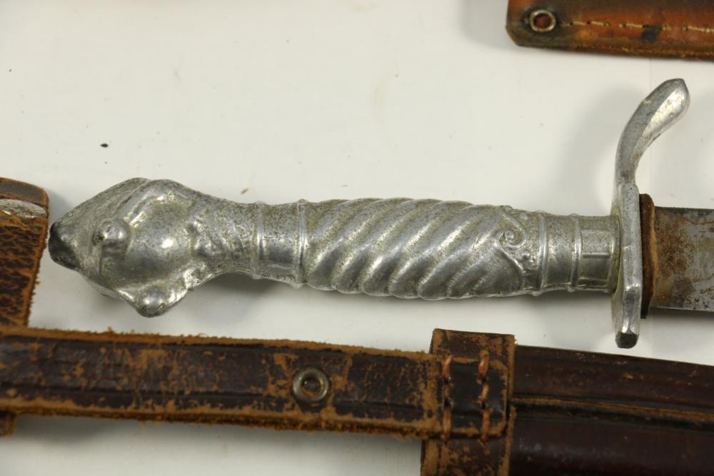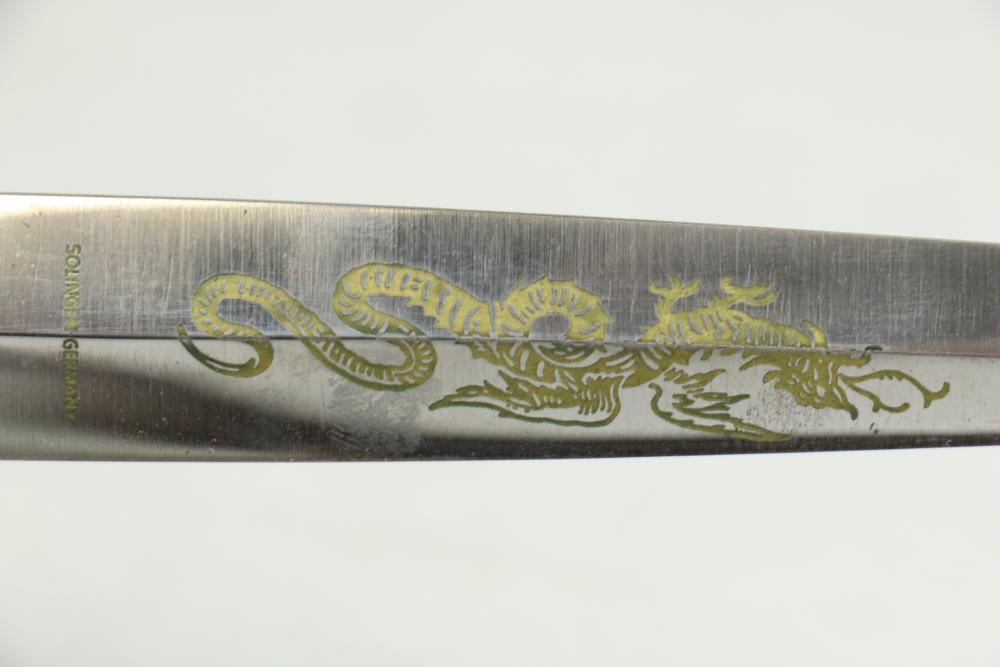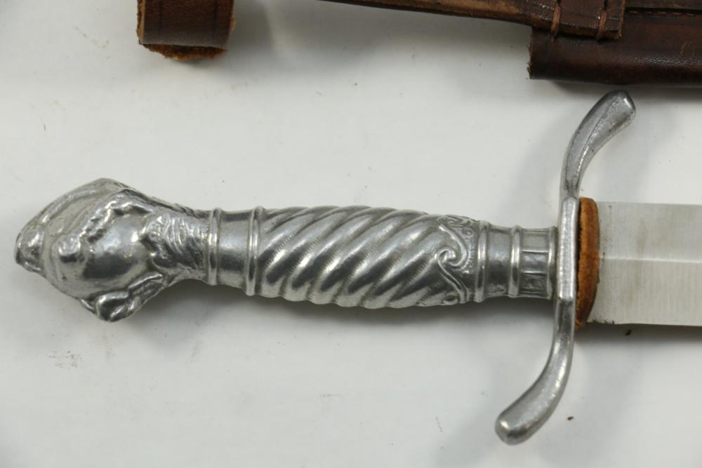 Three German knives all with sheaths, all with markings incl one with claw and ball pommel marked on blade "Korium Black Forest Germany" having one quillon snapped off measuring 9.25"L without sheath, second claw and ball pommel marked on blade "Korium Forged Solingen Steel Made In Germany" measuring 10-3/8"L without sheath, one having eagle pommel marked on blade "Solingen Germany" having engraved dragon motif on blade measuring 10"L without sheath.