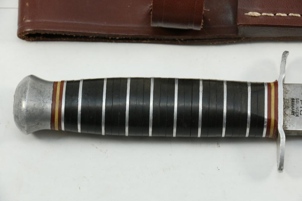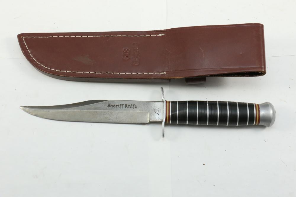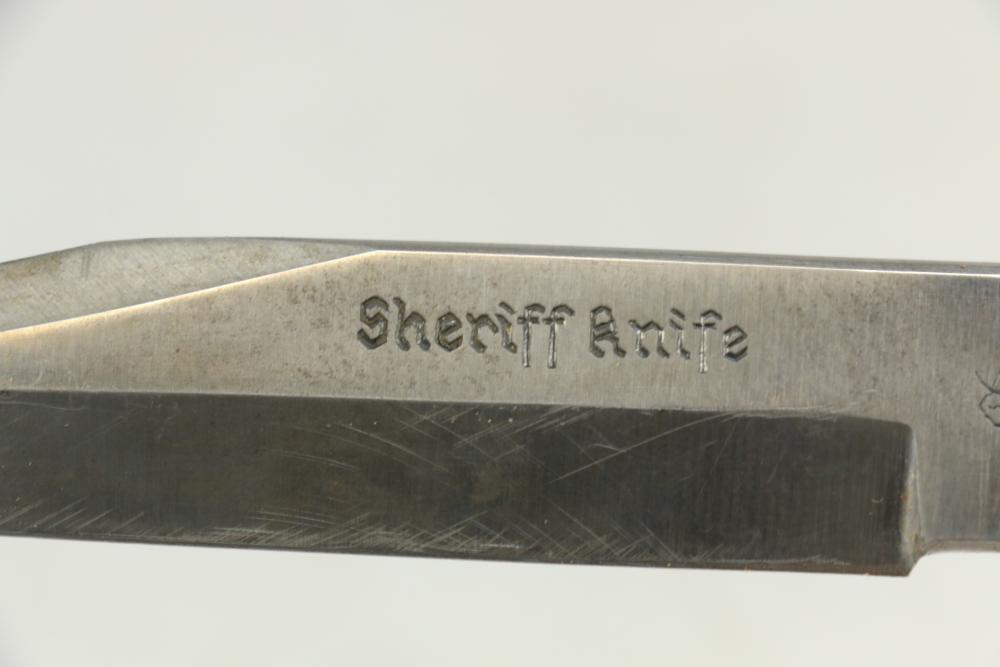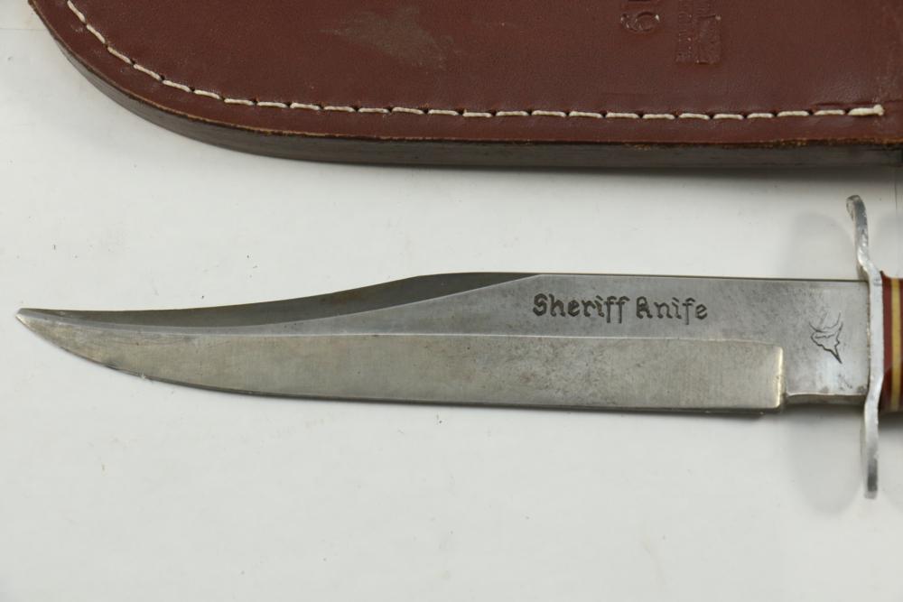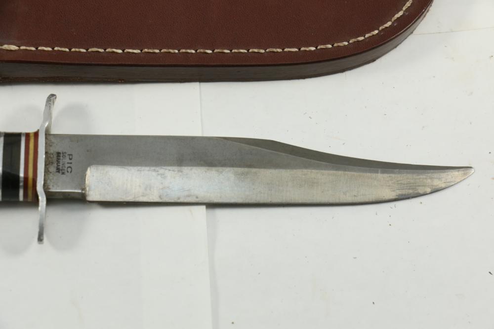 German hunting knife marked on blade "Sheriff Knife" and on reverse "Pic Solingen Germany", hallmark being pickaxe and mountain, leather sheath marked "American Leathercrafters 819", length of knife without sheath 10.5"L.