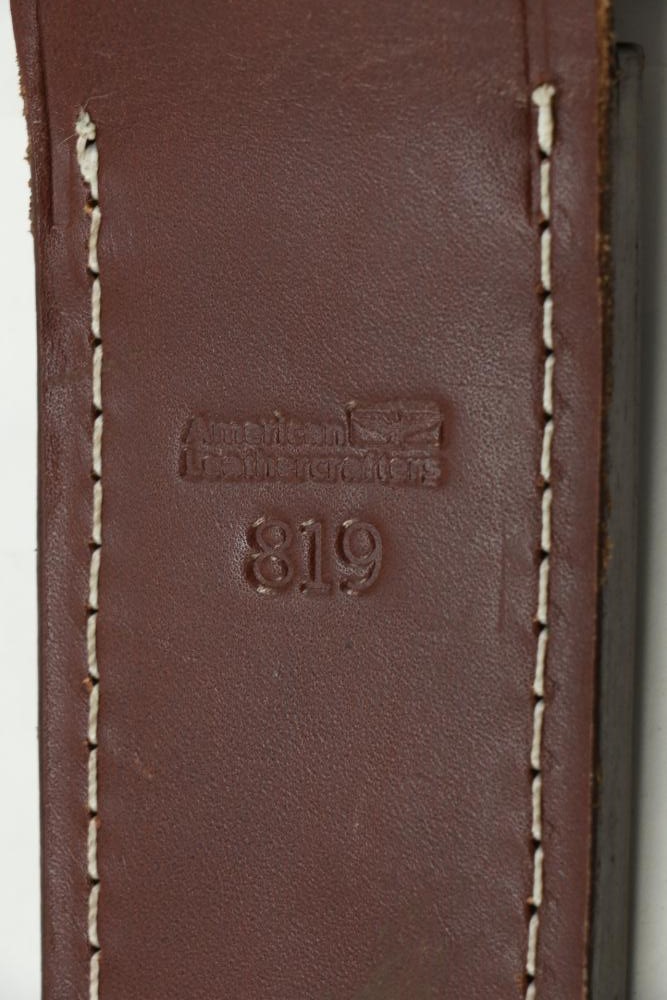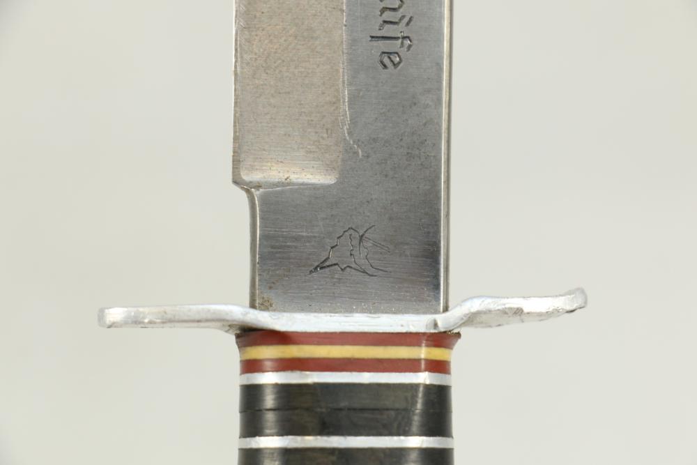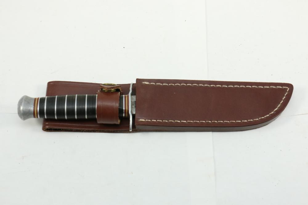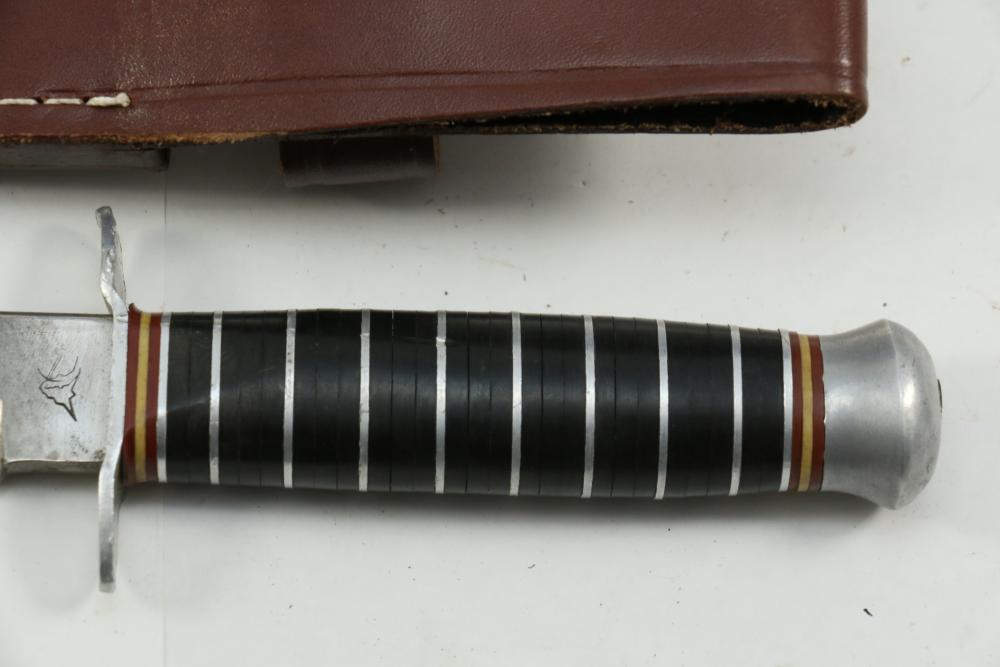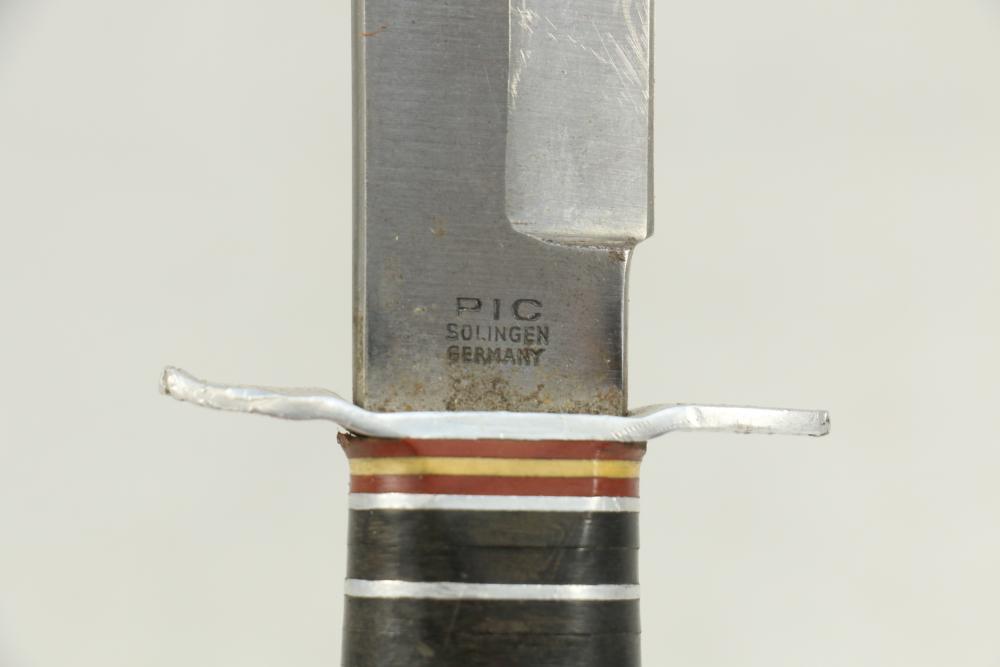 German hunting knife marked on blade "Sheriff Knife" and on reverse "Pic Solingen Germany", hallmark being pickaxe and mountain, leather sheath marked "American Leathercrafters 819", length of knife without sheath 10.5"L.