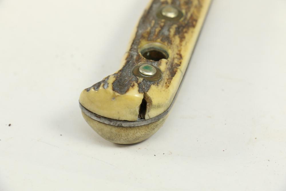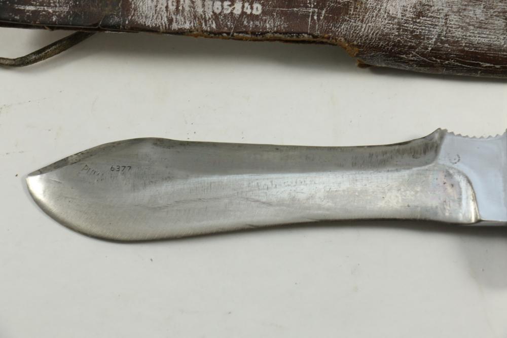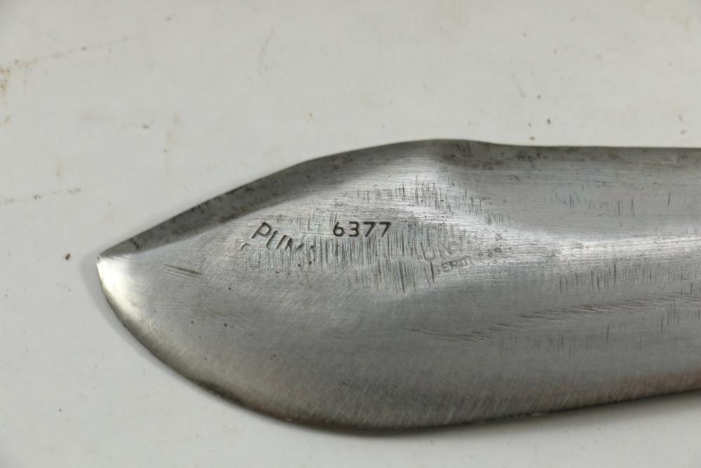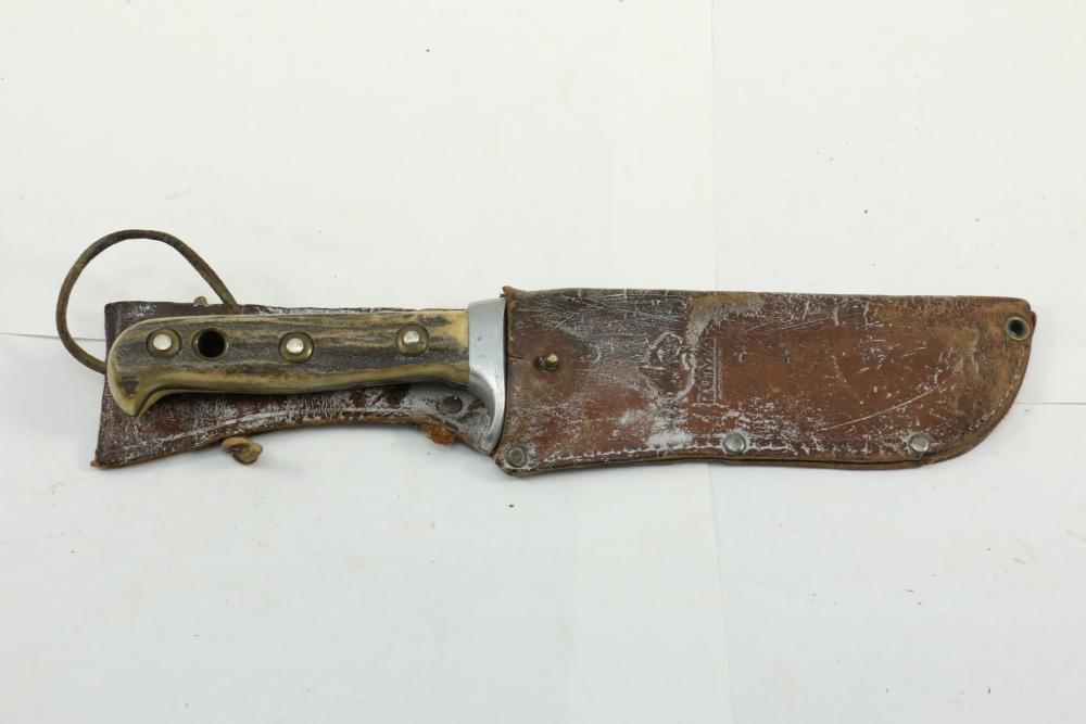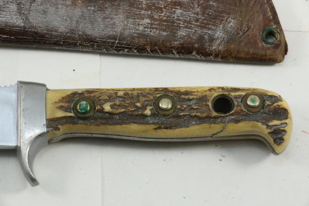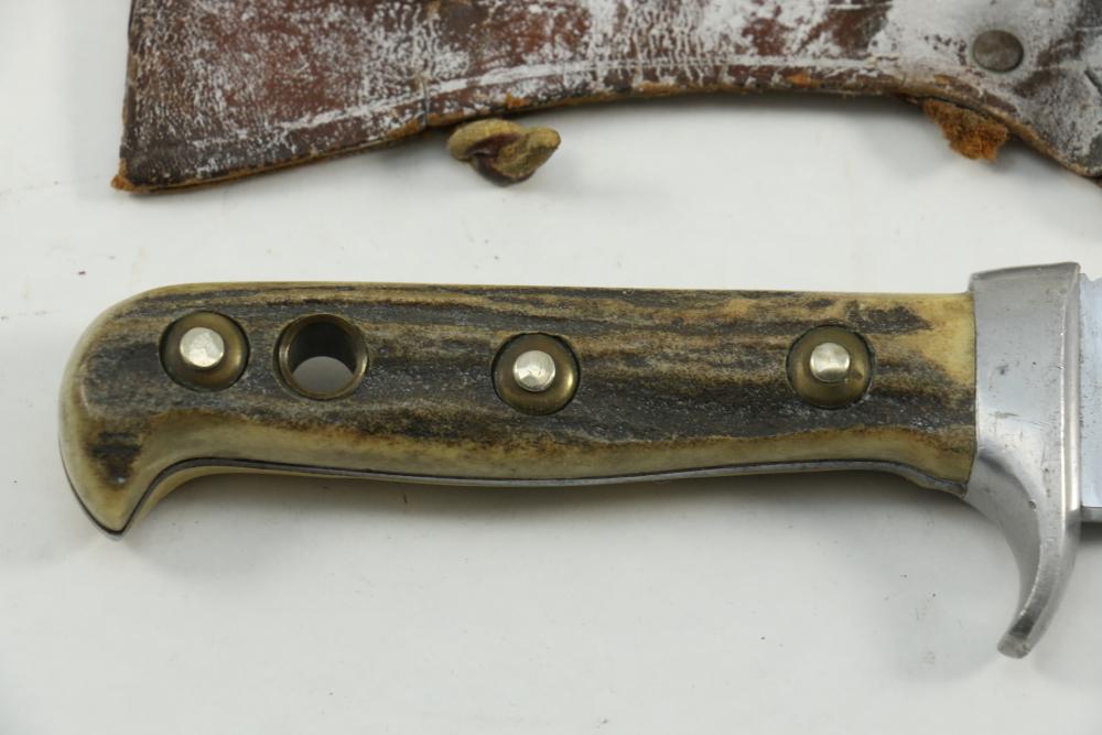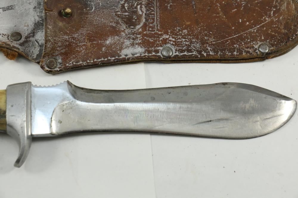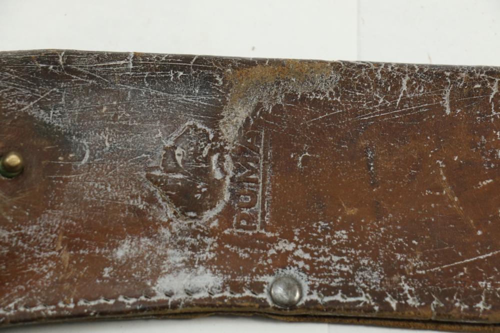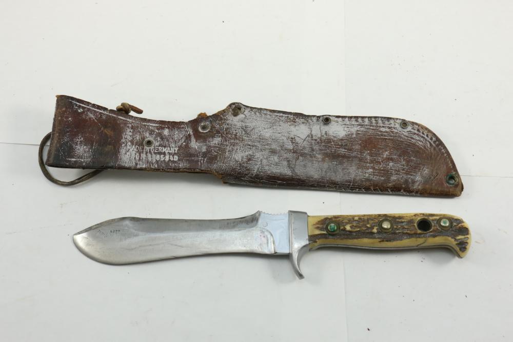 Puma German made hunting knife with leather scabbard with stag horn handle, blade marked "Puma 6377", length of knife without scabbard 10.5".