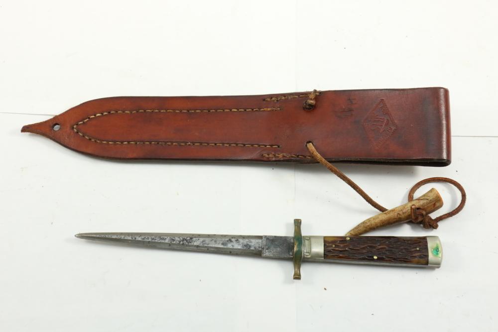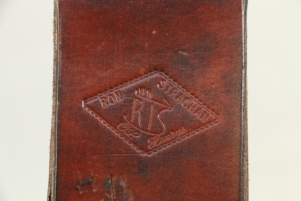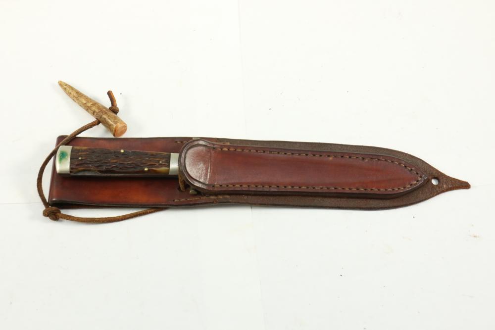 Removable blade knife in scabbard, knife with no visible markings, sheath marked "Ron Strachan OL Kennys" length of knife 9.25"L.