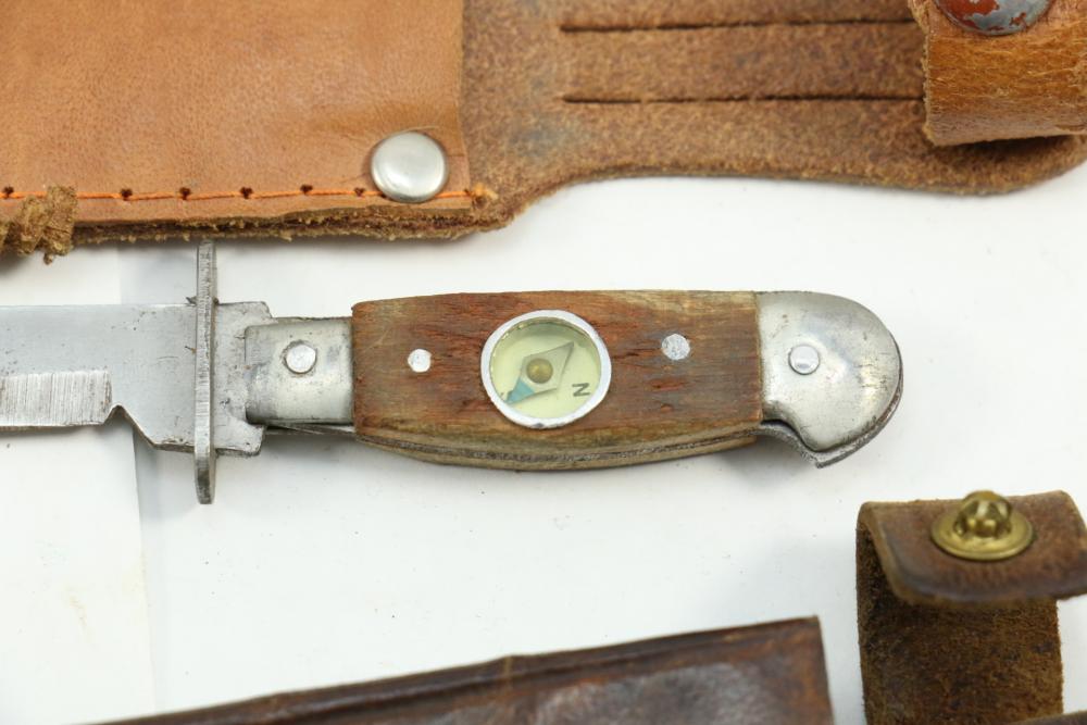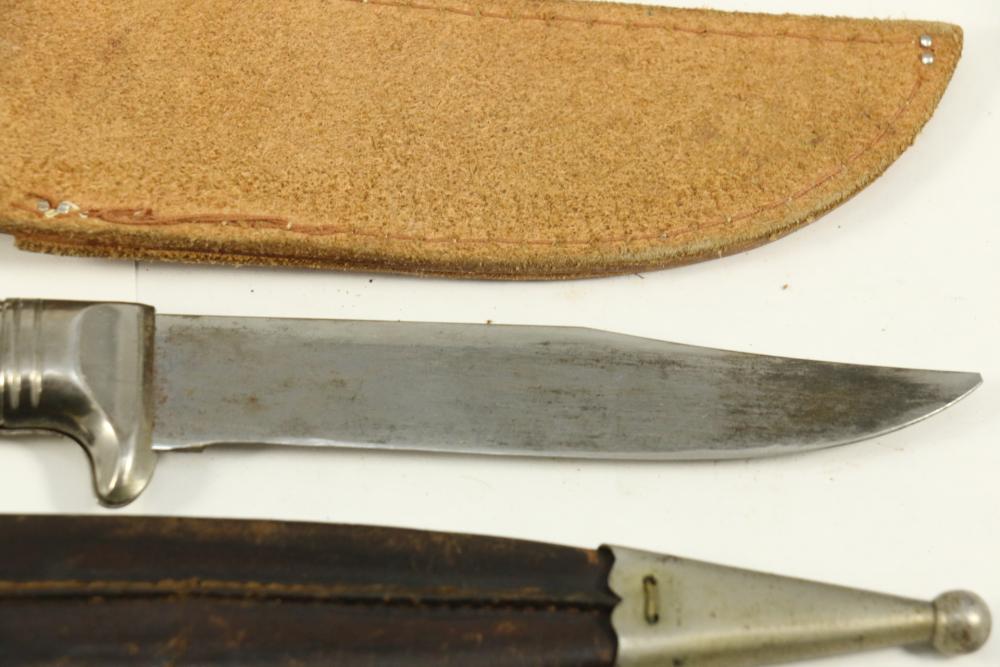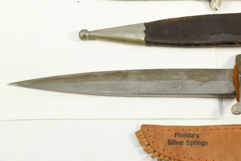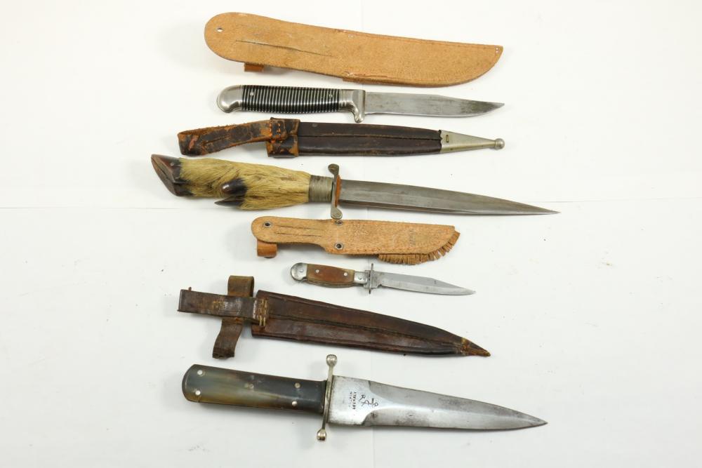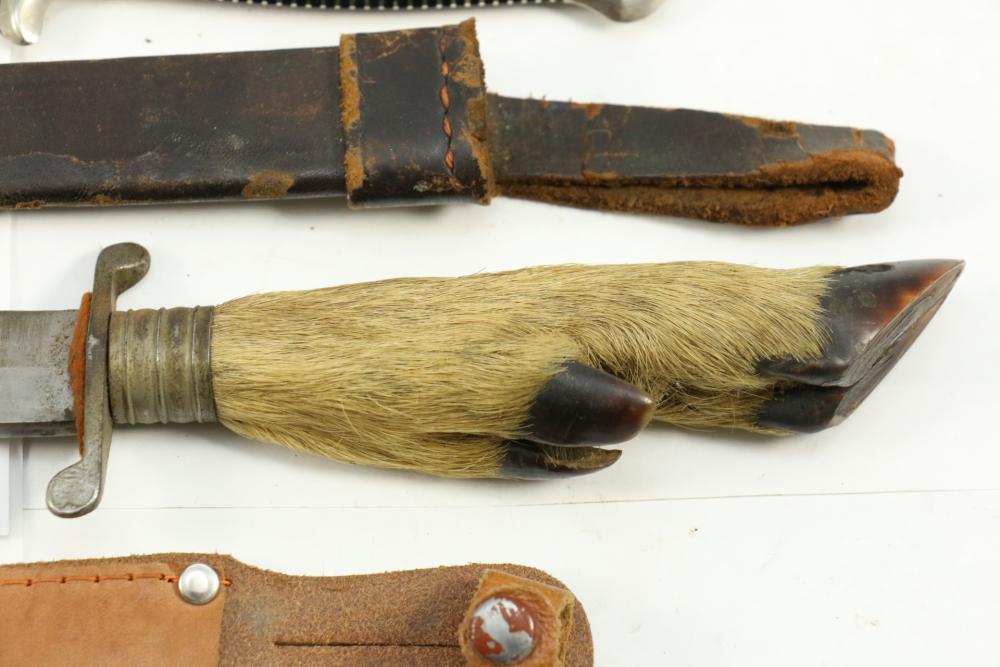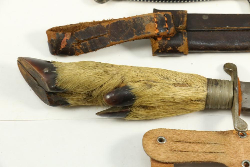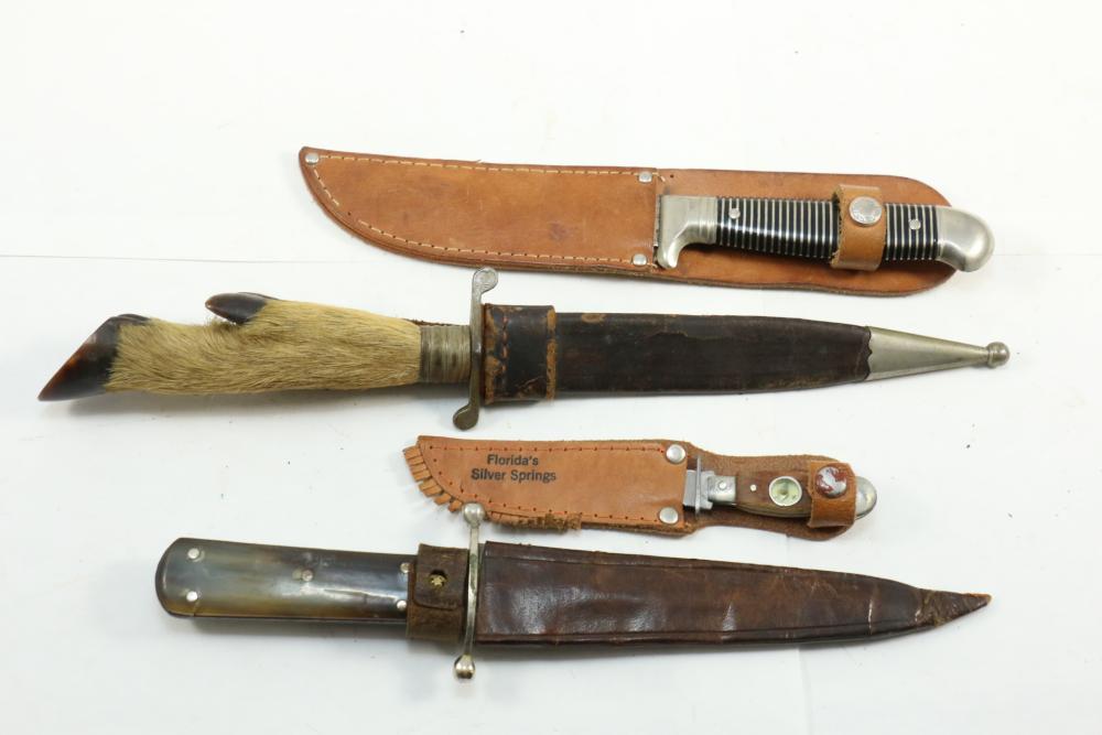 Four hunting knives incl one with celluloid handle marked on blade "Made In Germany" with anchor, reverse with dragon decorated blade, one with stag foot handle having no visible markings, another with markings on ricasso "Imperial Prov RI USA", fourth knife having wood handle marked on ricasso "P.C. Japan", all having scabbards, overall length without scabbard largest being 11"L, shortest measuring 4.75"L.