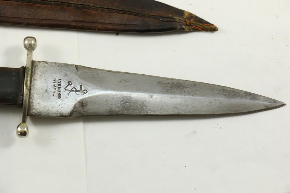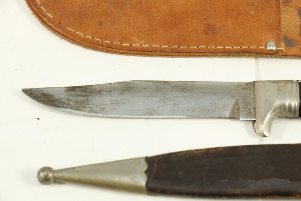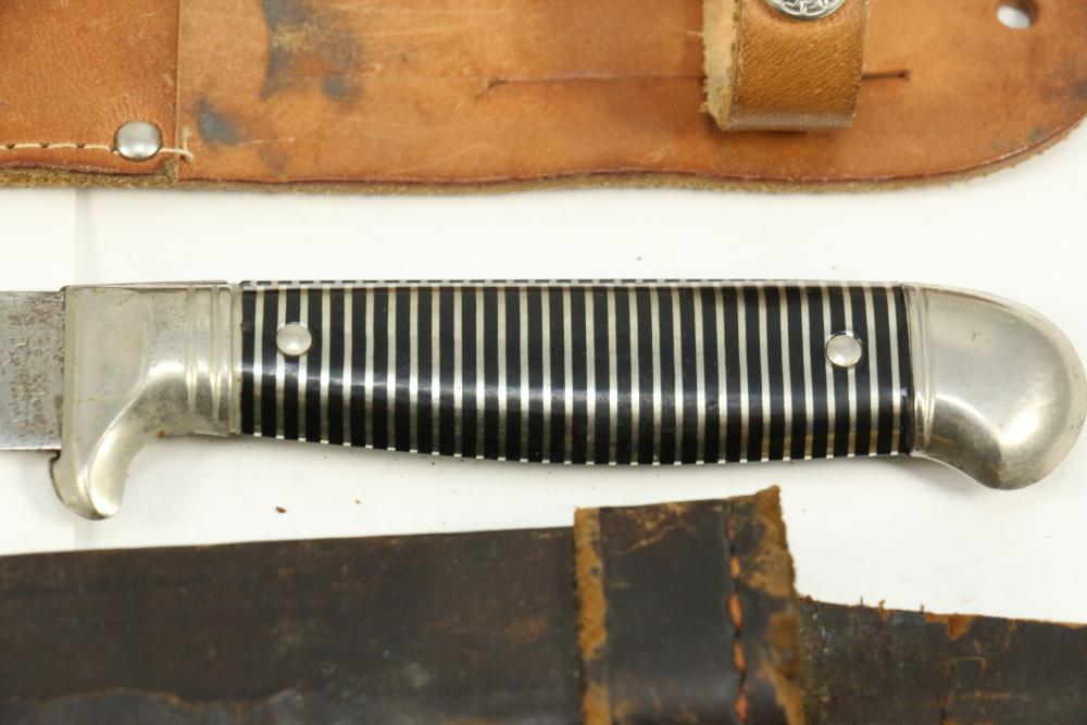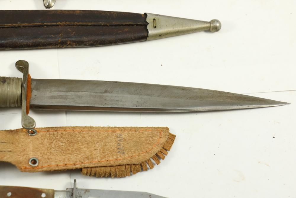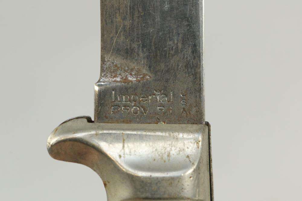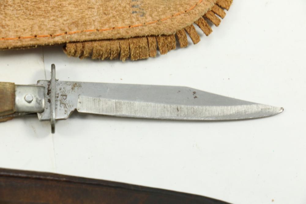 Four hunting knives incl one with celluloid handle marked on blade "Made In Germany" with anchor, reverse with dragon decorated blade, one with stag foot handle having no visible markings, another with markings on ricasso "Imperial Prov RI USA", fourth knife having wood handle marked on ricasso "P.C. Japan", all having scabbards, overall length without scabbard largest being 11"L, shortest measuring 4.75"L.