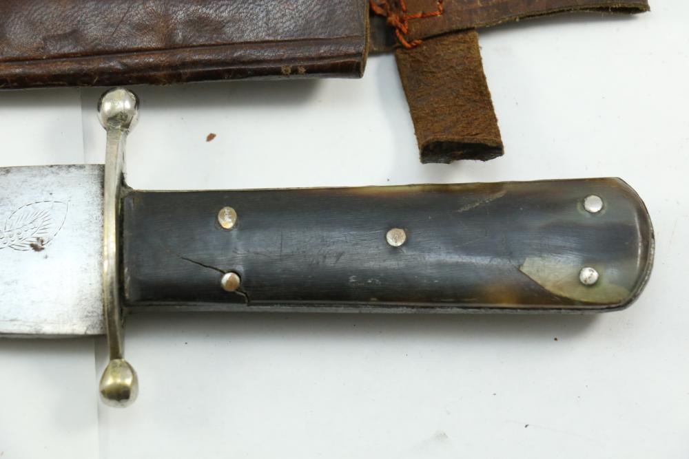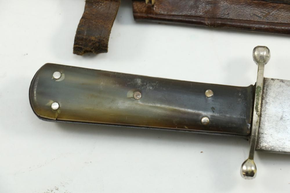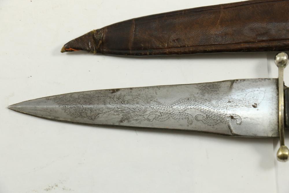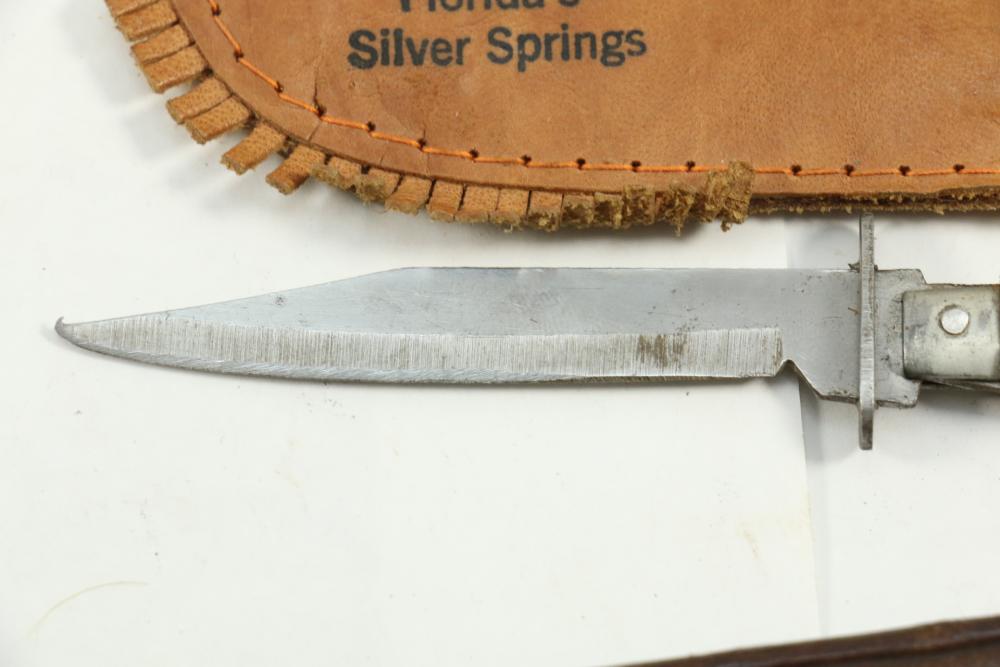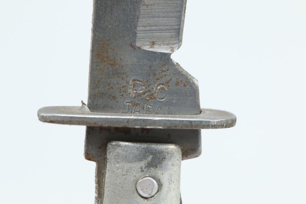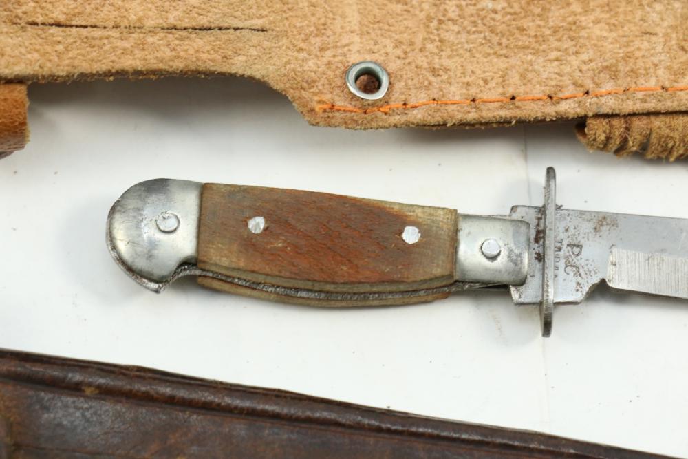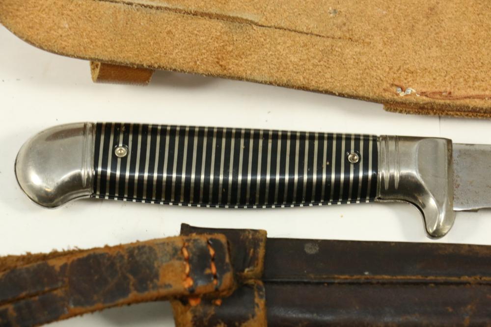 Four hunting knives incl one with celluloid handle marked on blade "Made In Germany" with anchor, reverse with dragon decorated blade, one with stag foot handle having no visible markings, another with markings on ricasso "Imperial Prov RI USA", fourth knife having wood handle marked on ricasso "P.C. Japan", all having scabbards, overall length without scabbard largest being 11"L, shortest measuring 4.75"L.