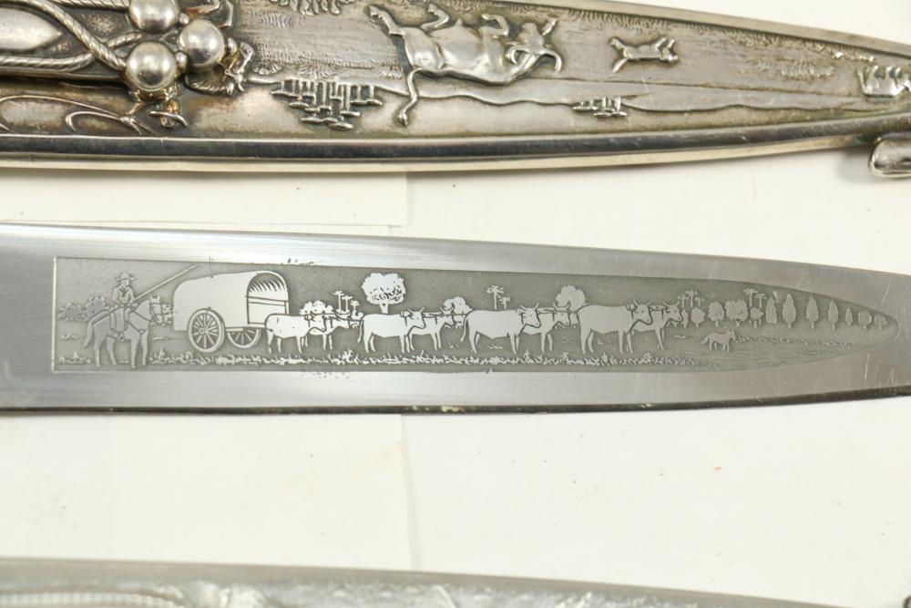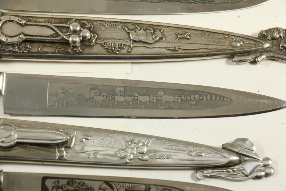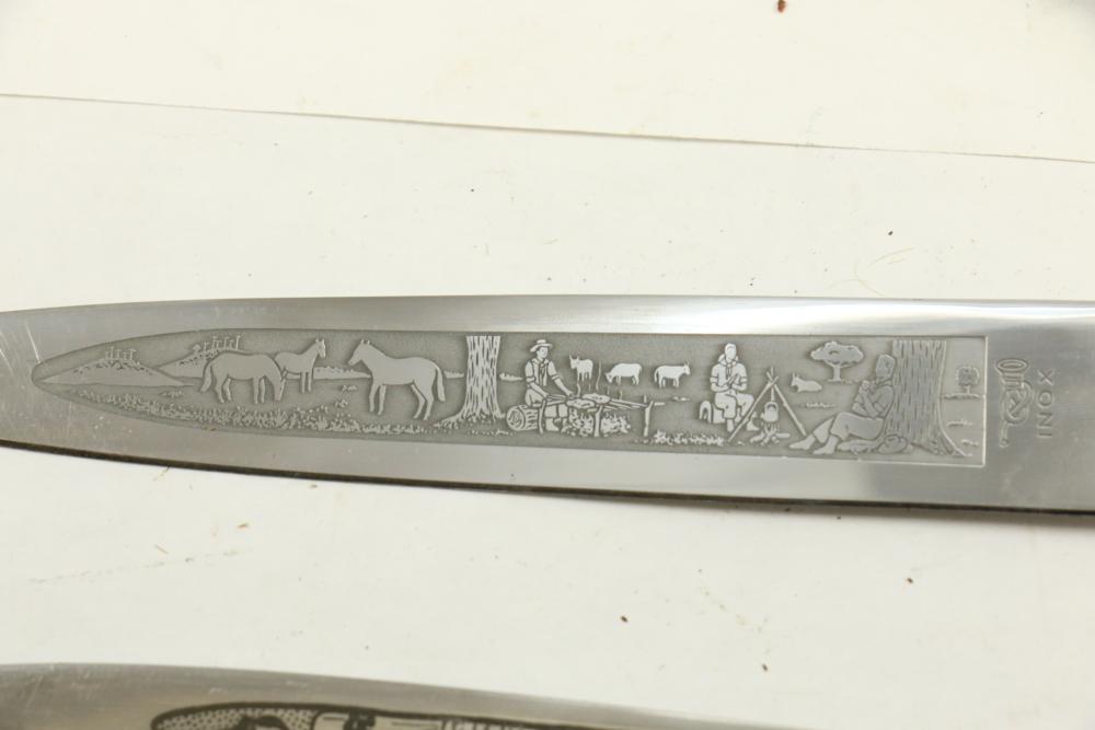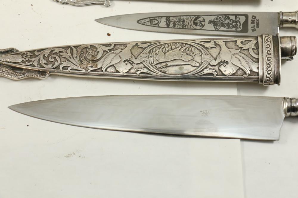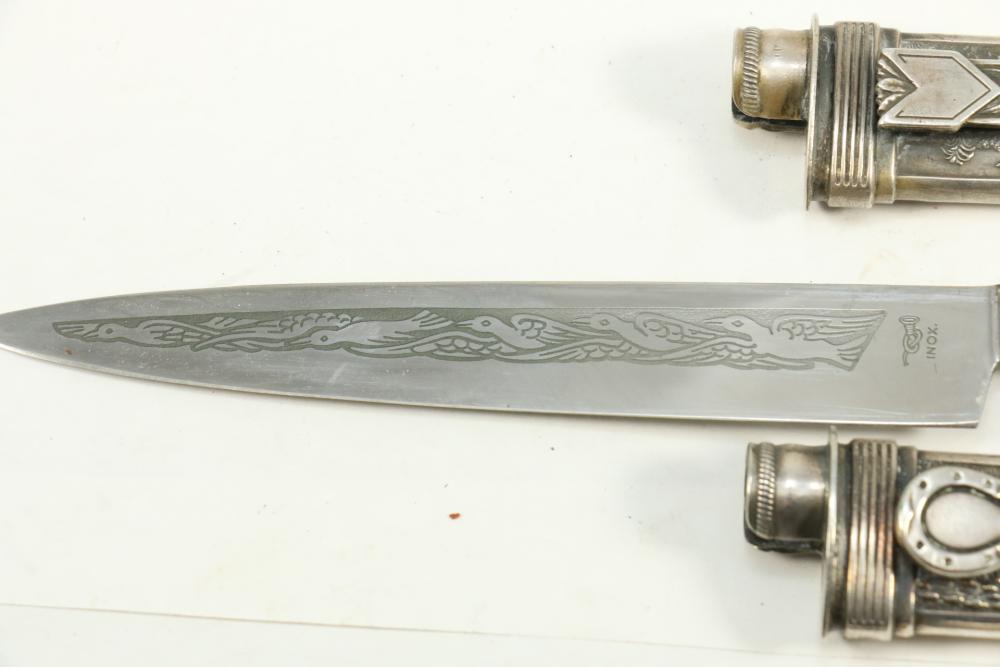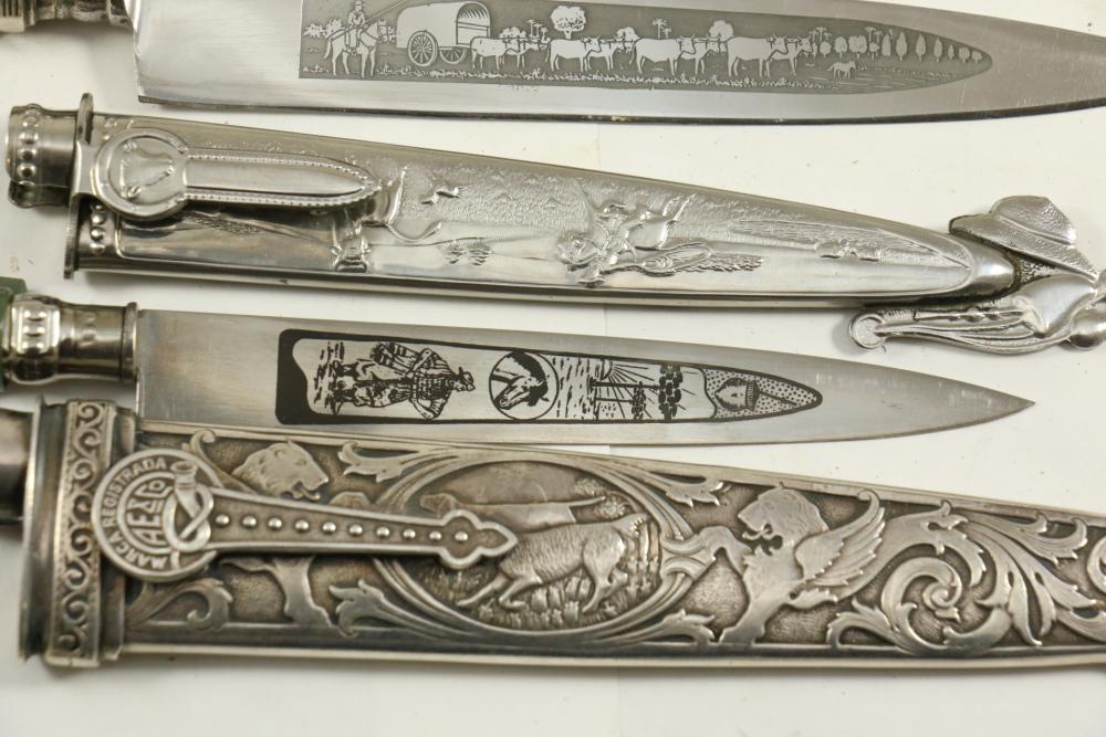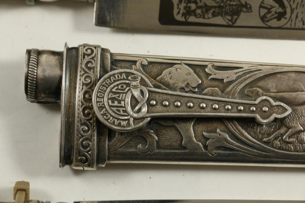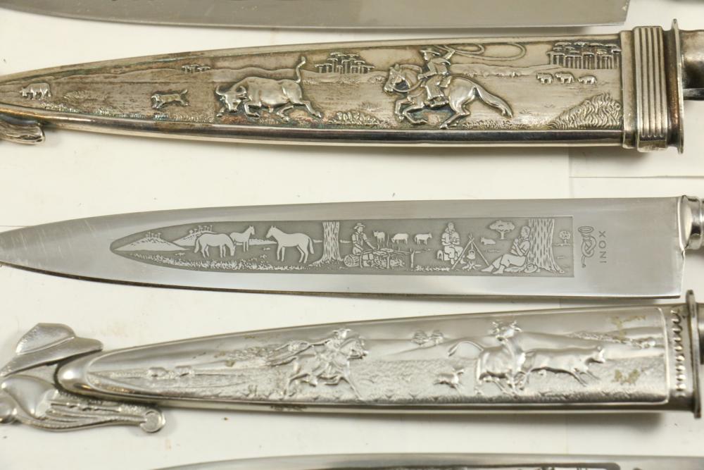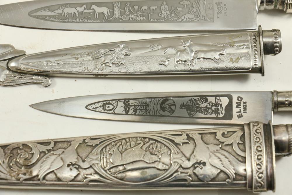 Four Inox boot knives in sheaths varying in size incl larger 11.5"L marked on blade "Inox" and on sheath "Marca Registrada AE&Co", two medium 10-1/8" both having engraving on blades, smallest 8-3/8" with blade marked "Elmo Inox" and decorative design, all having very detailed handles to match detailed sheaths.