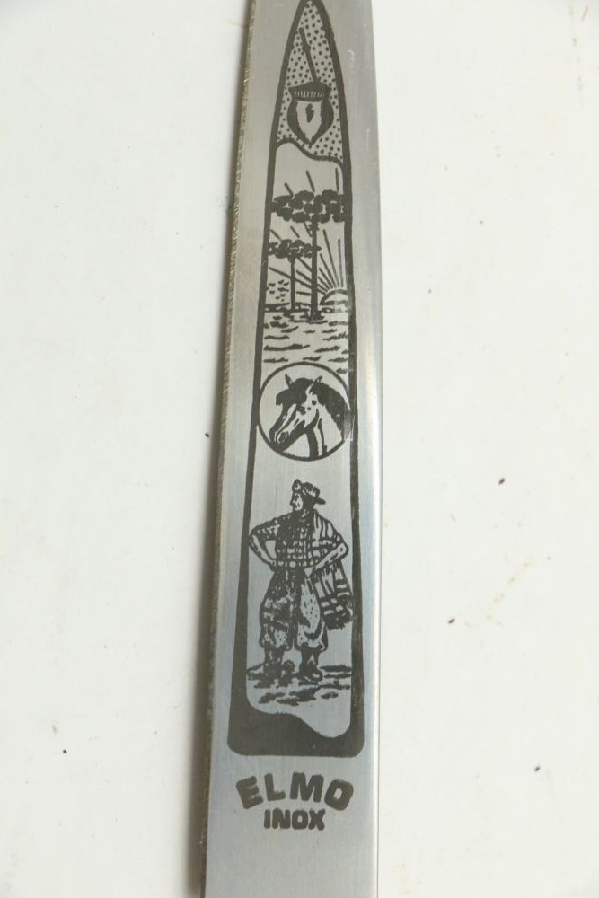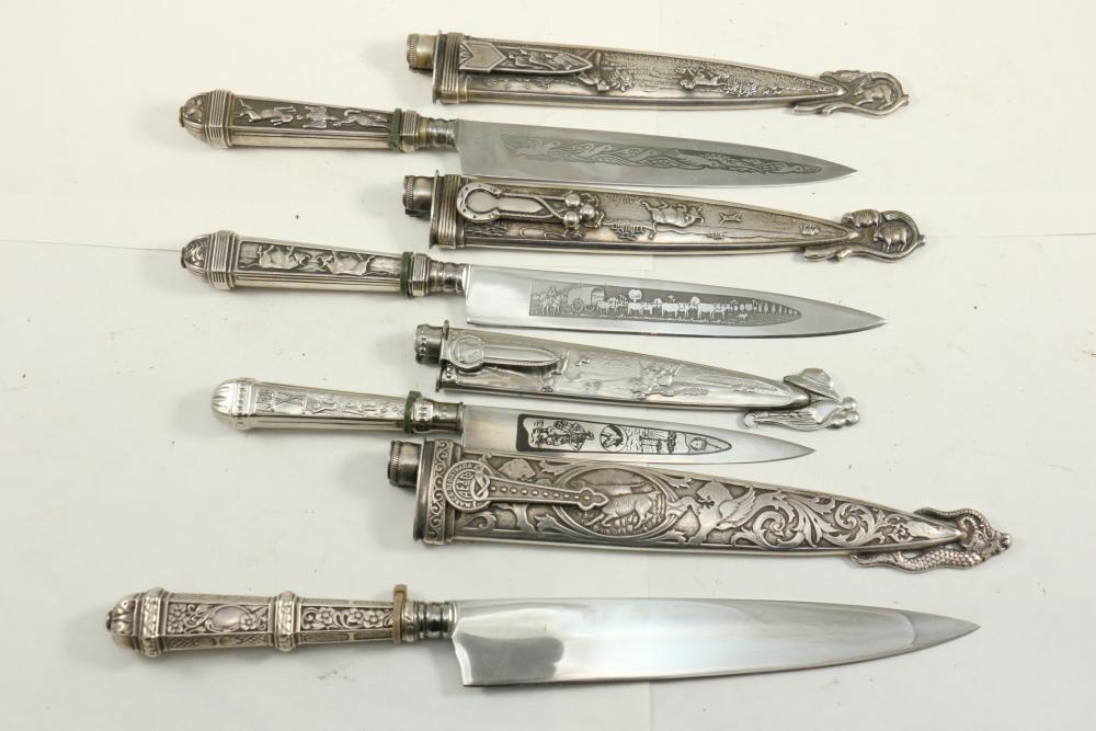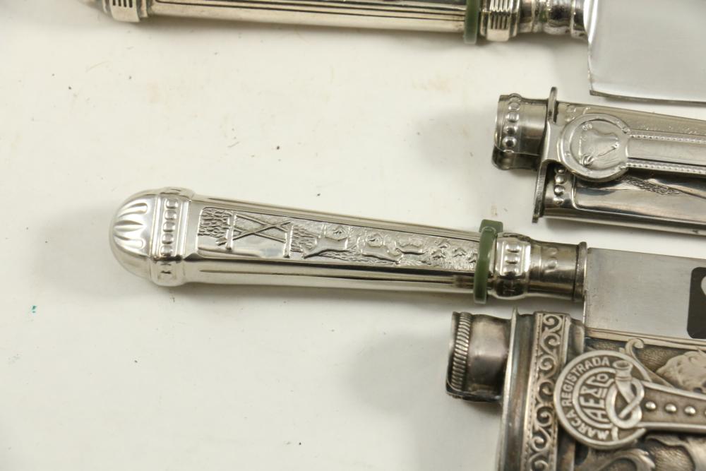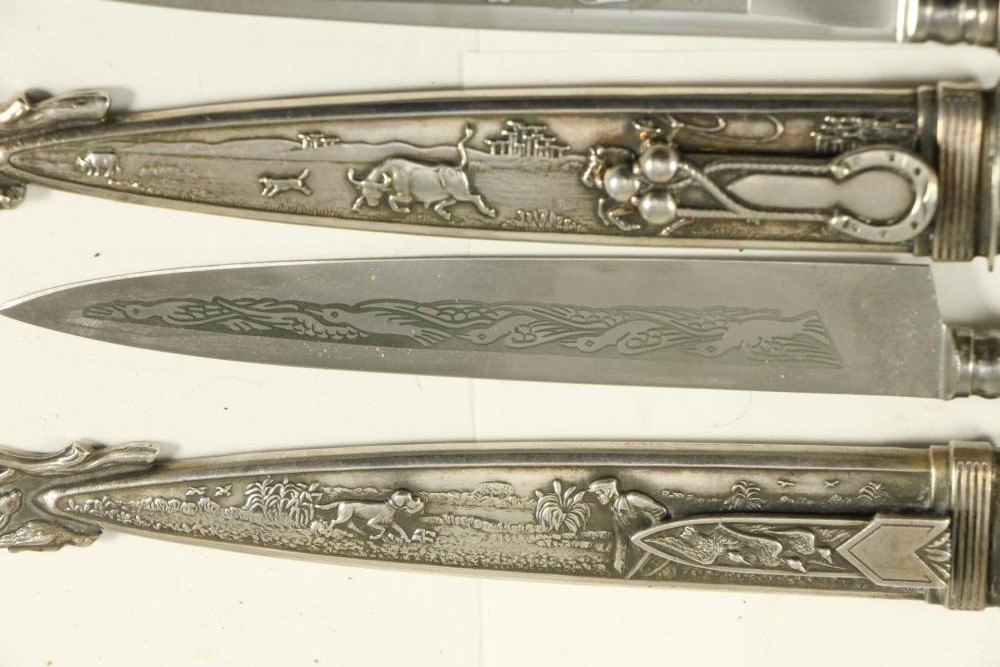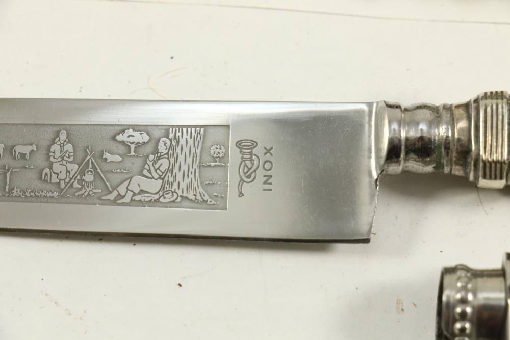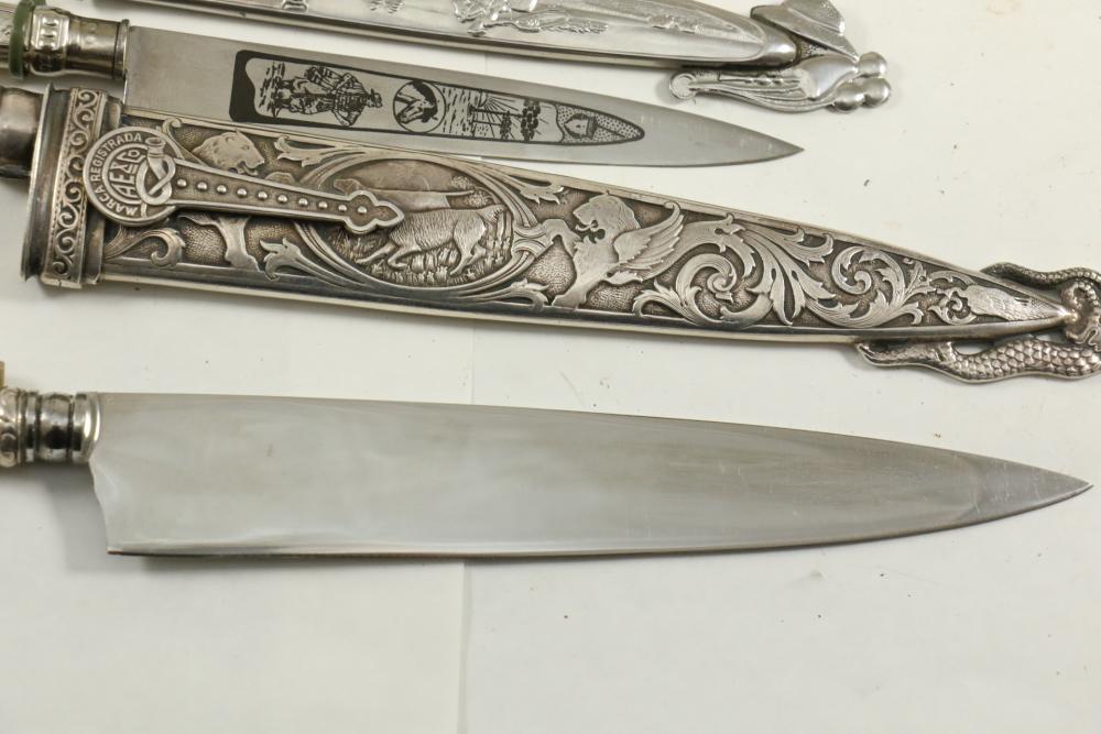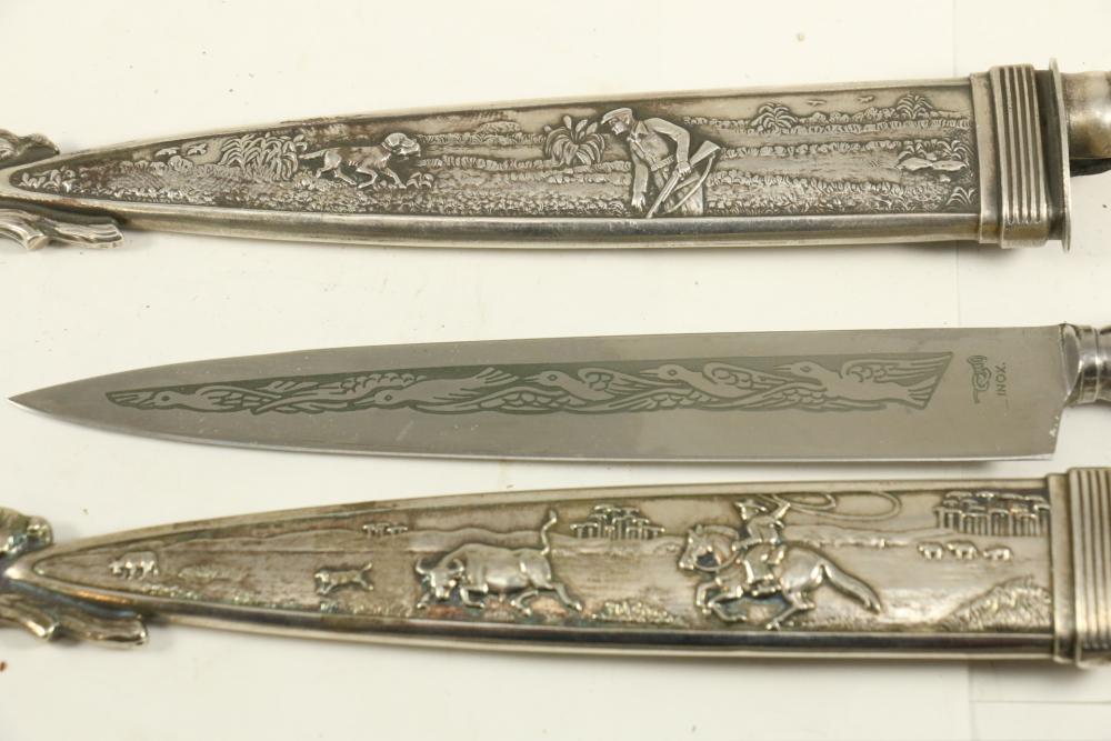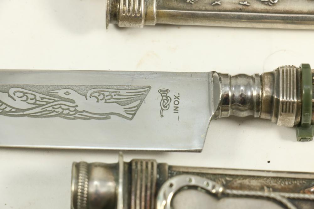 Four Inox boot knives in sheaths varying in size incl larger 11.5"L marked on blade "Inox" and on sheath "Marca Registrada AE&Co", two medium 10-1/8" both having engraving on blades, smallest 8-3/8" with blade marked "Elmo Inox" and decorative design, all having very detailed handles to match detailed sheaths.