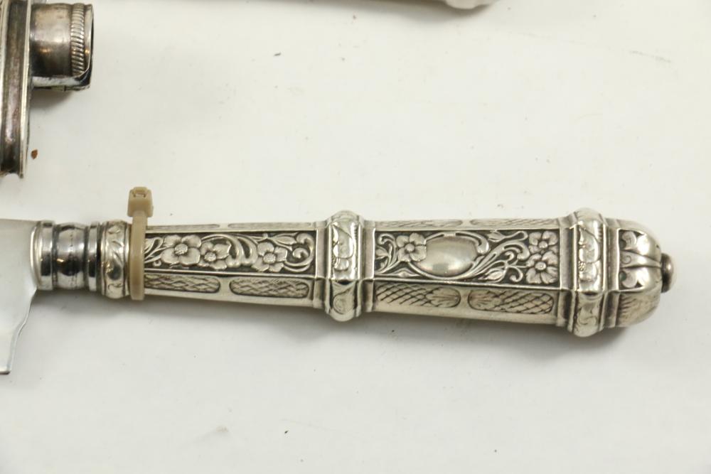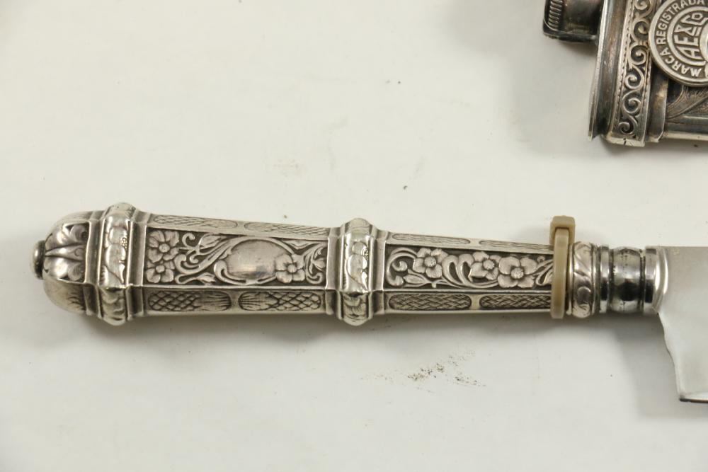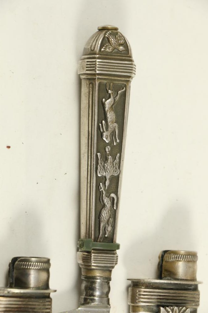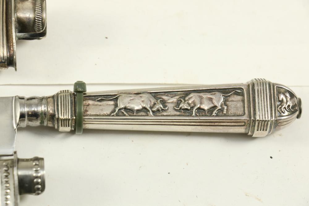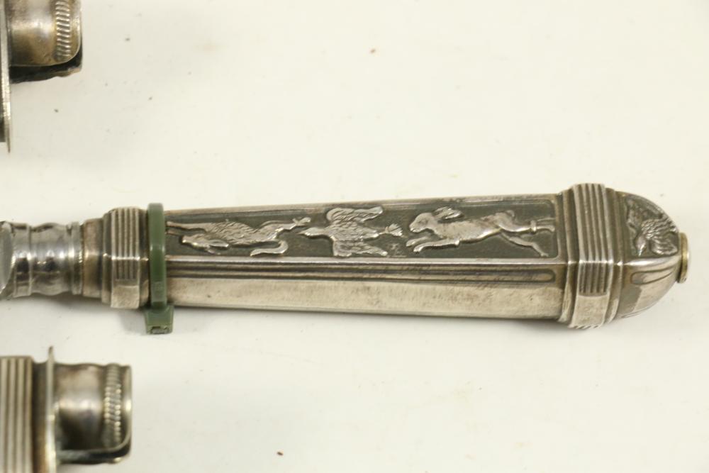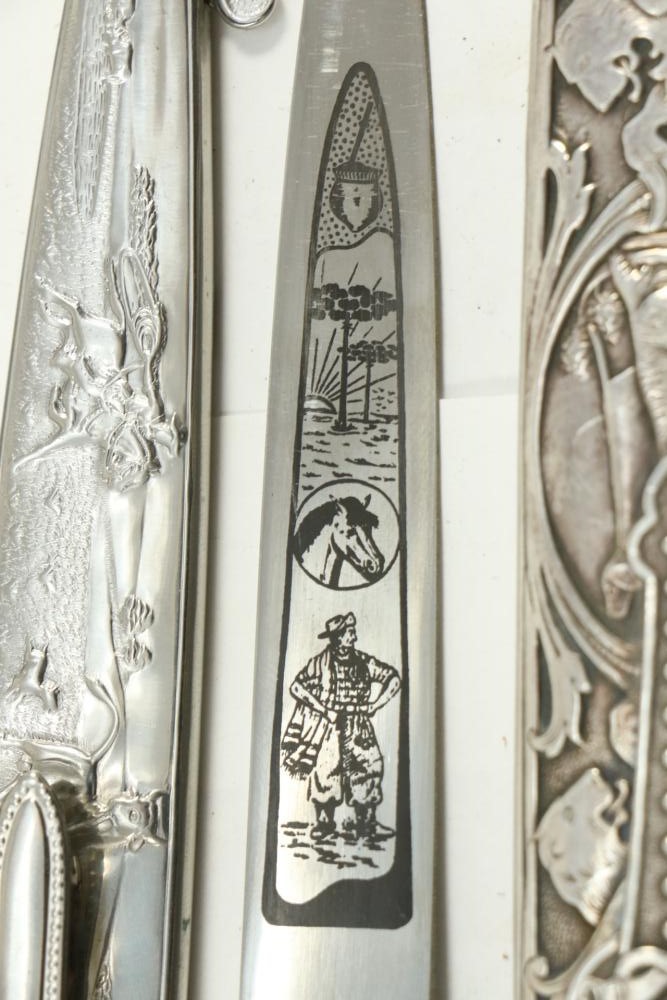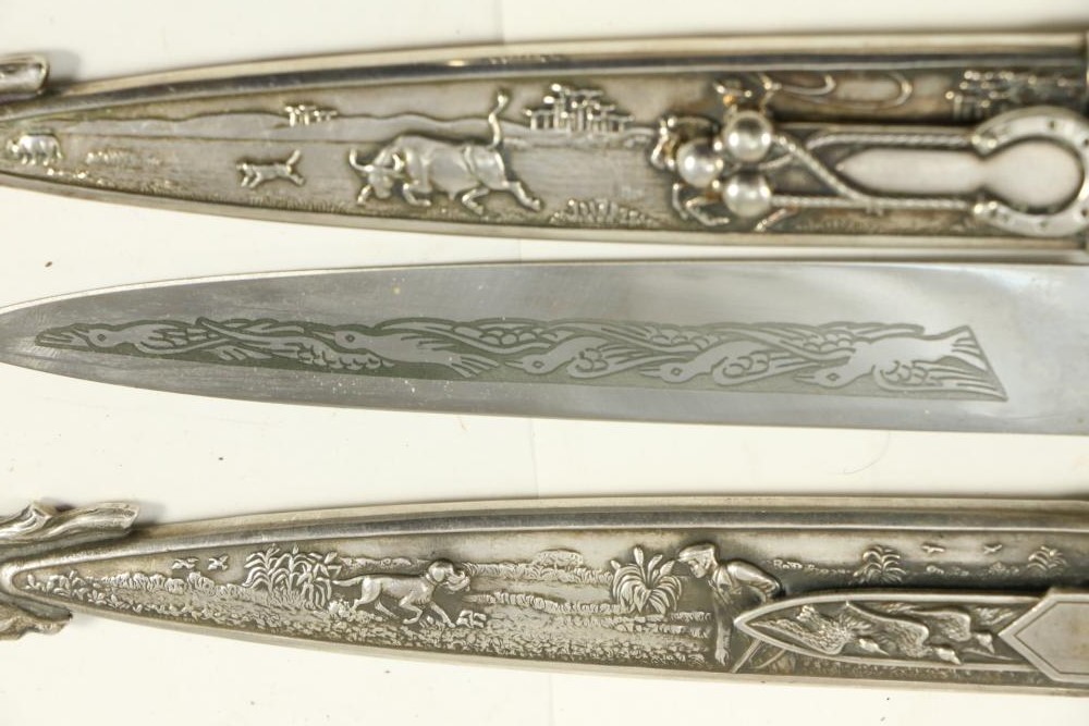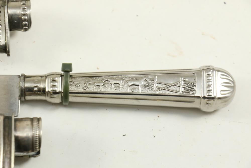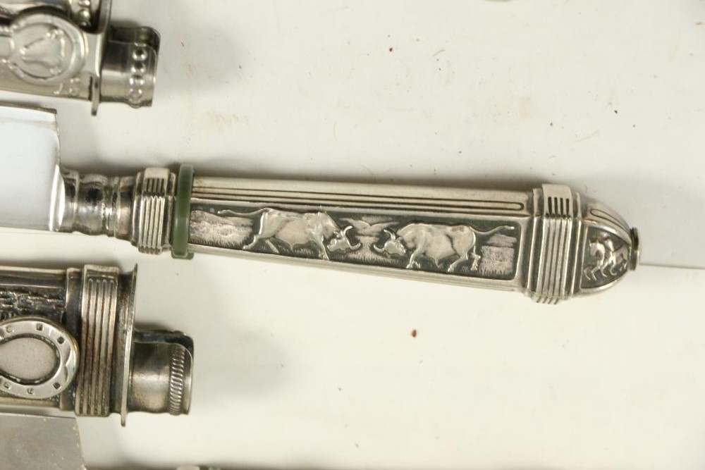 Four Inox boot knives in sheaths varying in size incl larger 11.5"L marked on blade "Inox" and on sheath "Marca Registrada AE&Co", two medium 10-1/8" both having engraving on blades, smallest 8-3/8" with blade marked "Elmo Inox" and decorative design, all having very detailed handles to match detailed sheaths.