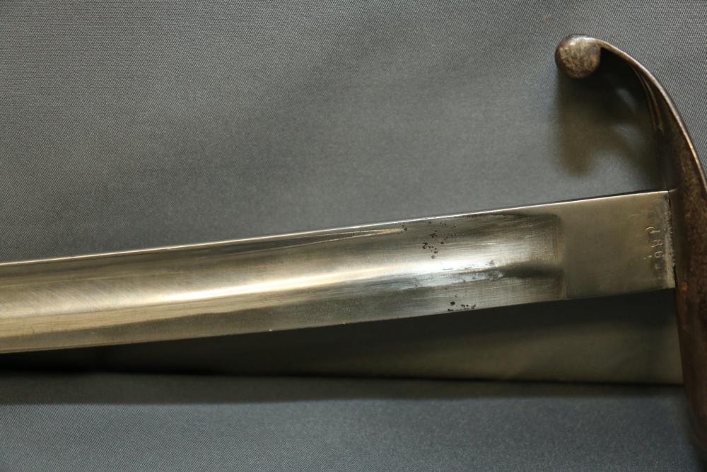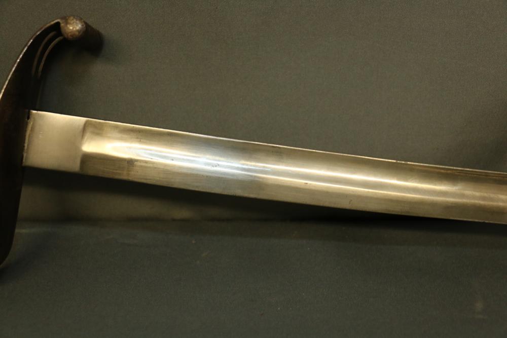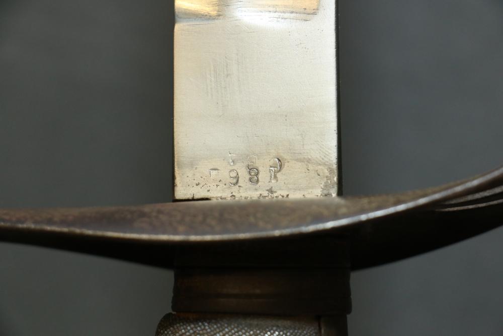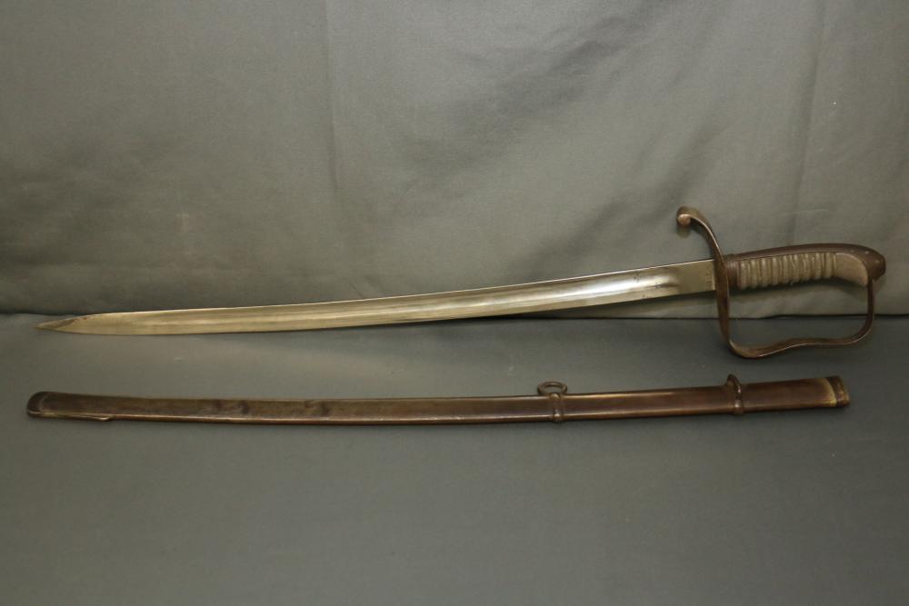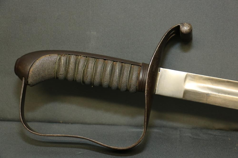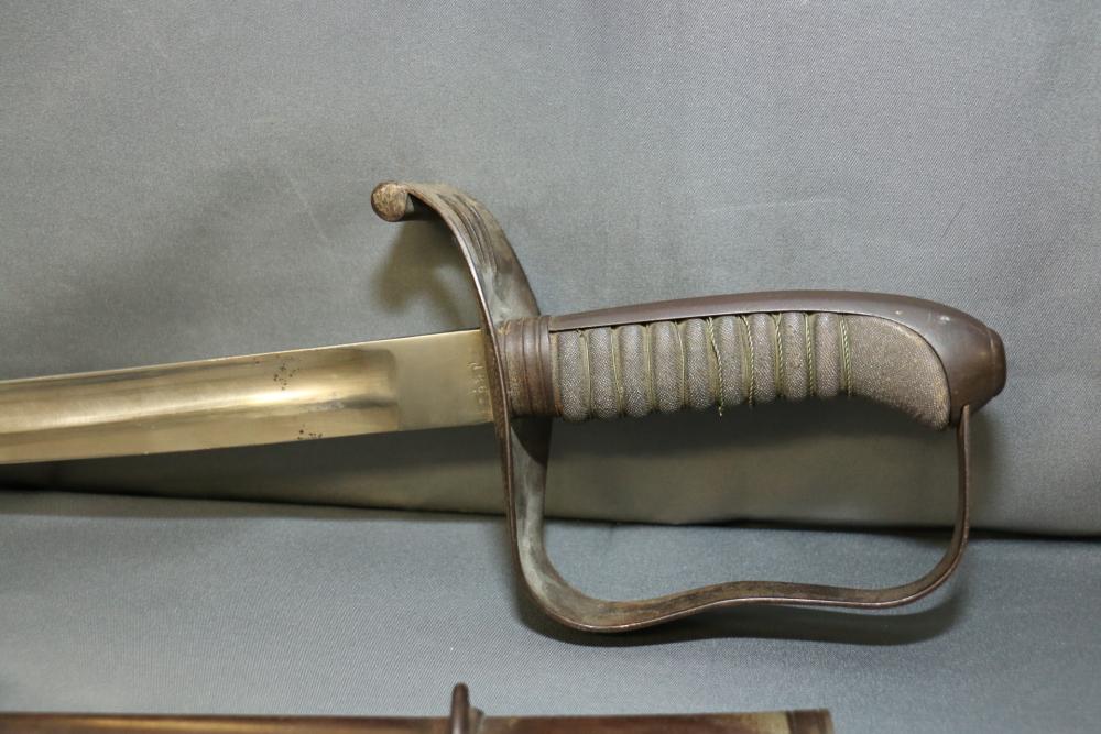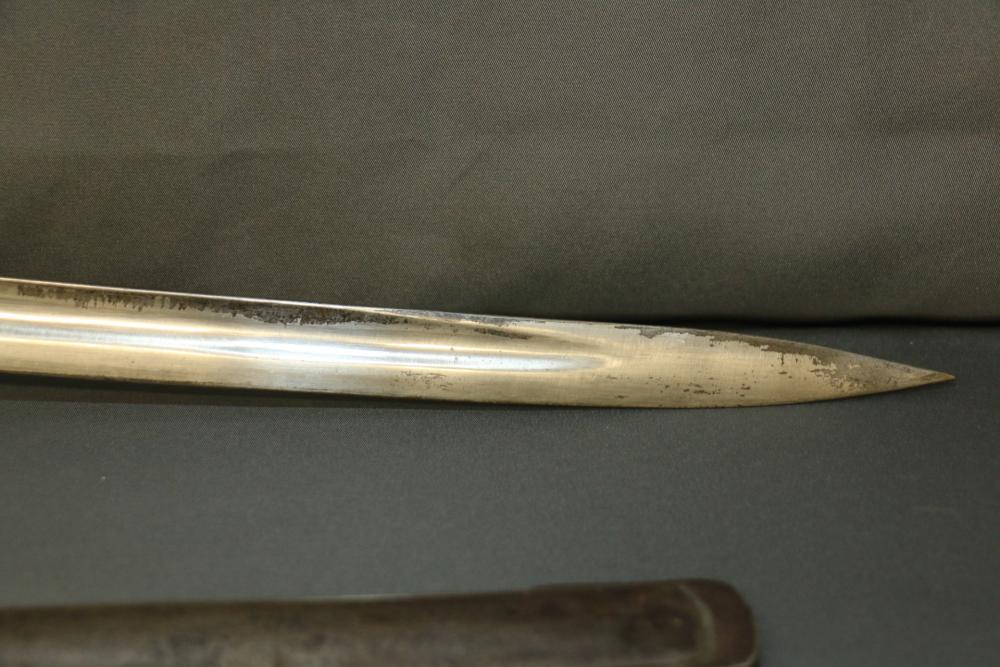 Short sword in scabbard with only visible markings on ricasso appearing to read "186 CBA" reverse marked with only visible lettering possibly being a "U", handle having wire wrap over imitation ray skin, single deep fuller on both sides of blade, measurements without scabbard: length of blade 23.75"L cross guard to pommel 5.5"L total length approx 29.5"L.