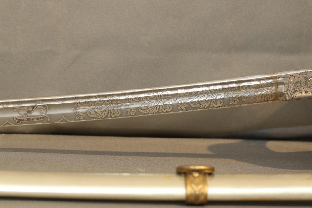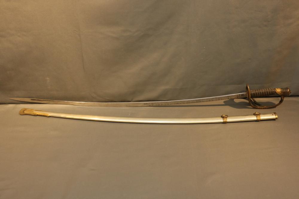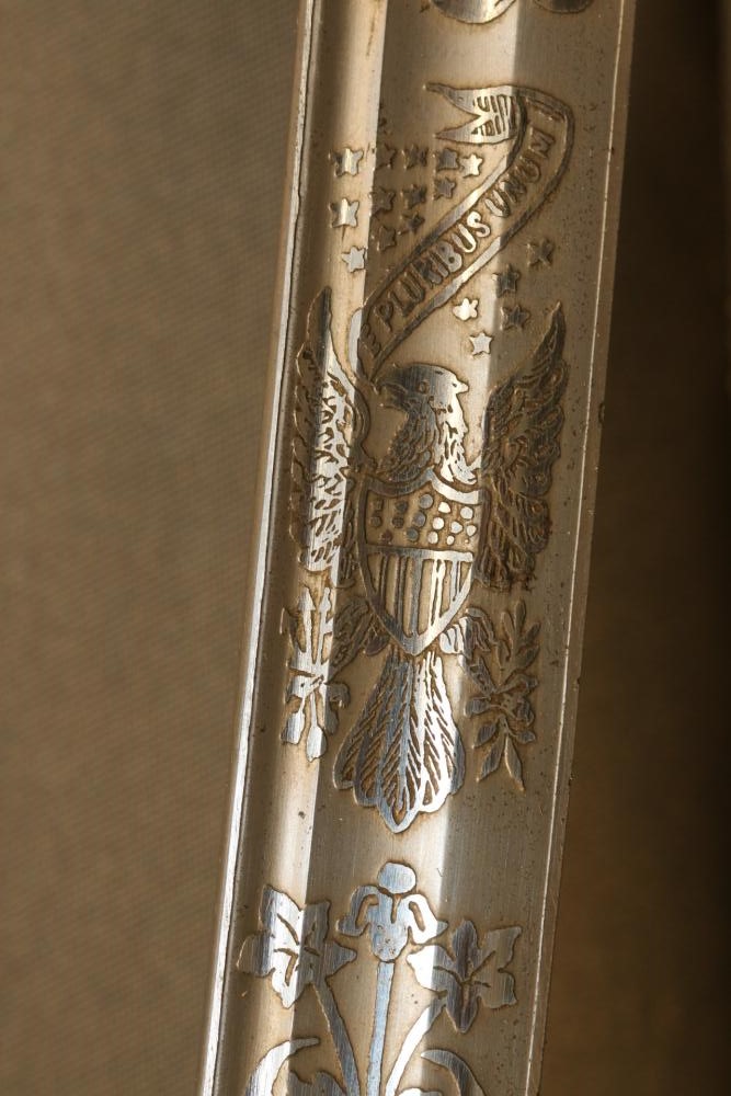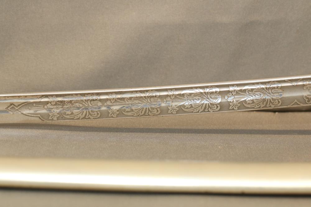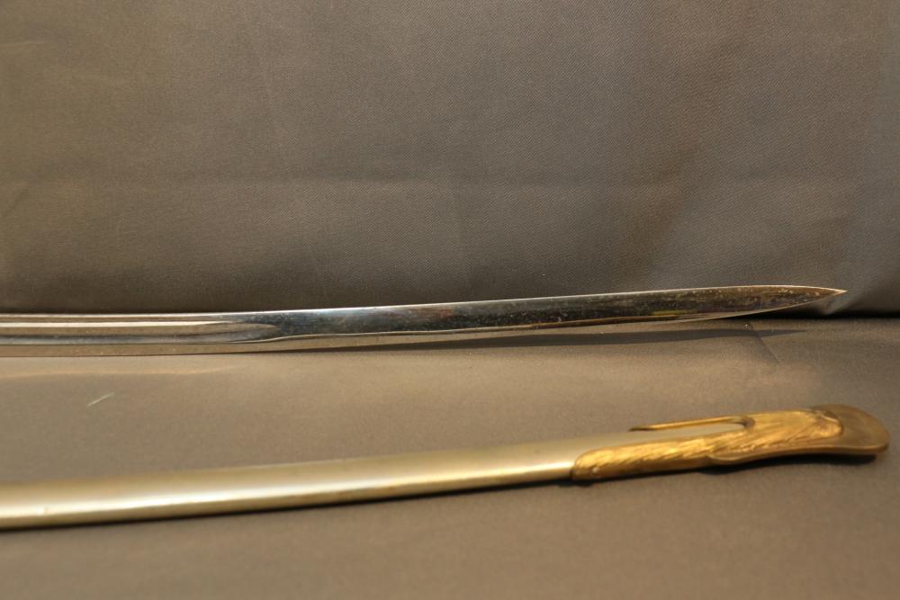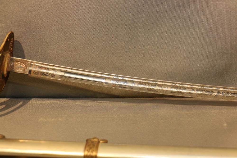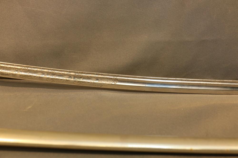 Believed to be cavalry dress sword in scabbard marked at ricasso "Made in France", also stamped with makers mark "P B D" reverse marked "Ridabock & Co New-York", etched blade with floral motif one side with "US", reverse with "E. Pluribus Unum" eagle with shield, measurements without scabbard: length of blade 34"L guard to pommel 6"L, total length 40"L.