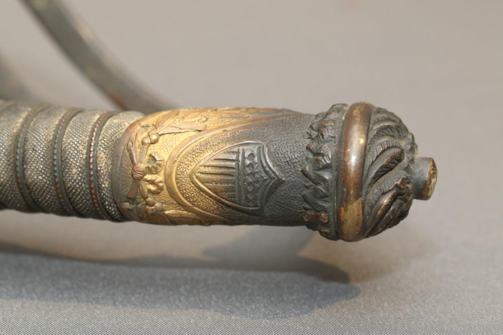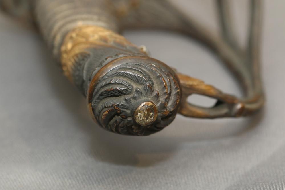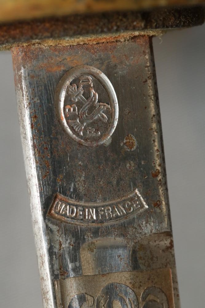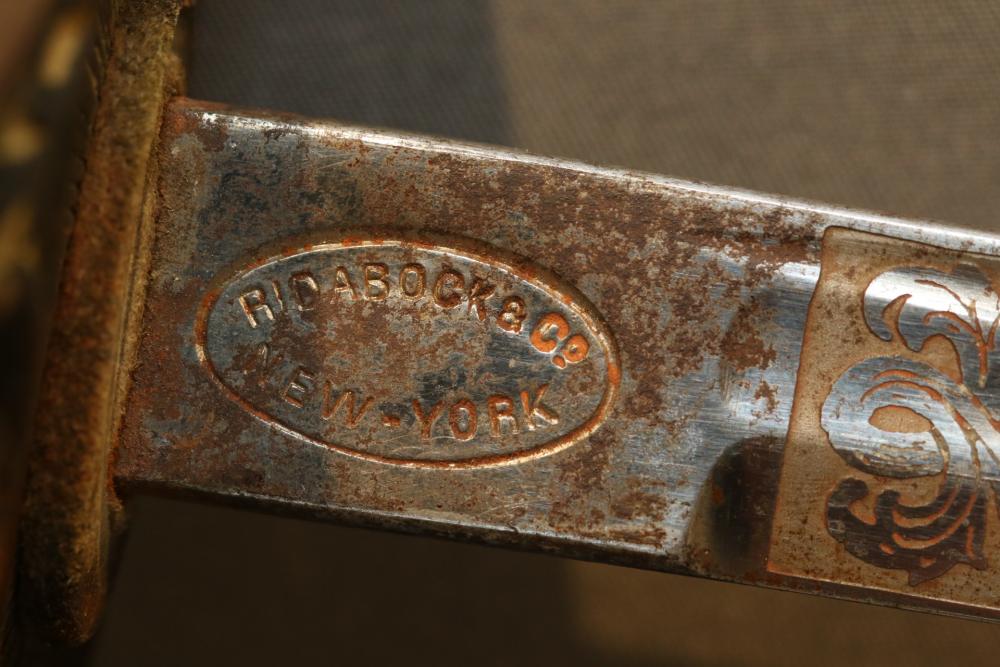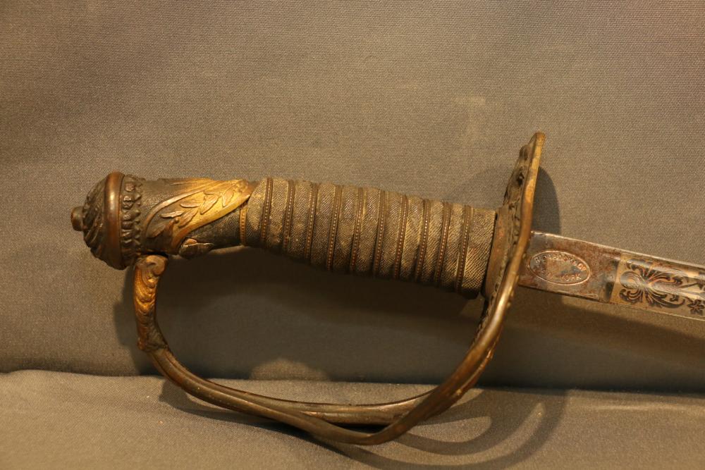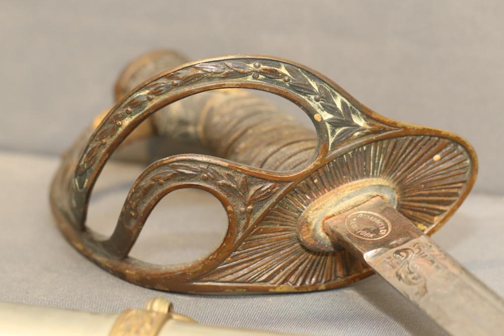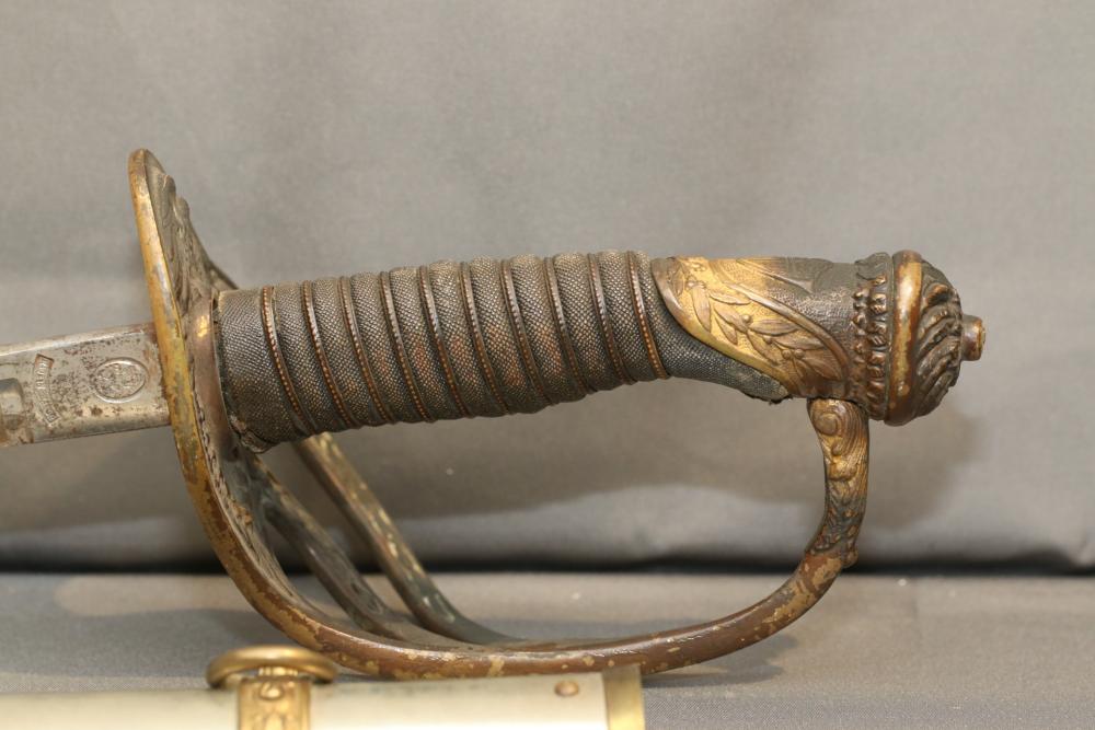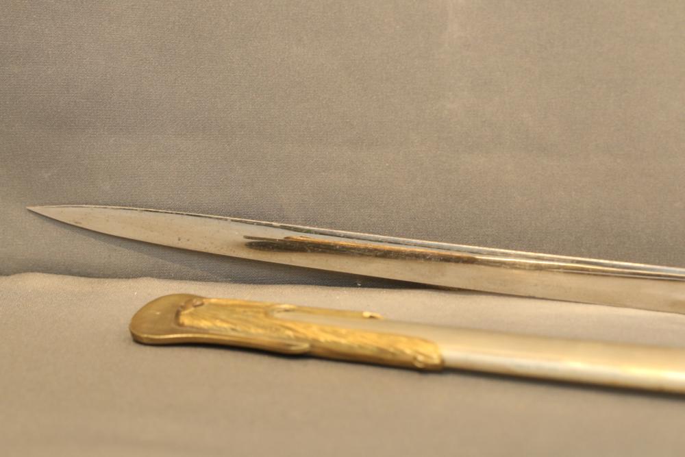 Believed to be cavalry dress sword in scabbard marked at ricasso "Made in France", also stamped with makers mark "P B D" reverse marked "Ridabock & Co New-York", etched blade with floral motif one side with "US", reverse with "E. Pluribus Unum" eagle with shield, measurements without scabbard: length of blade 34"L guard to pommel 6"L, total length 40"L.