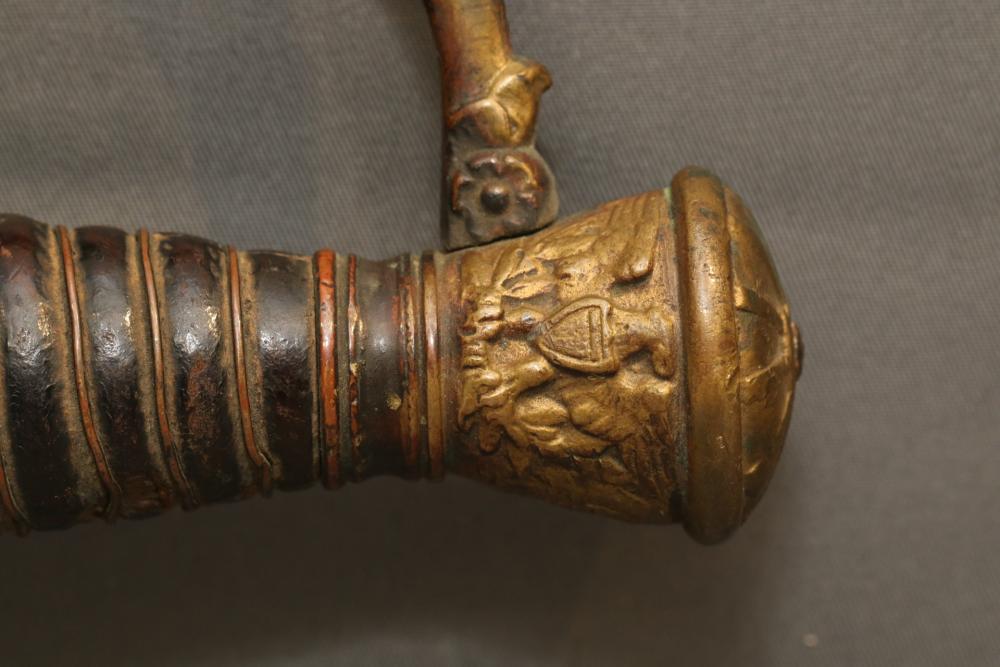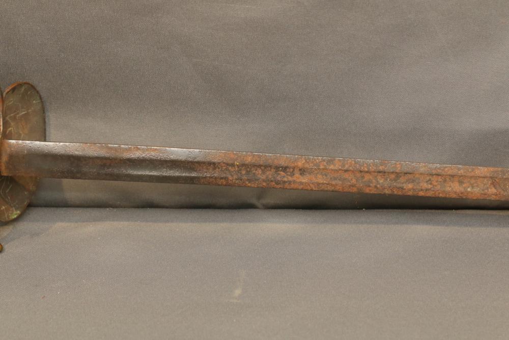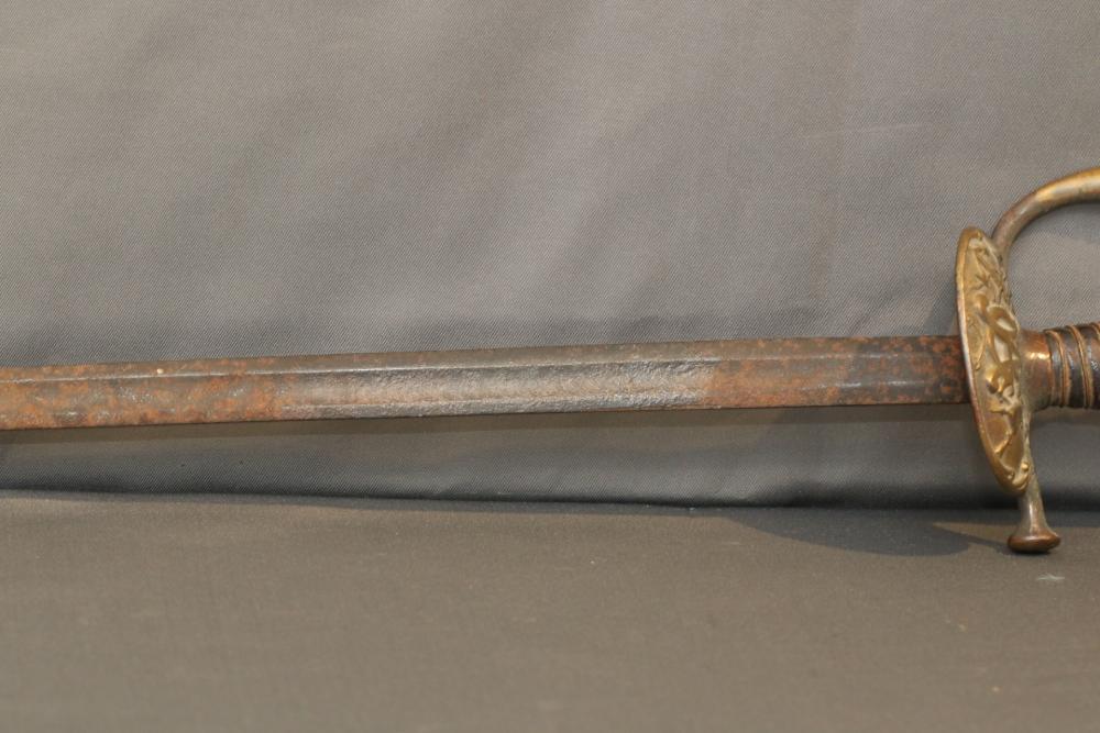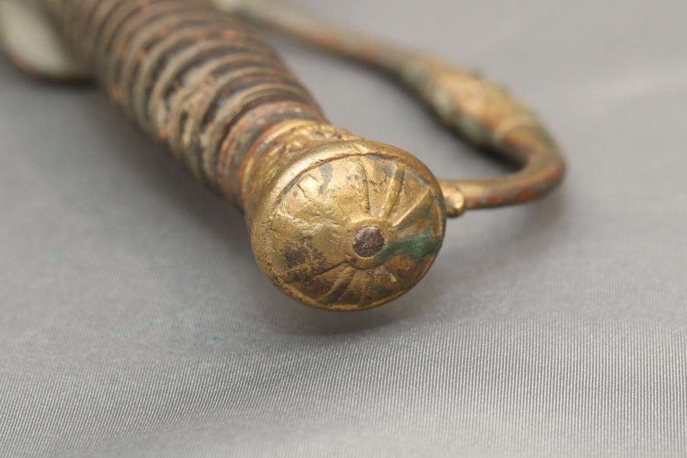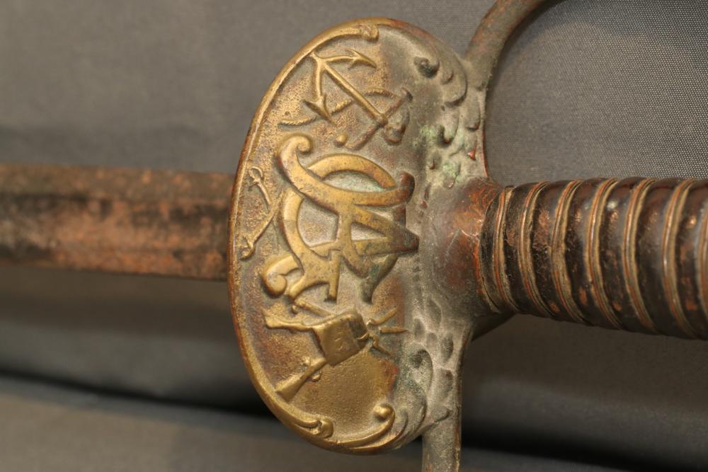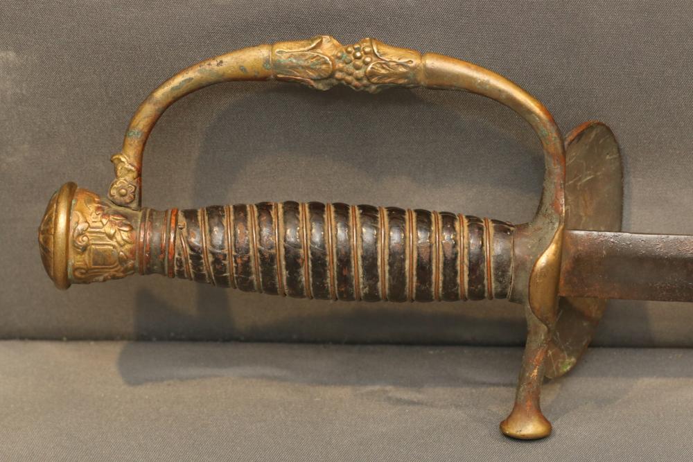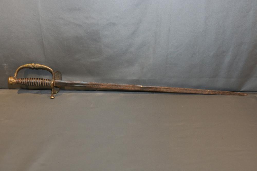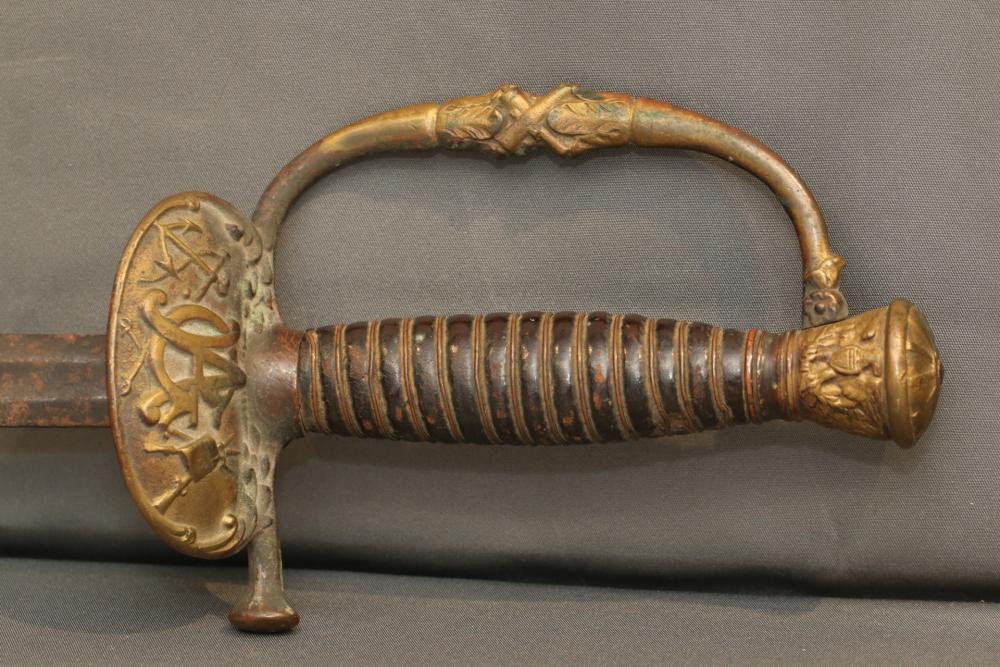 US Staff and field style sword with wire wrapped handle, brass guard and pommel "RGA" on cross guard, pommel with eagle and shield decoration, no visible makers marks, blade measuring 26-1/8"", cross guard to pommel measuring 6.5L", total length 32.25"L.