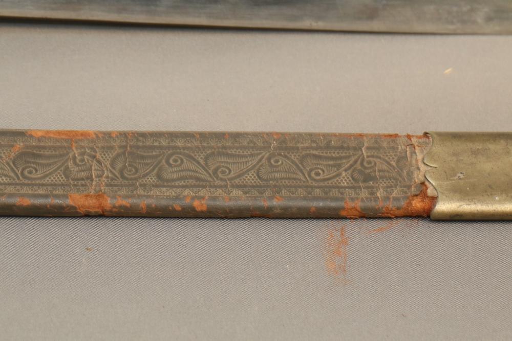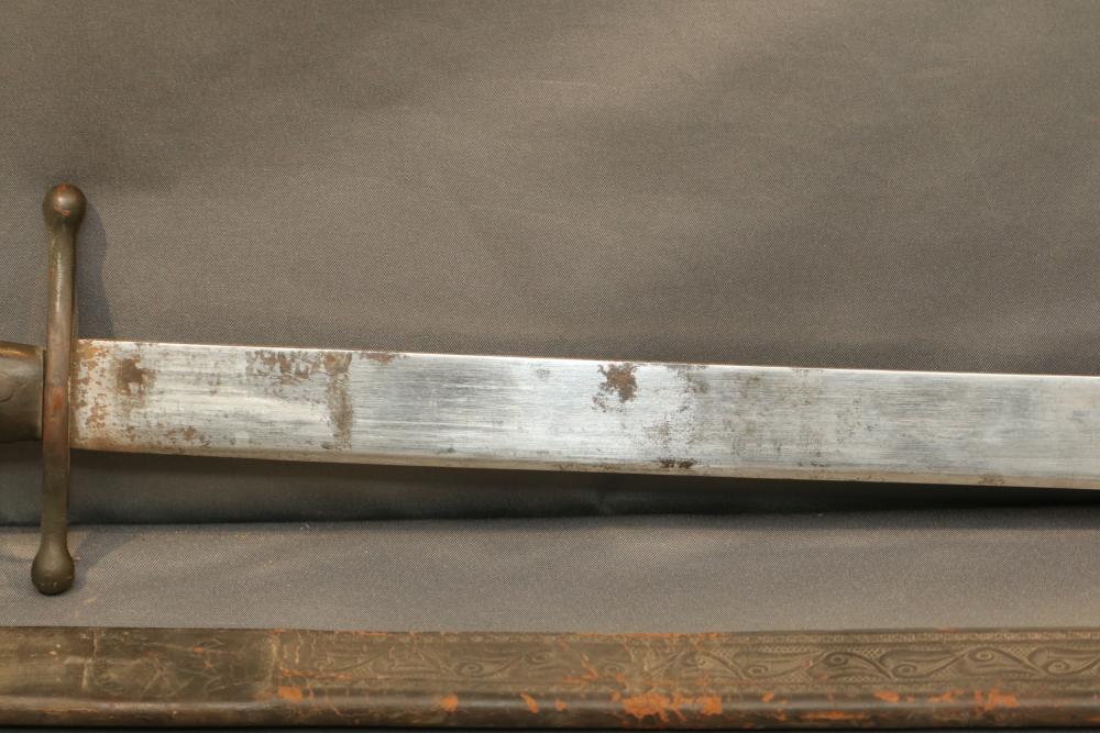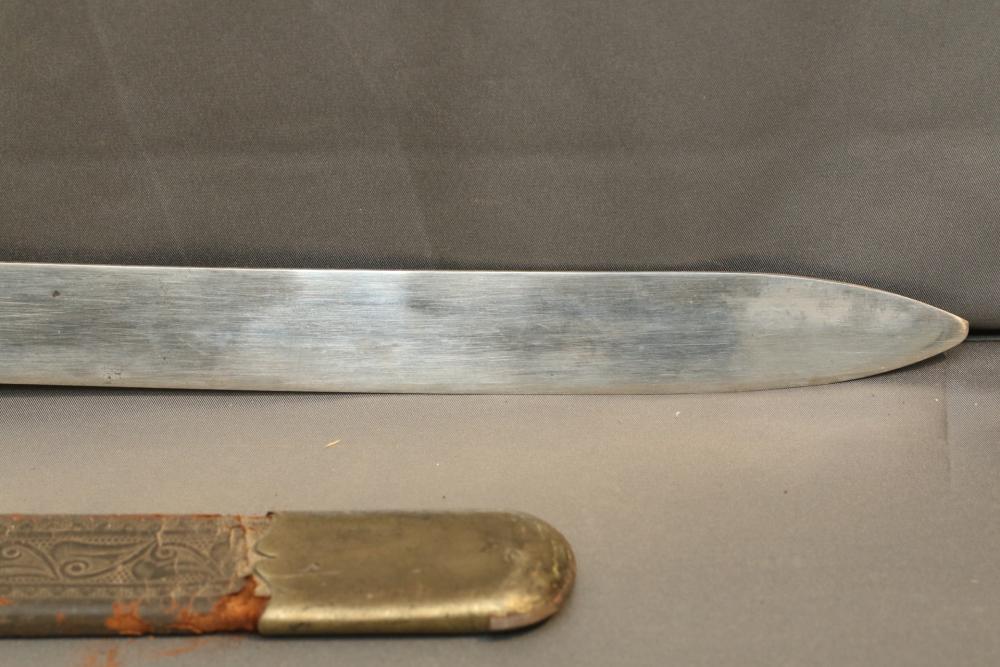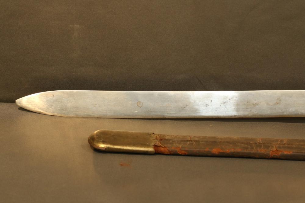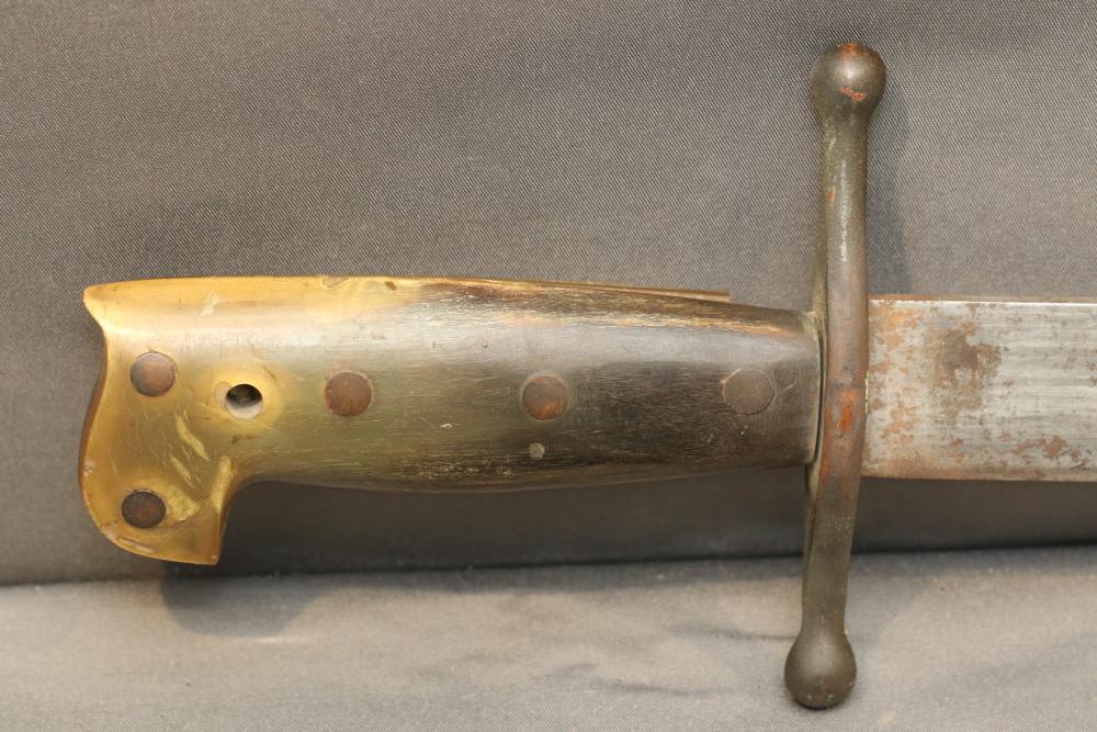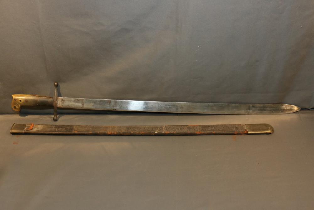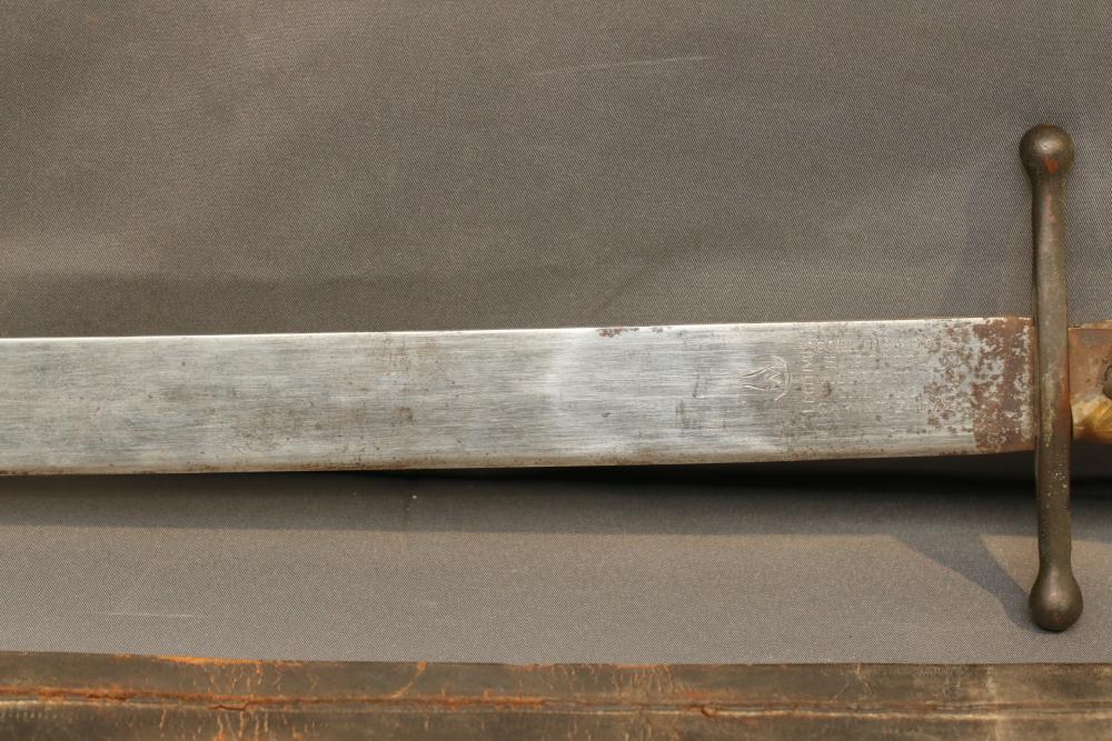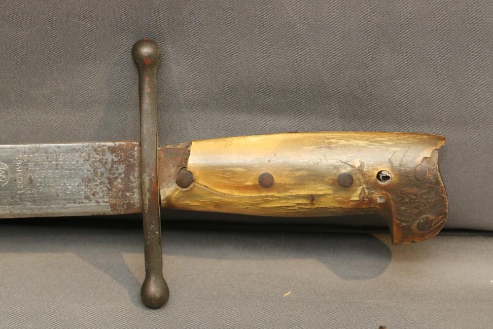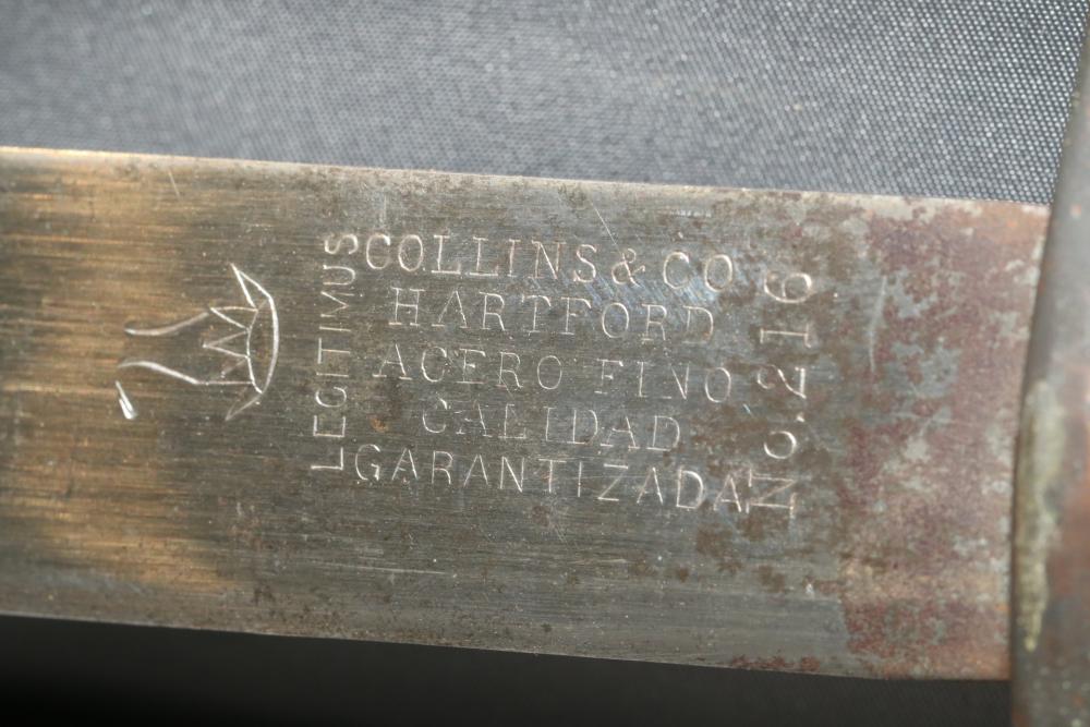 Collins & Co sword machete in scabbard No.216 with horn grips marked on blade "Legitimus Collins & Co Hartford Acero Fine Calidad Garantizada No. 216", scabbard marked "Collins & Co Legitimus", measurements without scabbard: length of blade 27.75" cross guard to pommel 4.75"L total length 32.5"L.