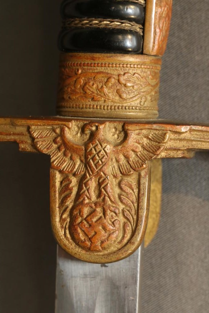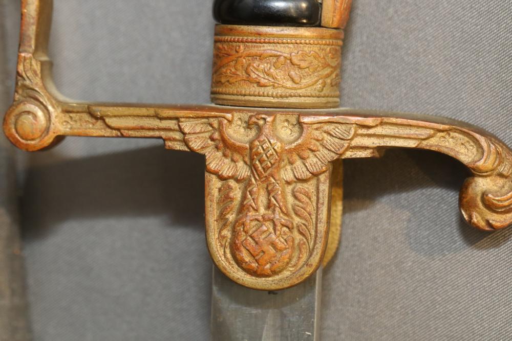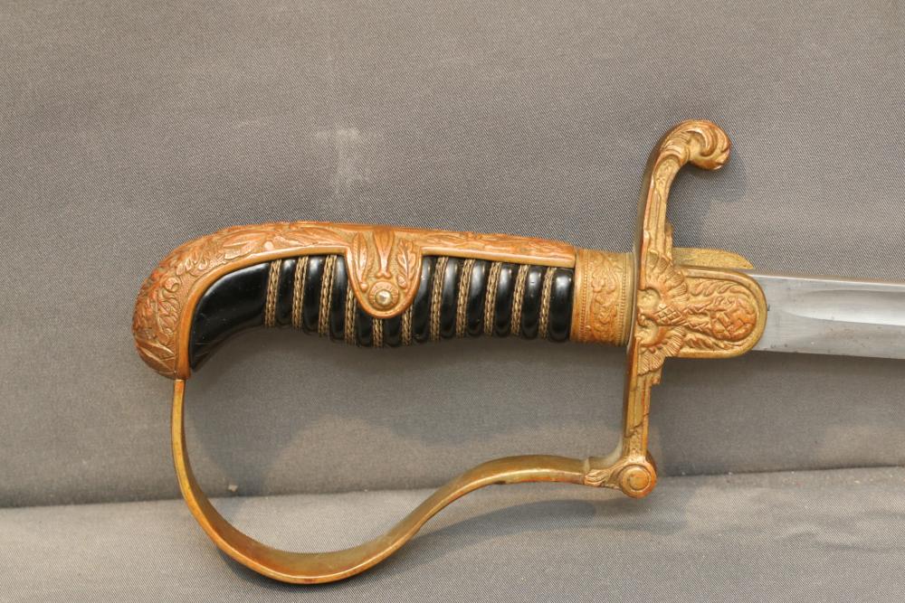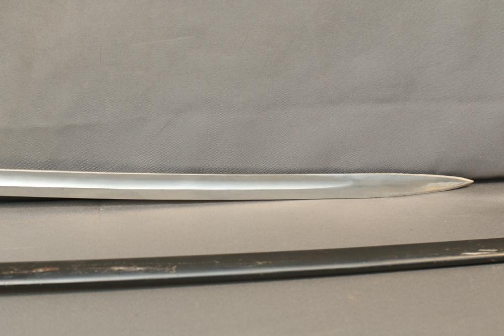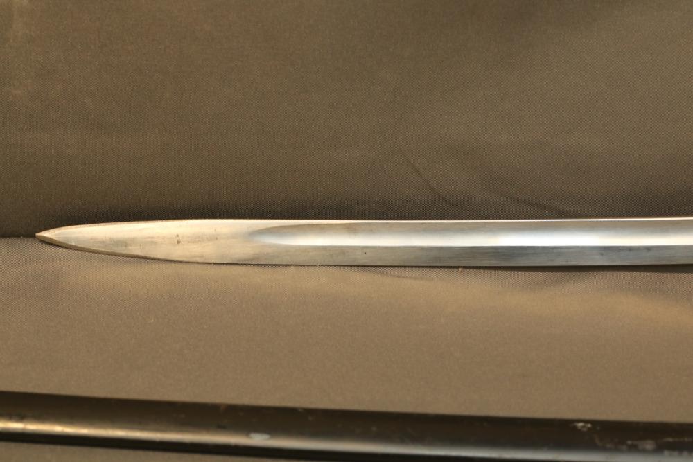 Believed to be WWII German Army Officer's sword in scabbard, fullered blade, ricasso marked "WKC" with knight makers mark, wire wrapped black plastic handle with leaf decoration having German Imperial eagle on cross guard measurements without scabbard: blade 26.5"L, cross guard to pommel 6"L, total length 31.75"L.