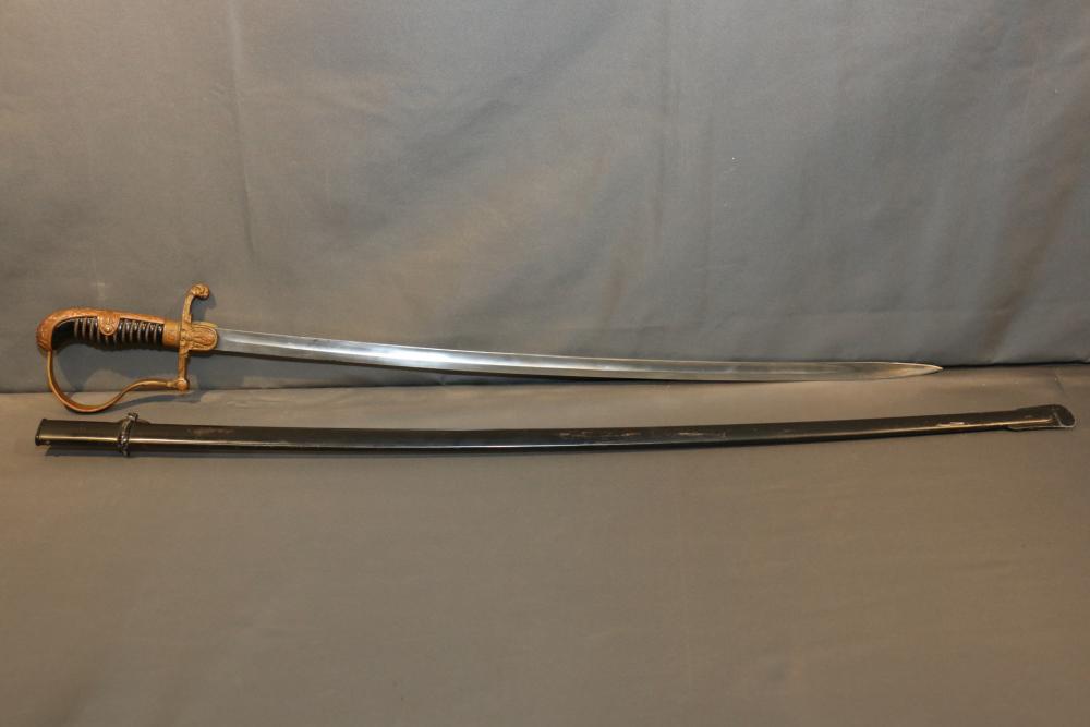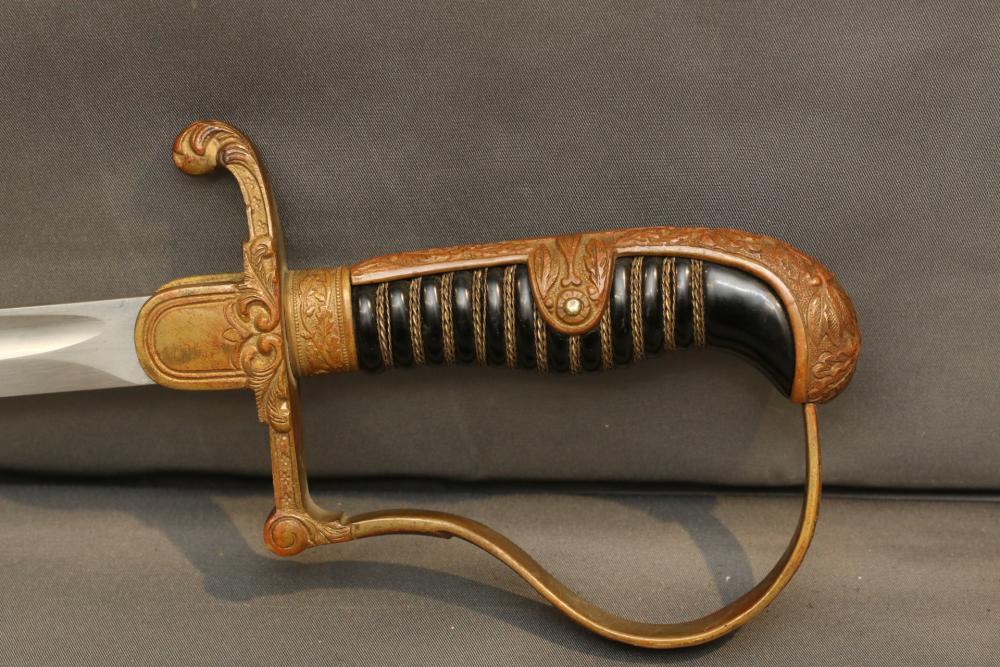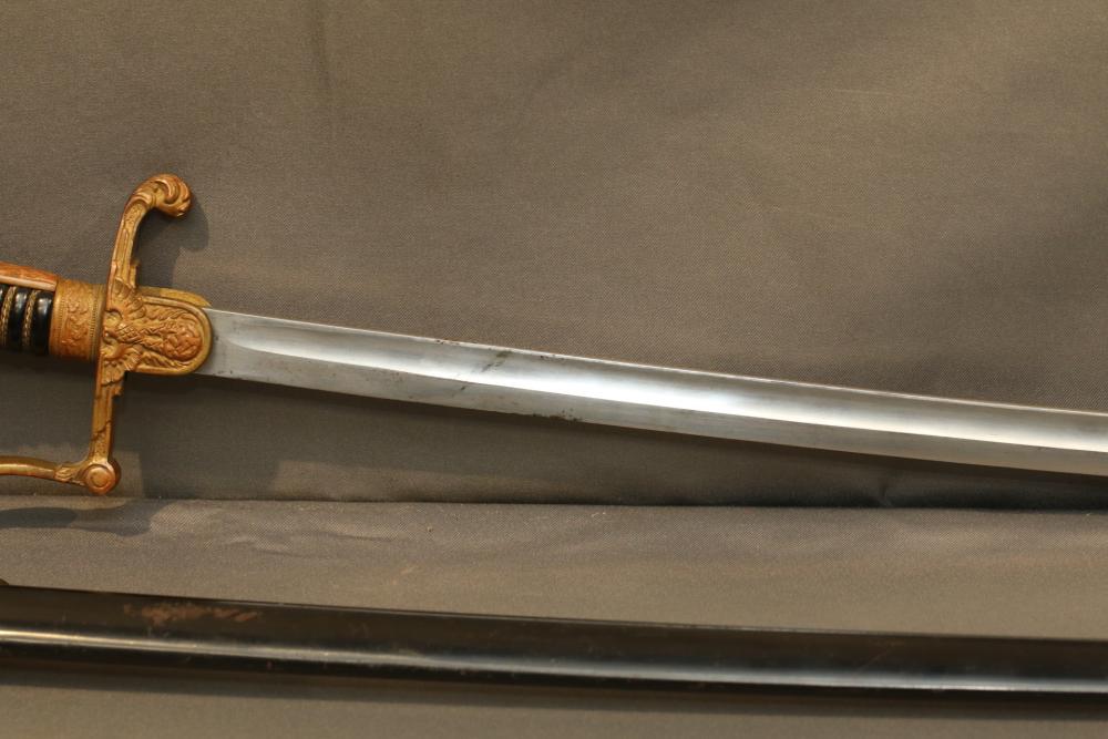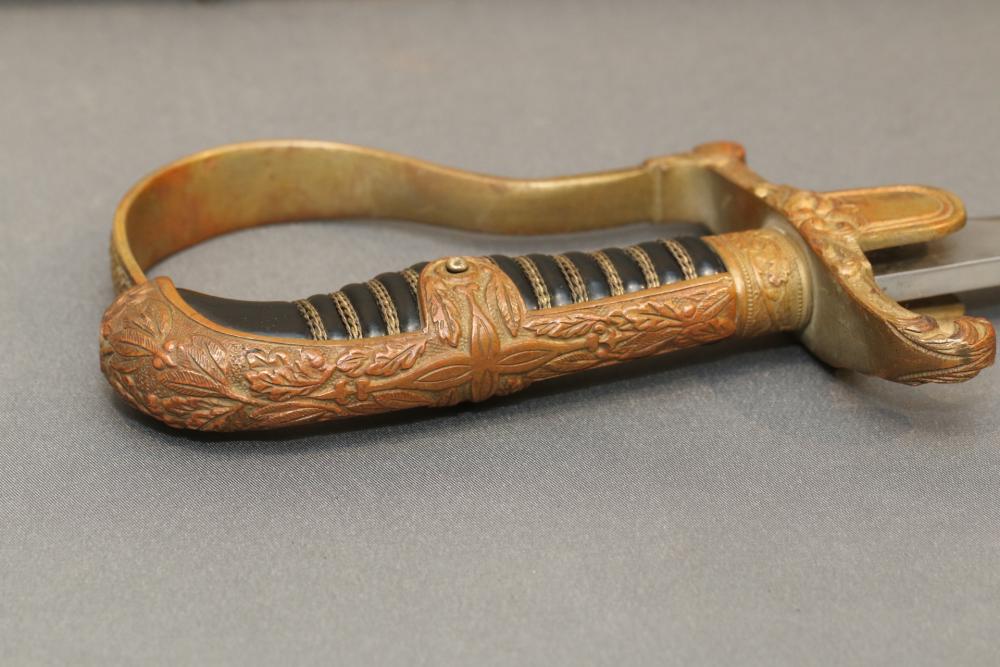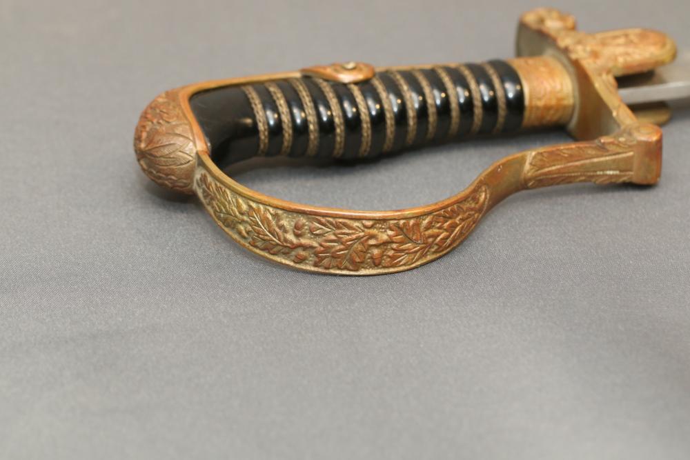 Believed to be WWII German Army Officer's sword in scabbard, fullered blade, ricasso marked "WKC" with knight makers mark, wire wrapped black plastic handle with leaf decoration having German Imperial eagle on cross guard measurements without scabbard: blade 26.5"L, cross guard to pommel 6"L, total length 31.75"L.