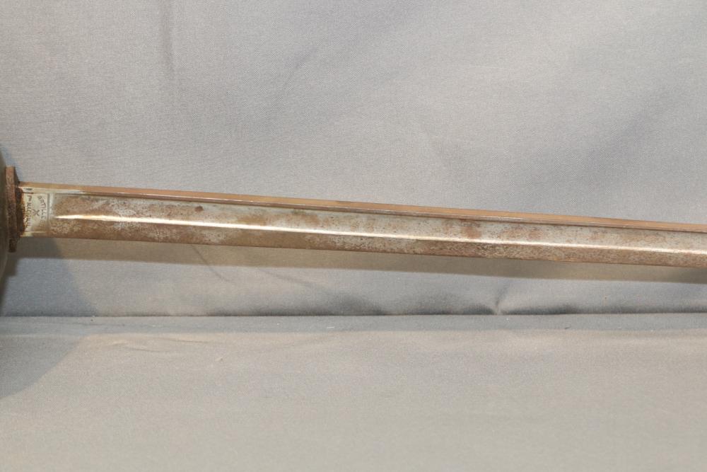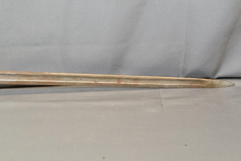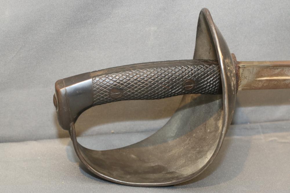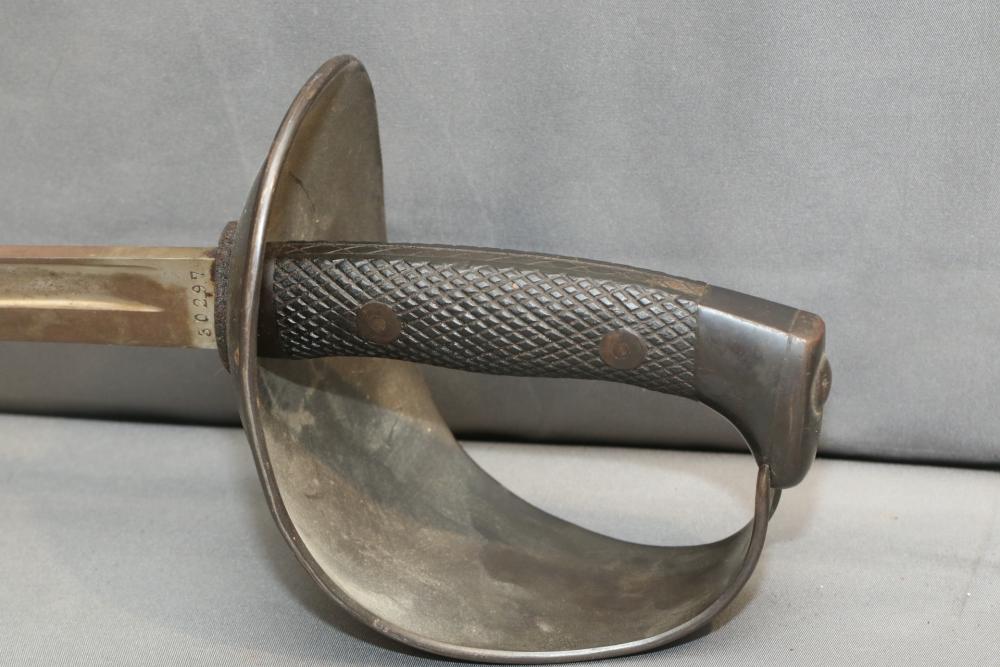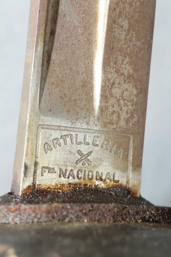 Spanish Cavalry Officer's sword with checkered wood handle, ricasso marked "Artilleria FCA Nacional Toledo" reverse with serial number 30297, blade measures 35"L, guard to pommel approx 6", total length approx 41.75"L.