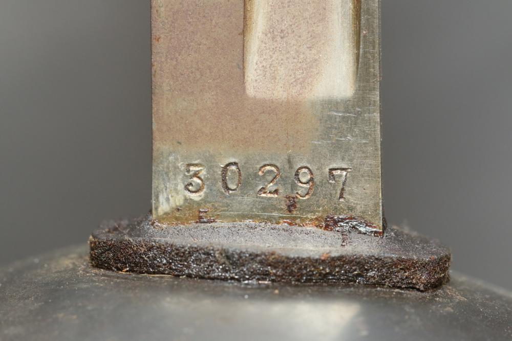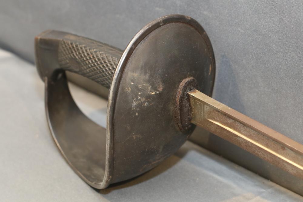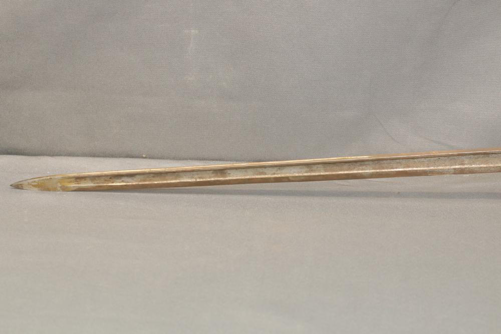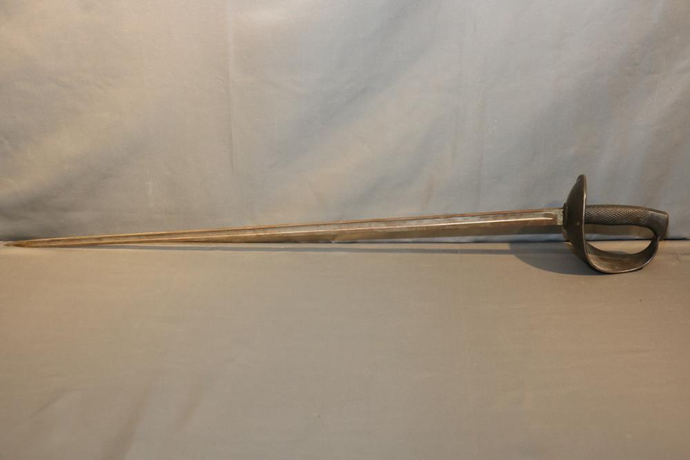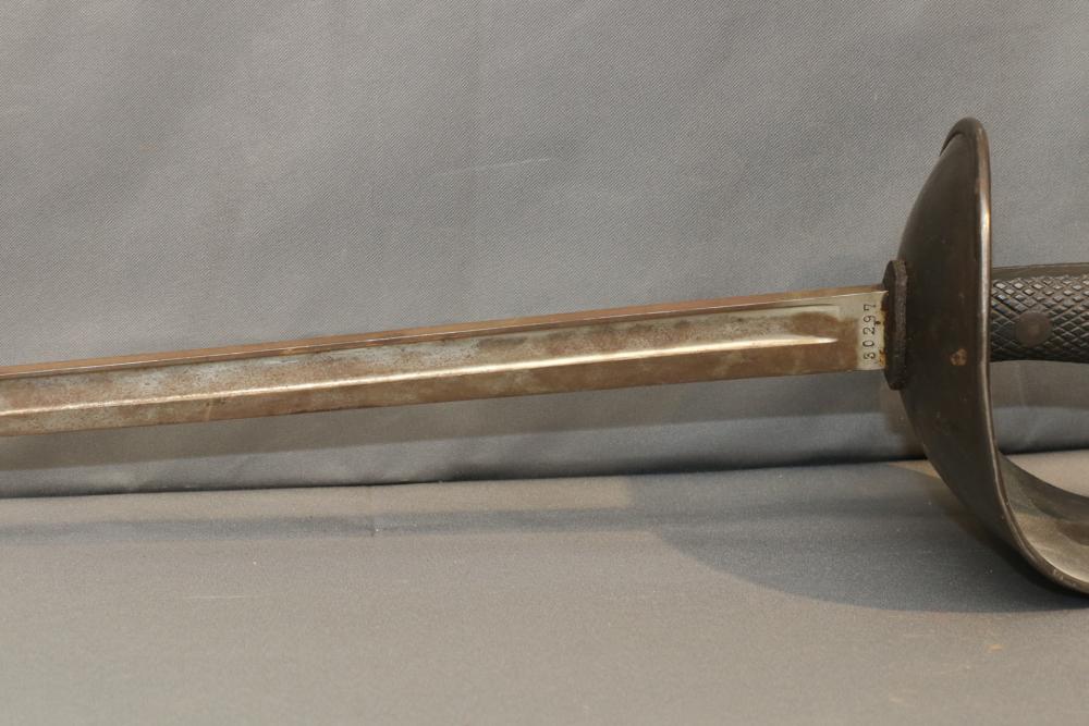Spanish Cavalry Officer's sword with checkered wood handle, ricasso marked "Artilleria FCA Nacional Toledo" reverse with serial number 30297, blade measures 35"L, guard to pommel approx 6", total length approx 41.75"L.