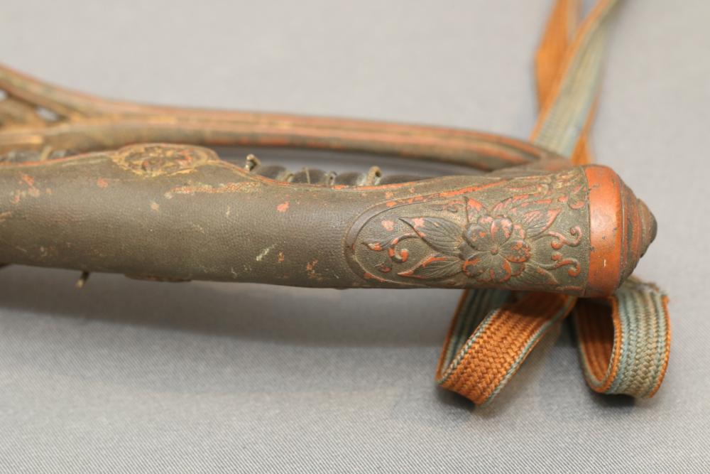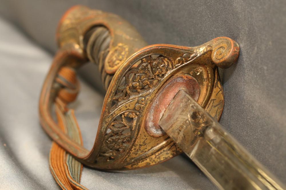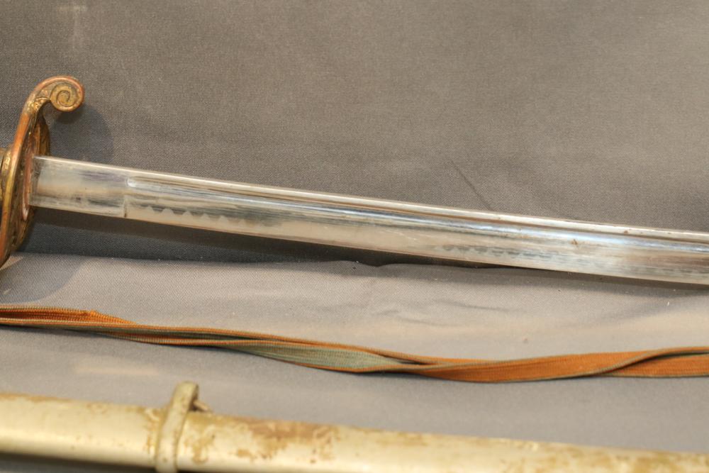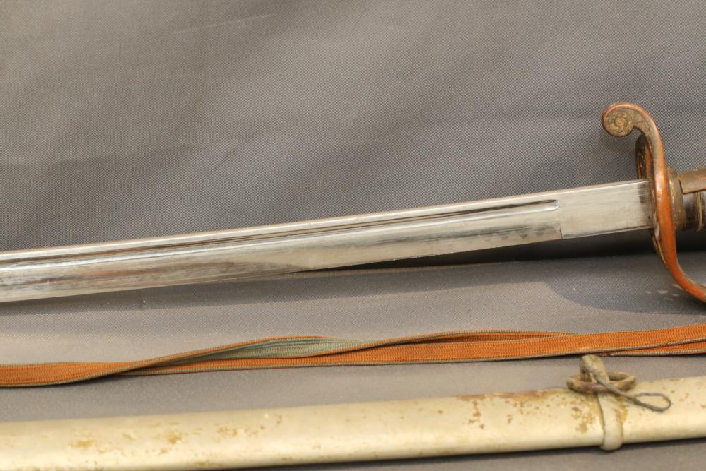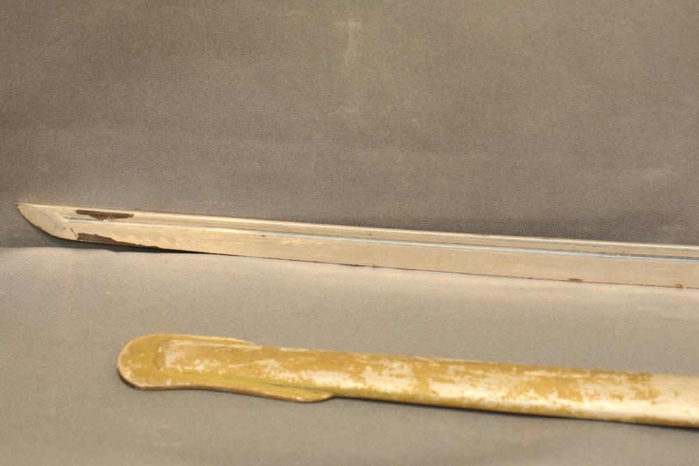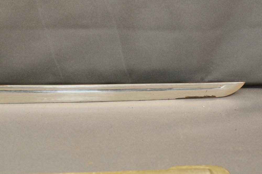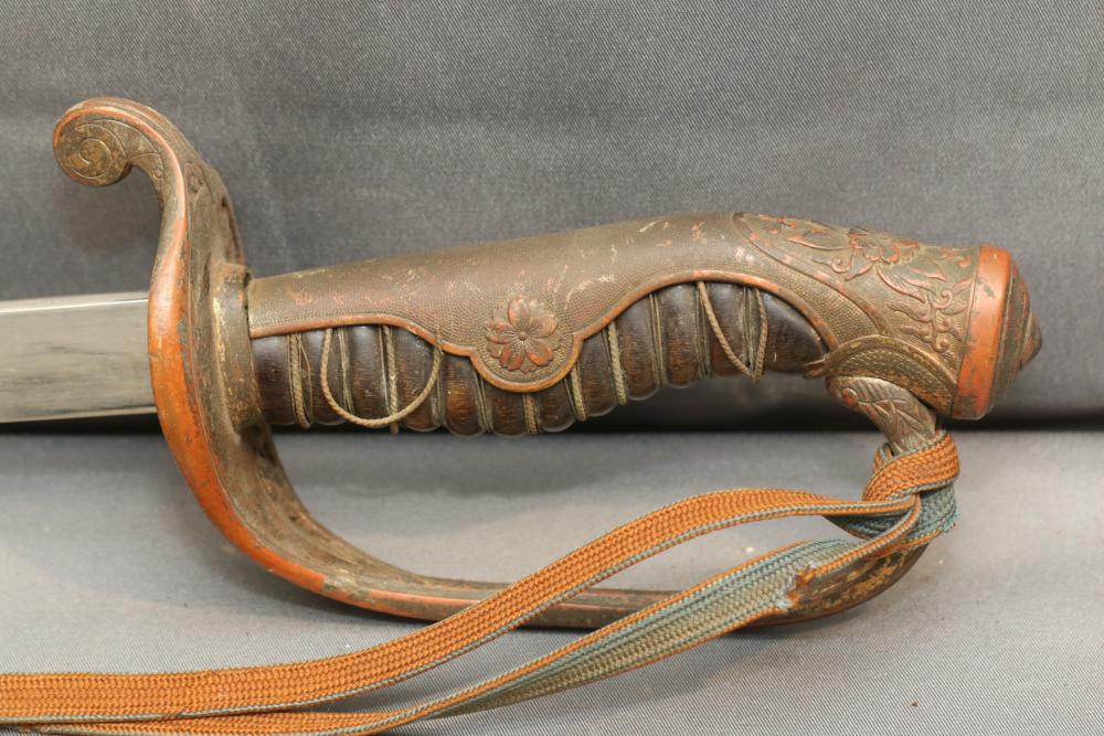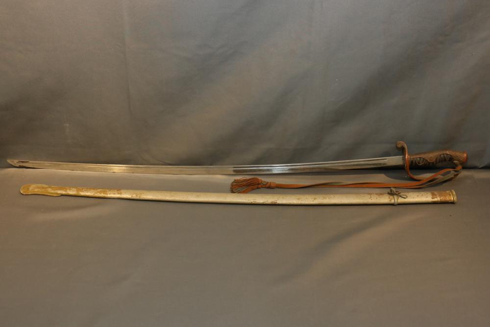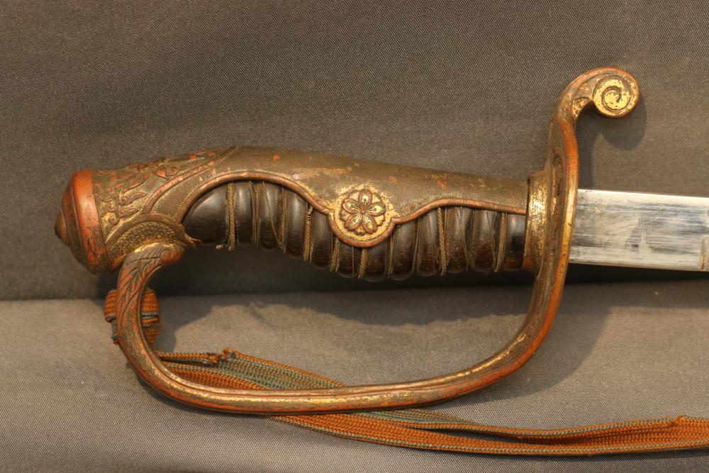 Japanese WWII police sword in scabbard, with wire wrapped wood handle having brass guard with knot, cherry blossom on both sides of guard, single deep fuller running length of blade, measurements without scabbard: blade 33.25"L, guard to pommel 6"L, total length 38.5"L.