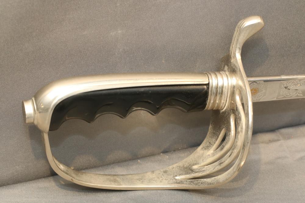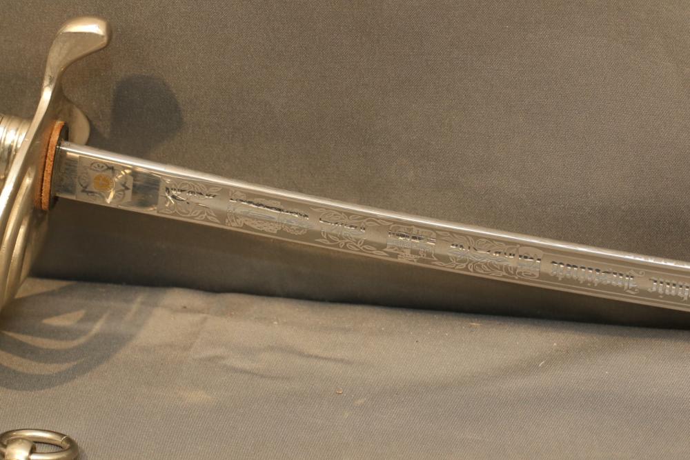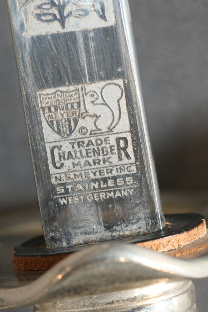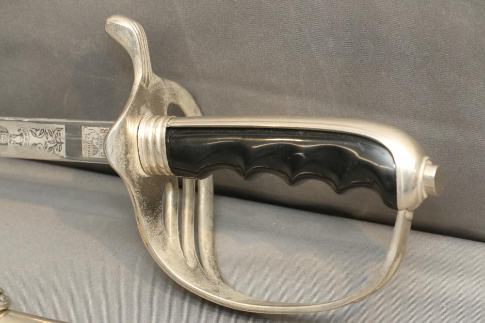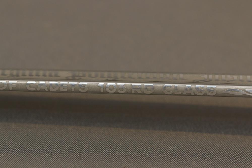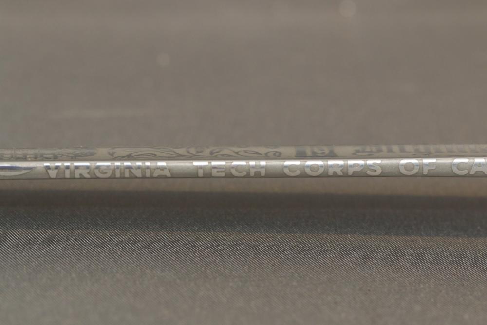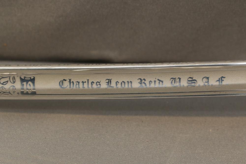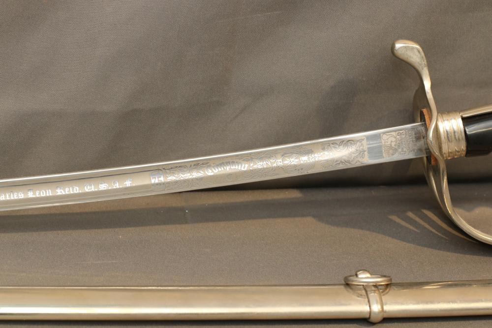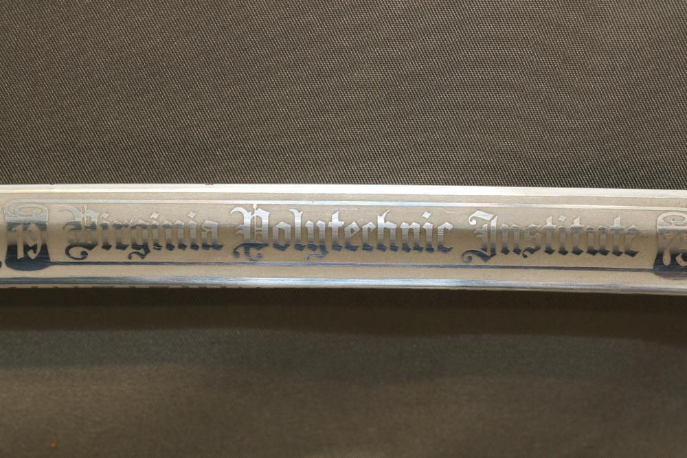 Virginia Tech Corps Of Cadets 103rd Class US M1902 sword in scabbard, ricasso marked with Eickhorn squirrel and "Armed forces equipment New York Meyer Trade Challenger mark N.S. Meyer Inc Stainless West Germany" reverse with a hallmark marked in center "Proved", etched blade one side marked "Charles Leon Reid , U.S.A.F.", reverse marked "Virginia Polytechnic Institute", plastic grip on wood handle, measurements without scabbard: blade 29.5"L, guard to pommel 6"L, total length 35-3/8"L.