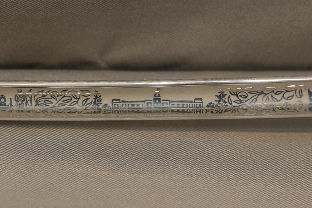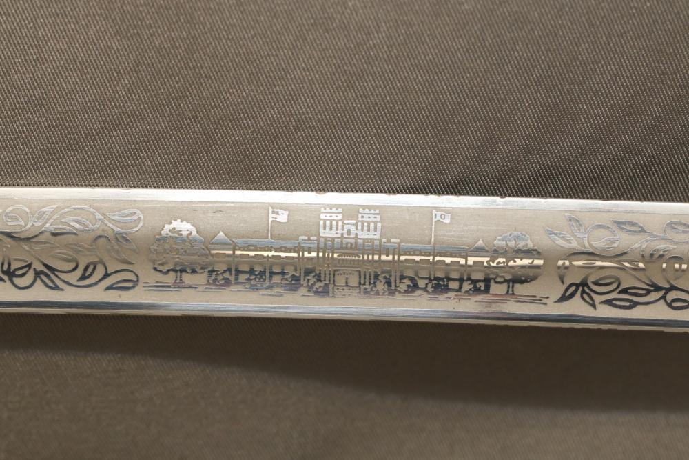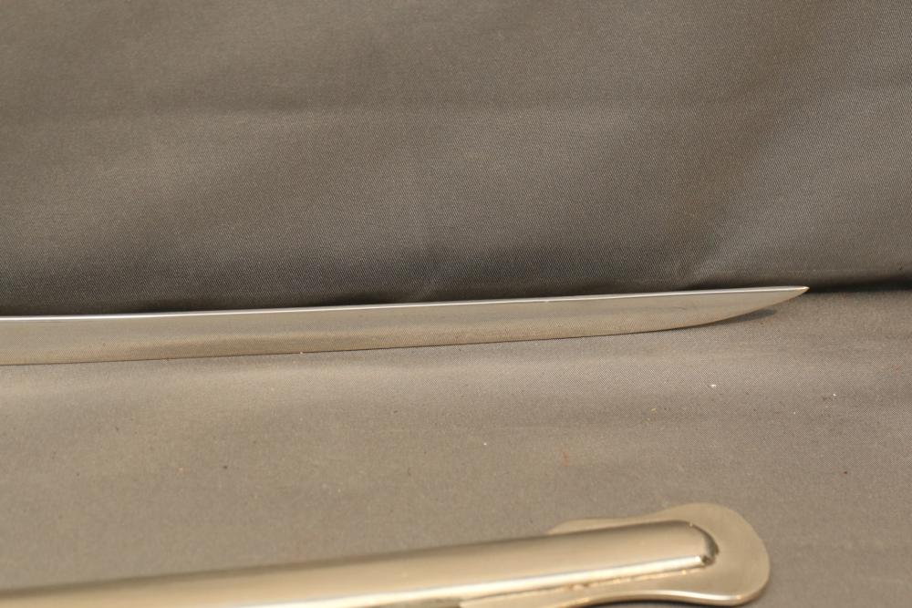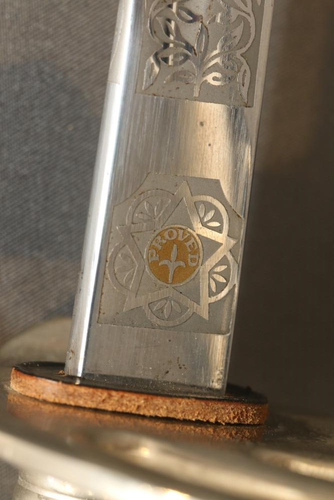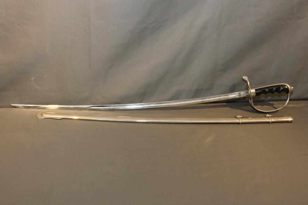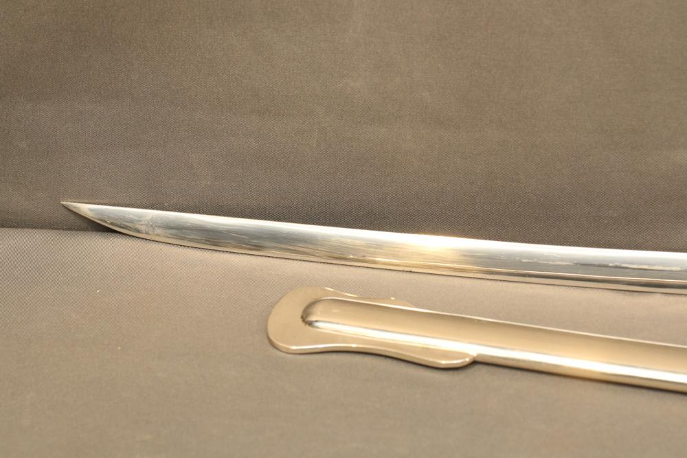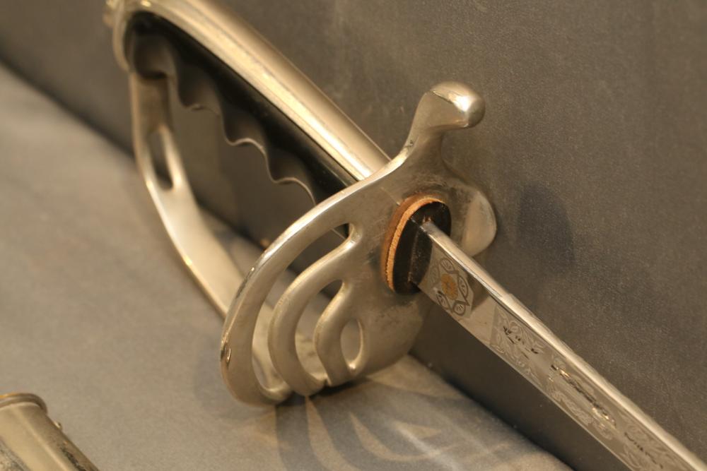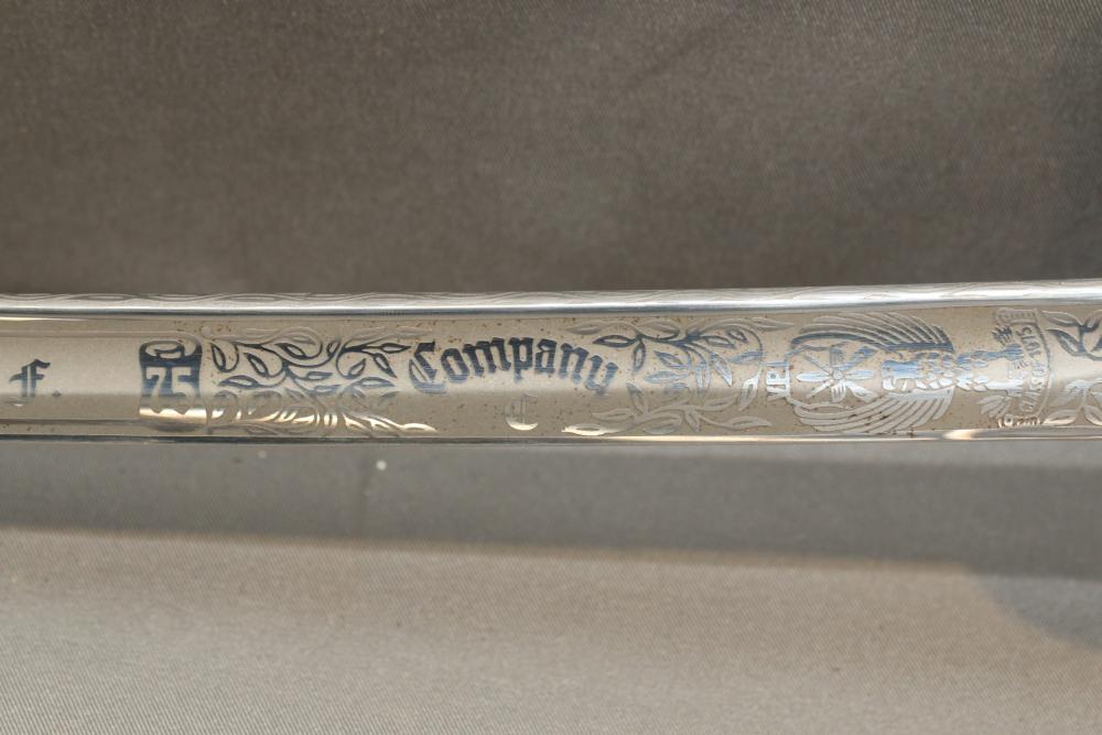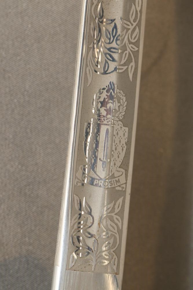 Virginia Tech Corps Of Cadets 103rd Class US M1902 sword in scabbard, ricasso marked with Eickhorn squirrel and "Armed forces equipment New York Meyer Trade Challenger mark N.S. Meyer Inc Stainless West Germany" reverse with a hallmark marked in center "Proved", etched blade one side marked "Charles Leon Reid , U.S.A.F.", reverse marked "Virginia Polytechnic Institute", plastic grip on wood handle, measurements without scabbard: blade 29.5"L, guard to pommel 6"L, total length 35-3/8"L.