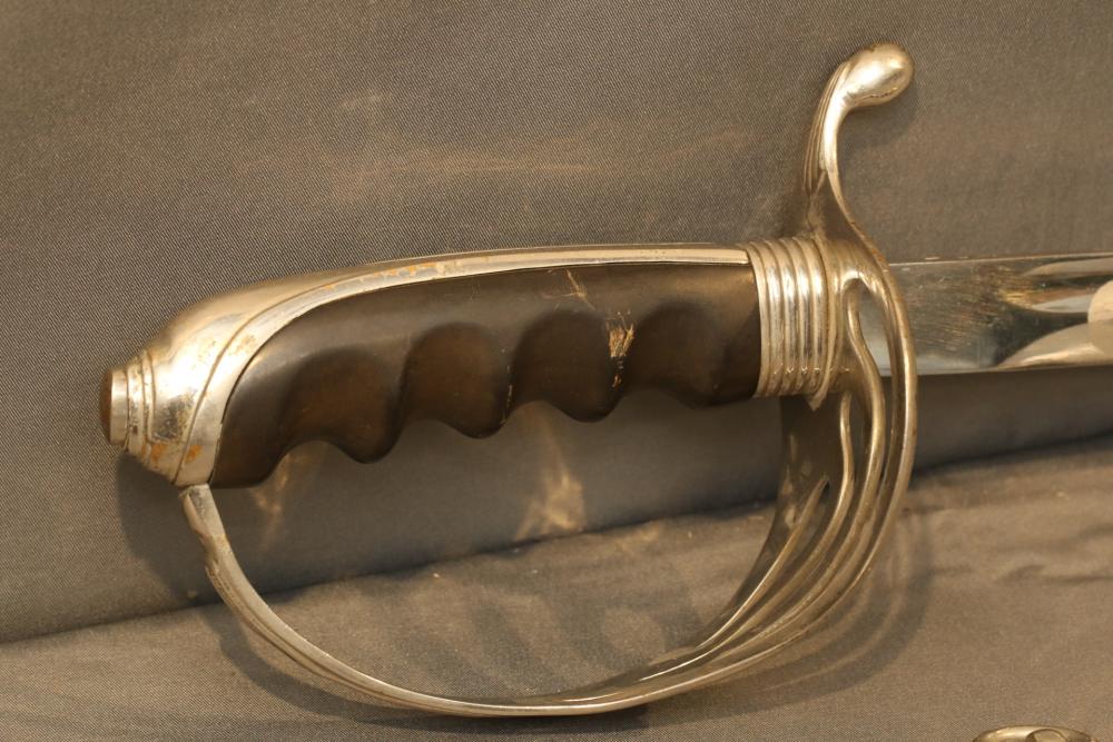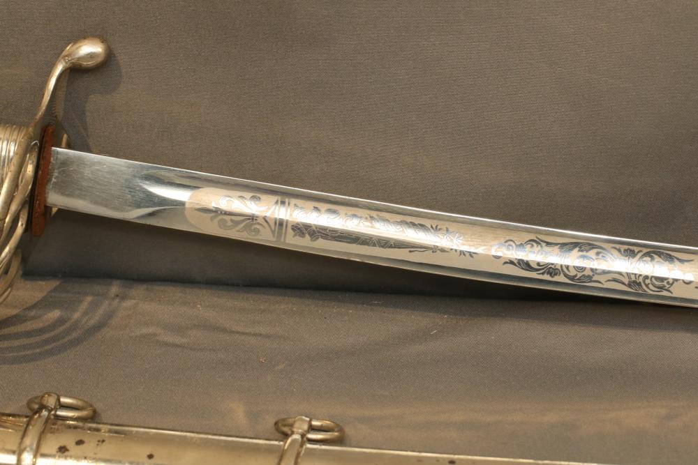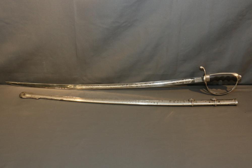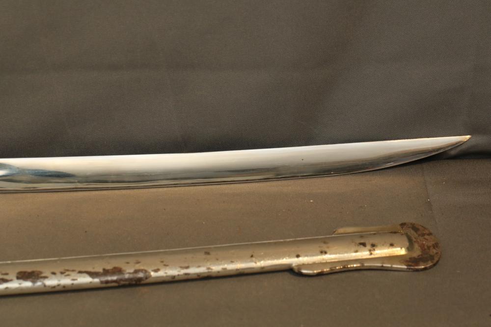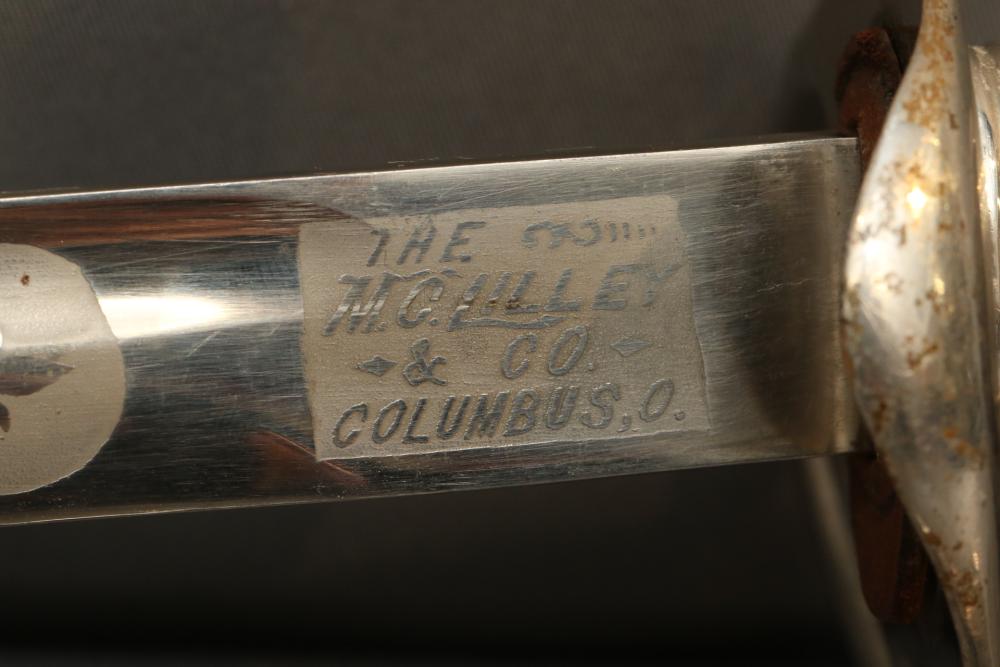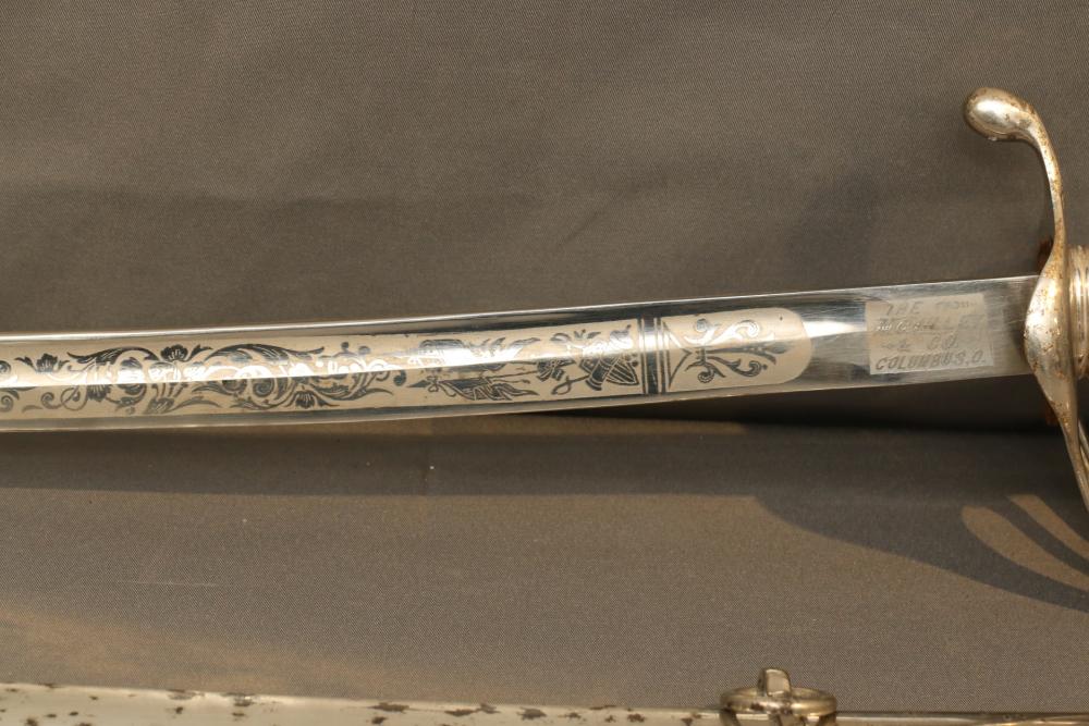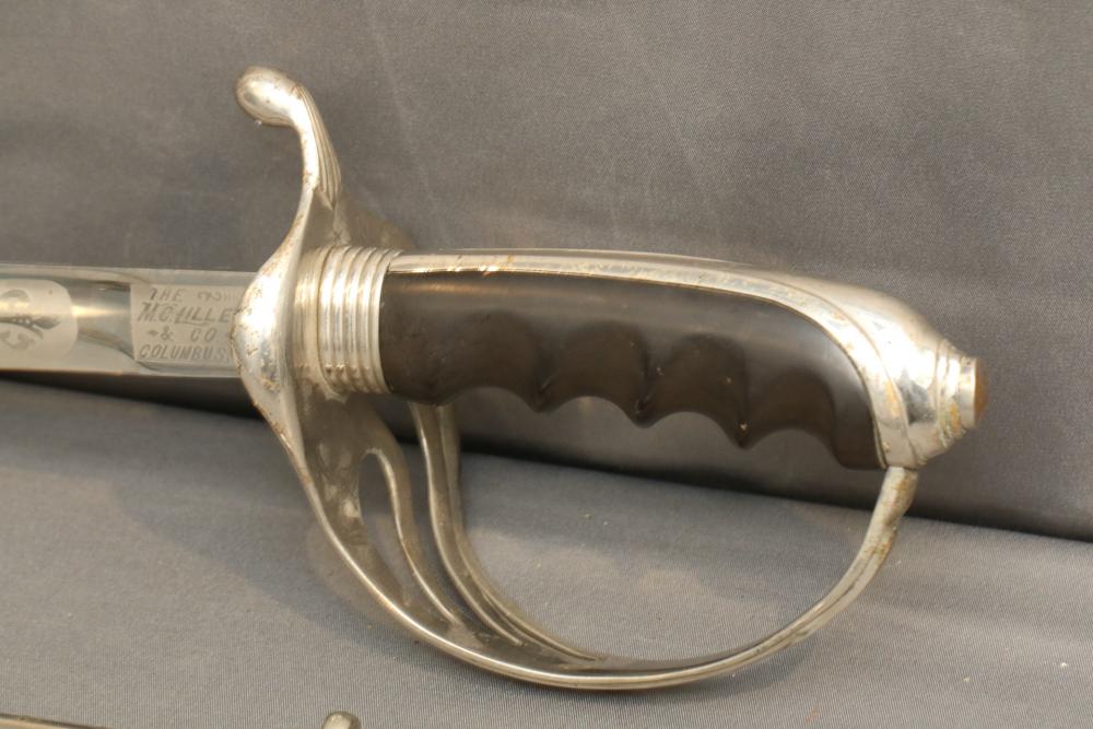 US M1902 Army Officer Saber in scabbard, spine of blade and scabbard both marked "102", ricasso marked "The M.C. Lilly & Co. Columbus, O.", etched blade one side marked "US", plastic grip on wood handle, measurements without scabbard: blade 32"L, guard to pommel 6.25"L, total length 37.5"L.
