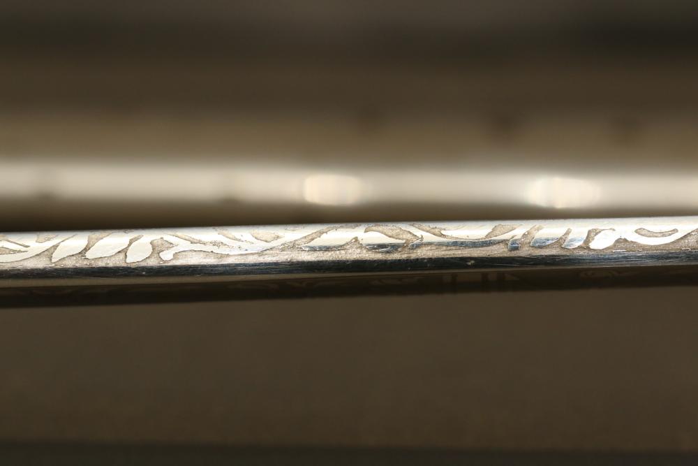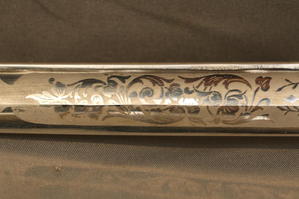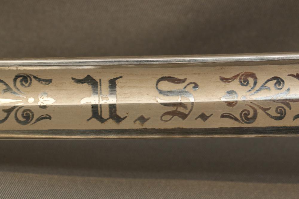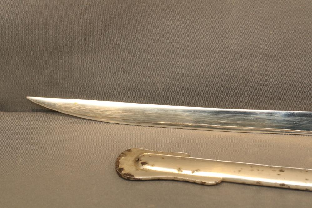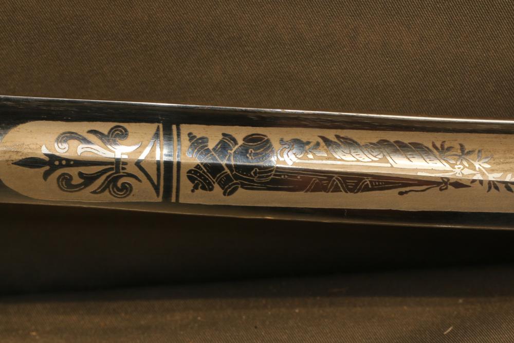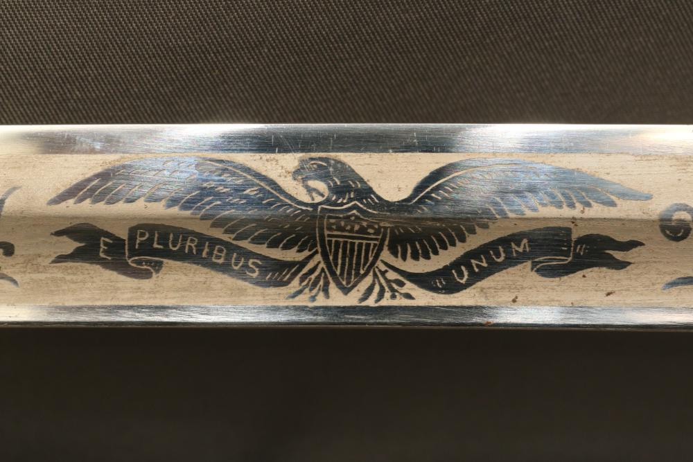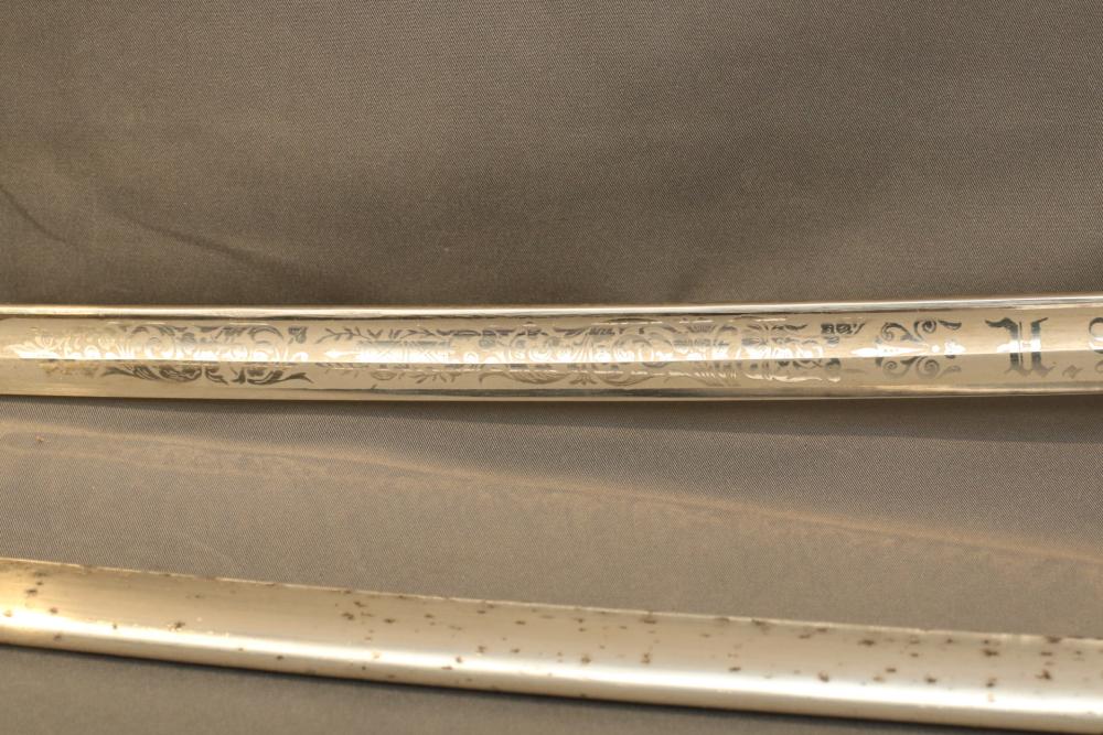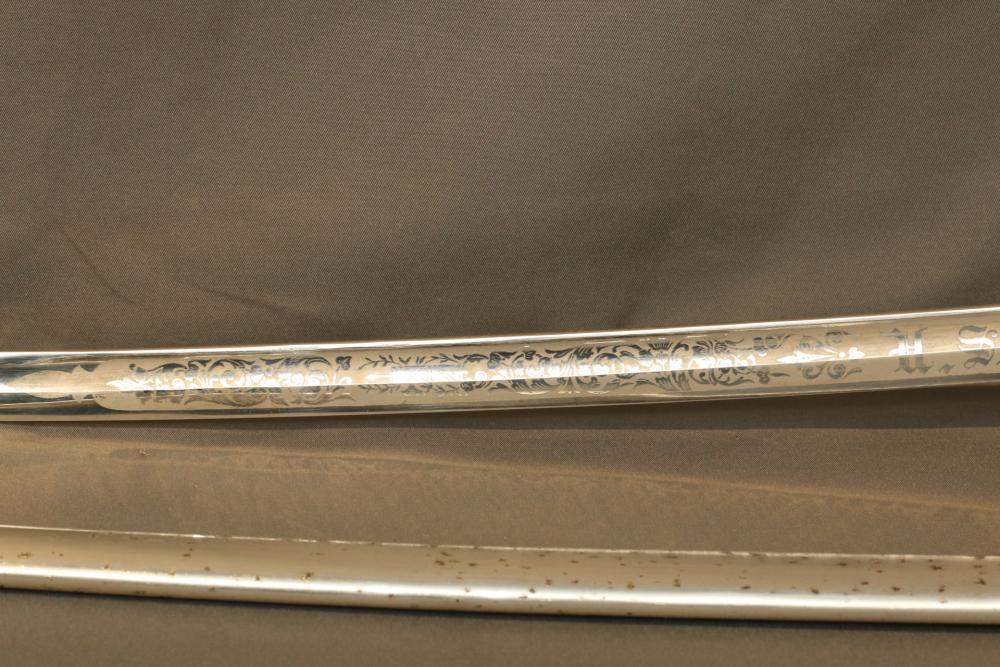 US M1902 Army Officer Saber in scabbard, spine of blade and scabbard both marked "102", ricasso marked "The M.C. Lilly & Co. Columbus, O.", etched blade one side marked "US", plastic grip on wood handle, measurements without scabbard: blade 32"L, guard to pommel 6.25"L, total length 37.5"L.