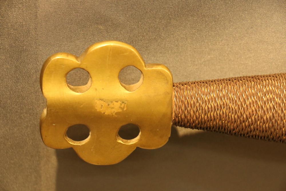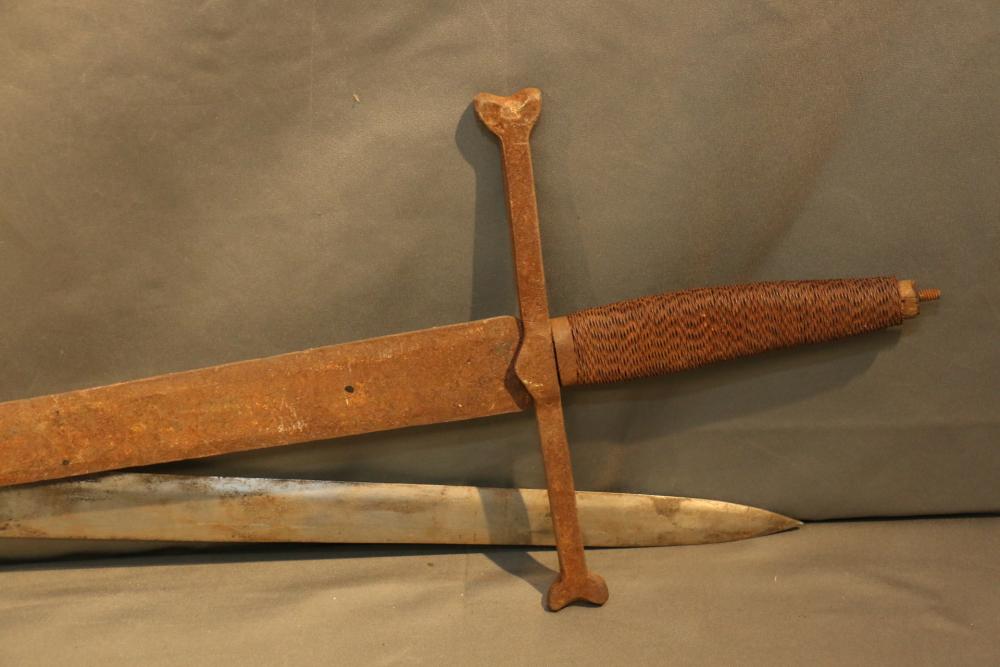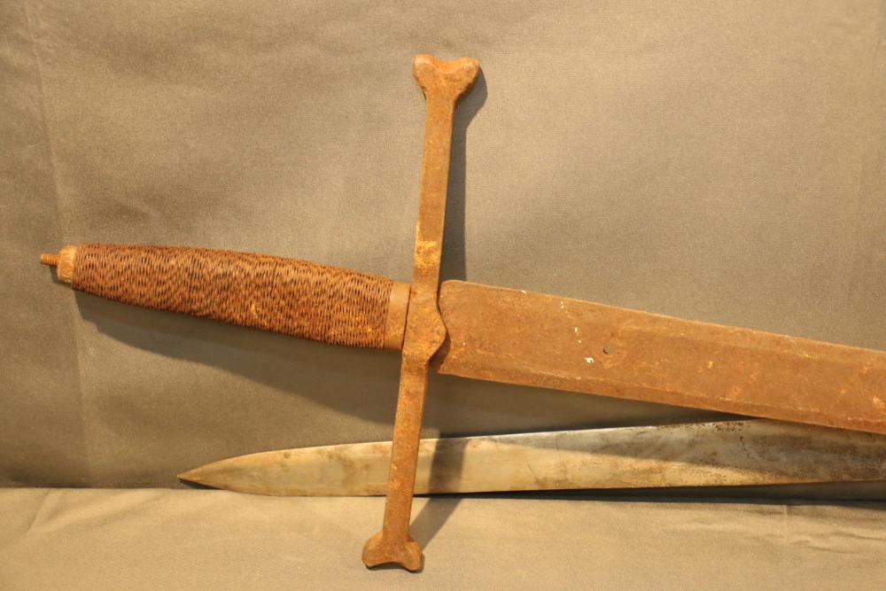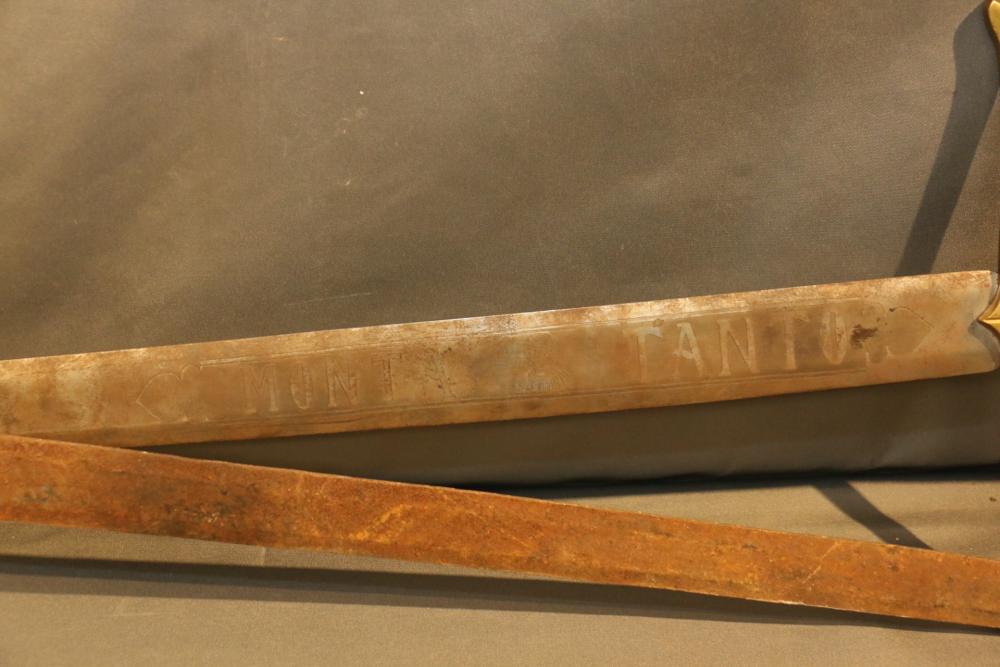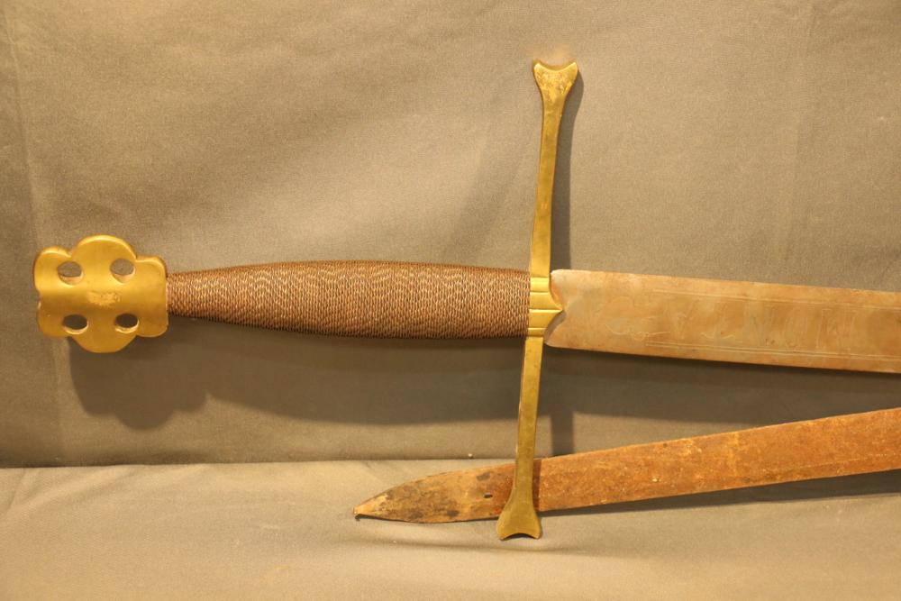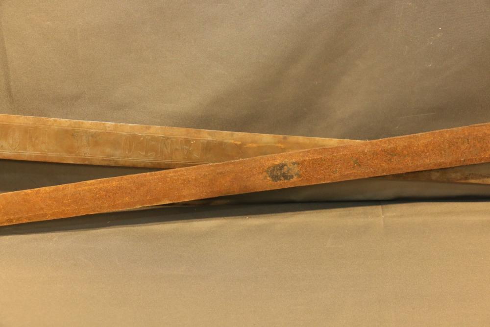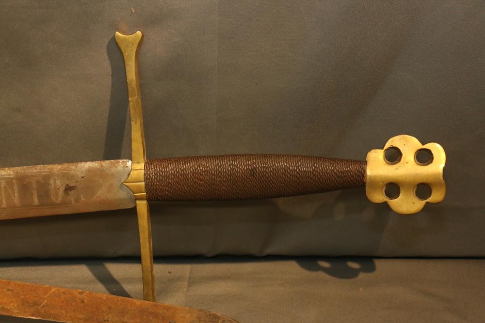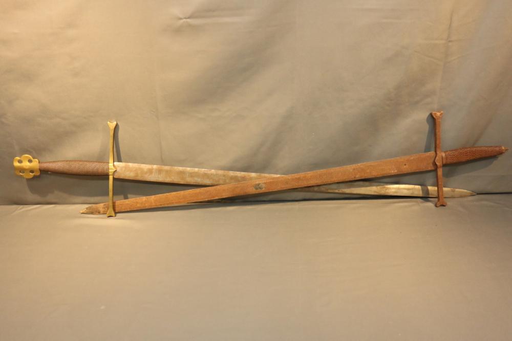 Two Spanish Catholic King's style swords one having motto on blade "Monta Tanto" with reverse marked "Tanto Monta" tight wire wrapped handle with gold wash pommel and cross guard, total length 51.75"L, second having no visible markings missing pommel cross guard is magnetic tight wire wrapped handle, total length 47.75"L.
