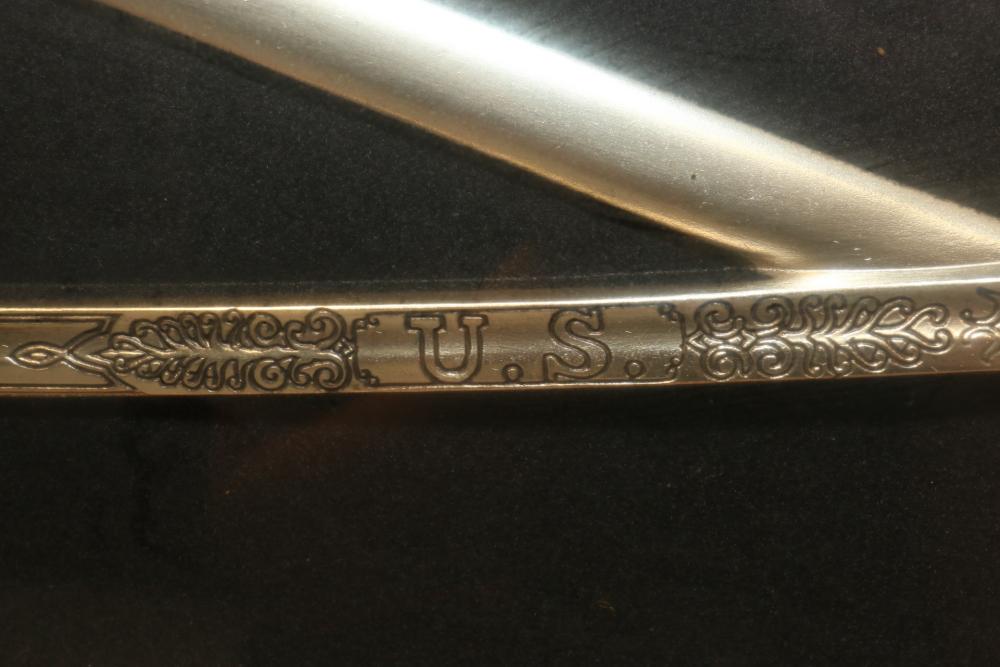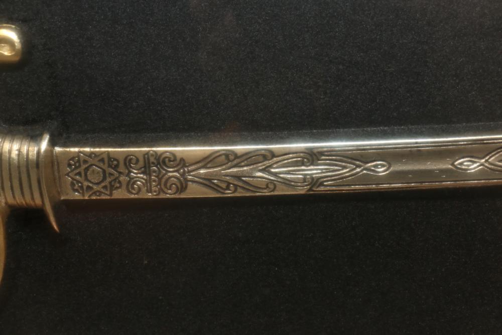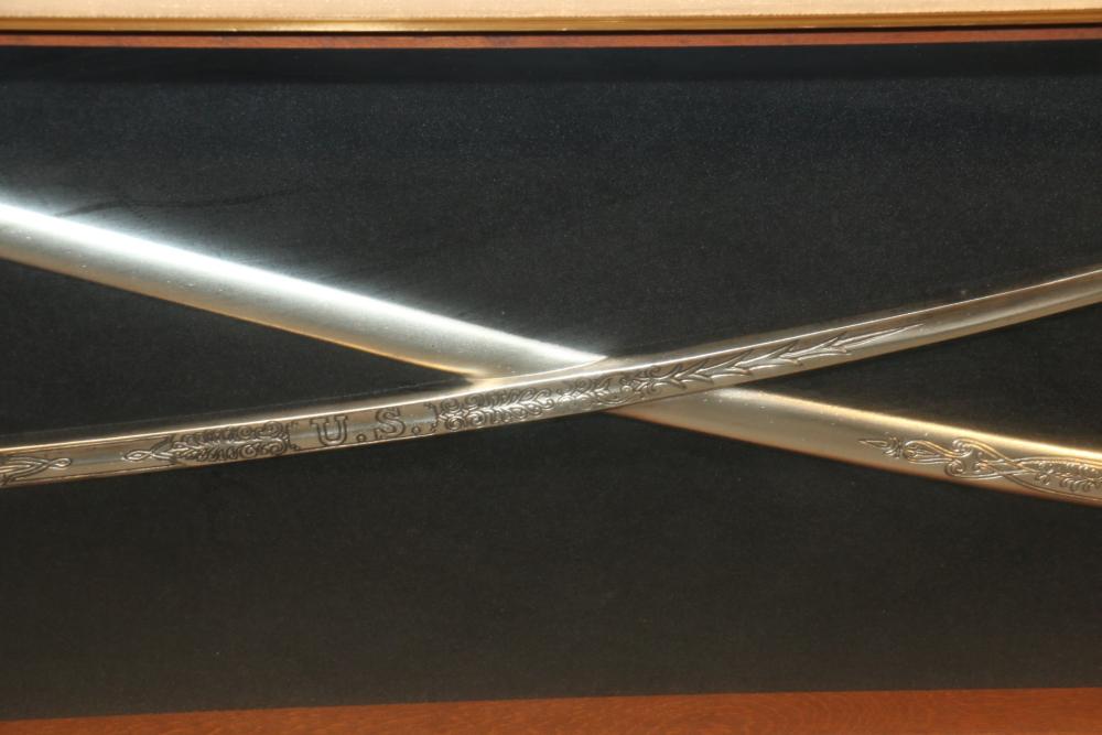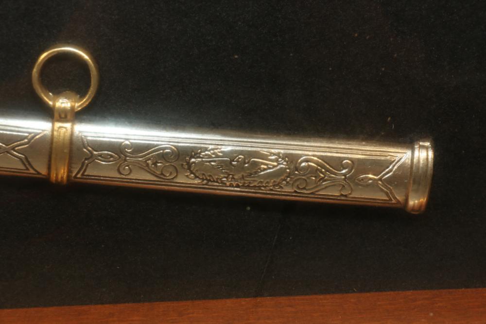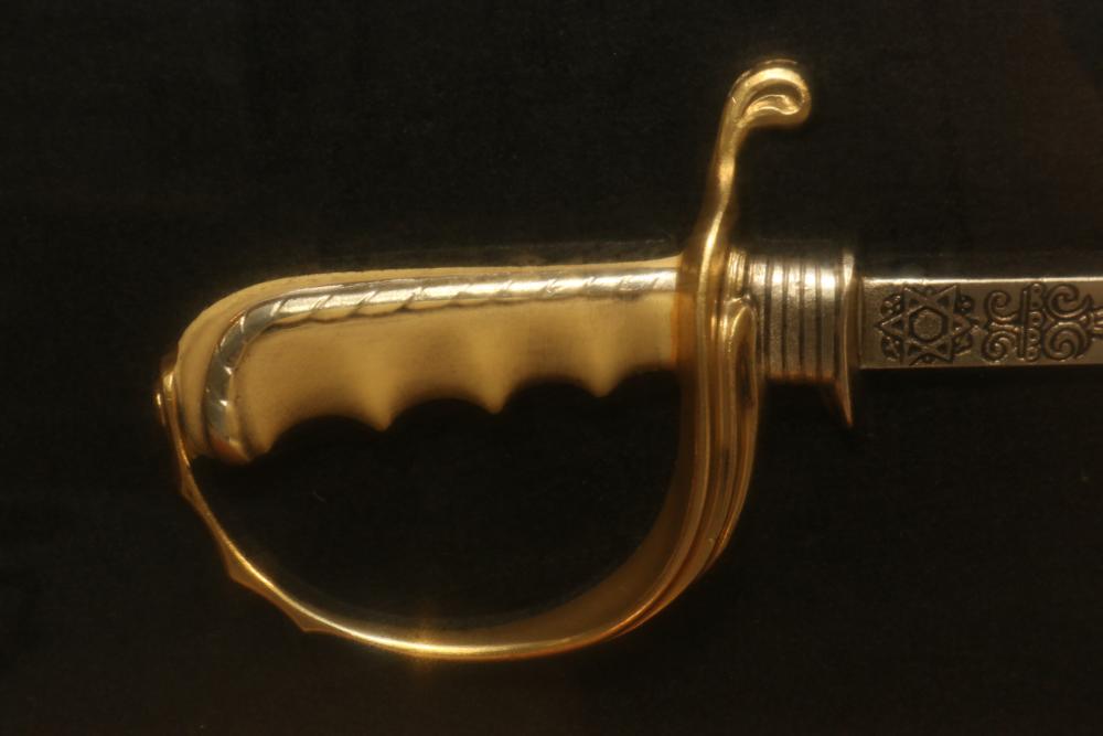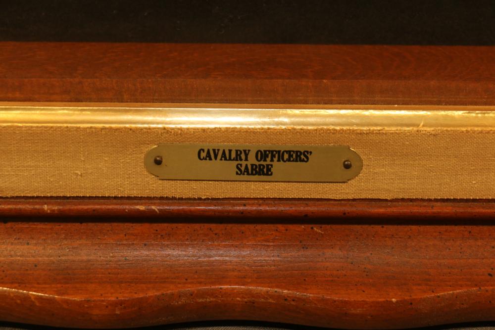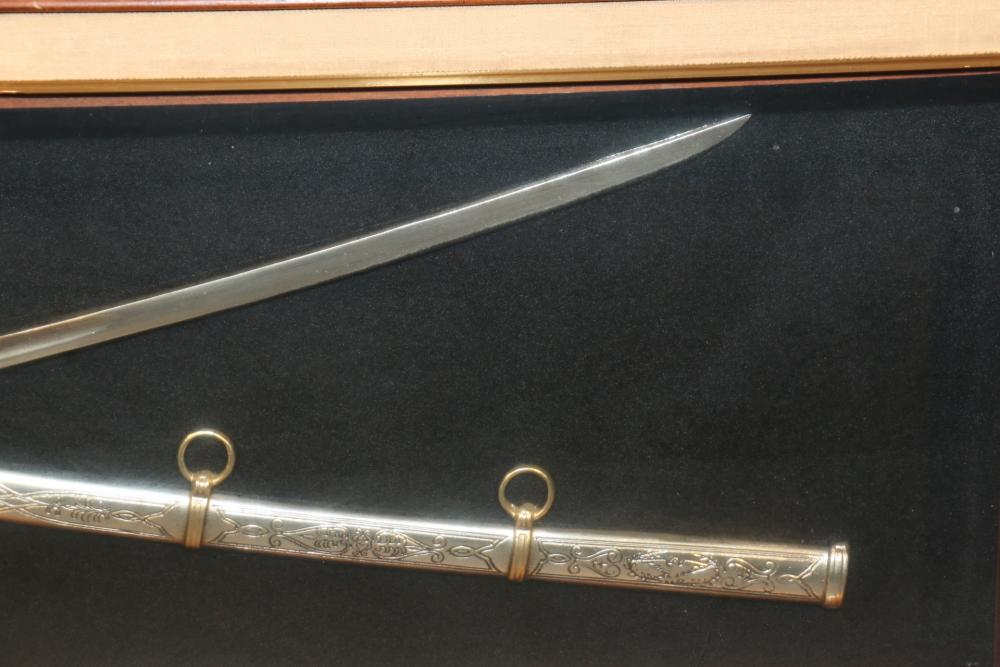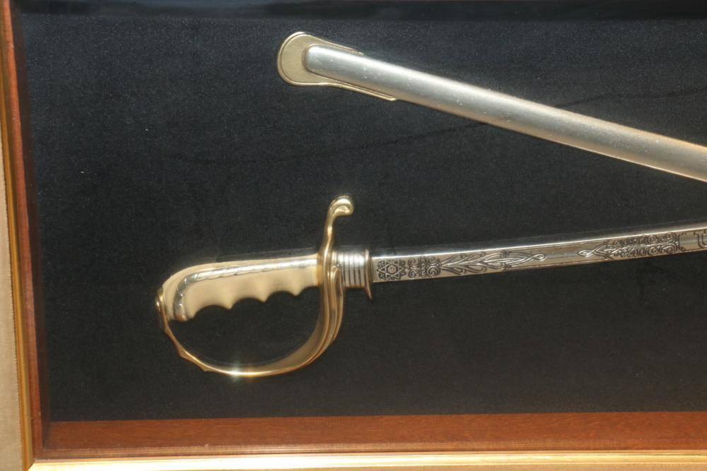 Commemorative Cavalry Officers sword in hanging display case, blade having engraved decoration incl "U.S." and with Star Of David at ricasso, scabbard with decorative engraving, display case measuring 49" X 16.75" X approx 3"T. Pickup only.