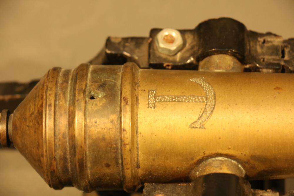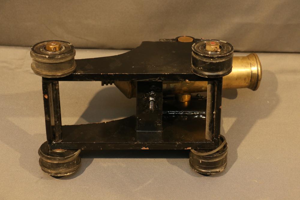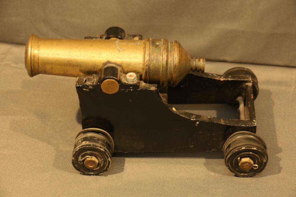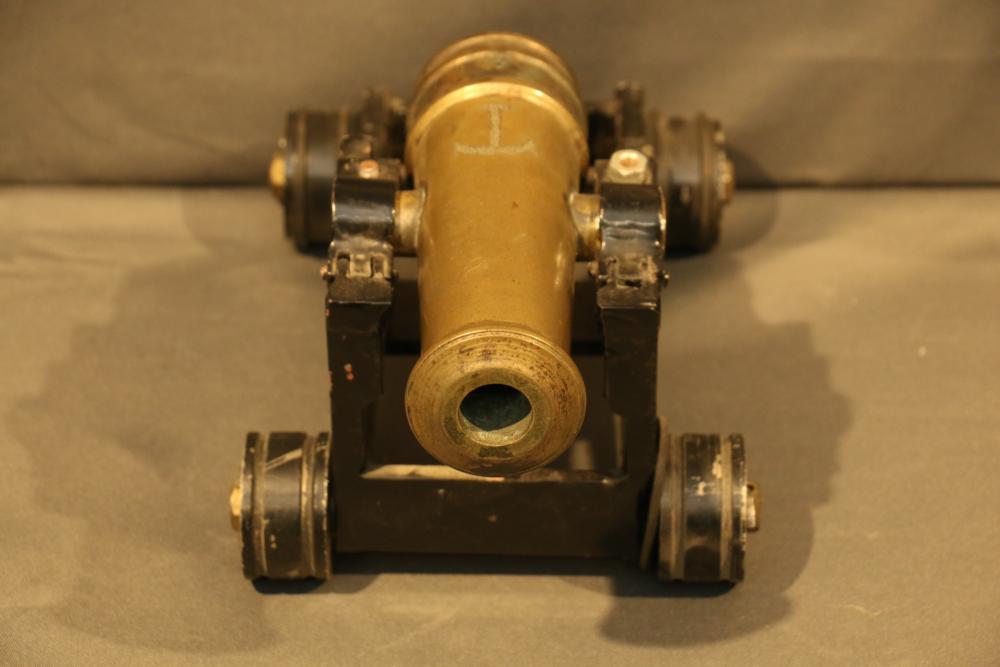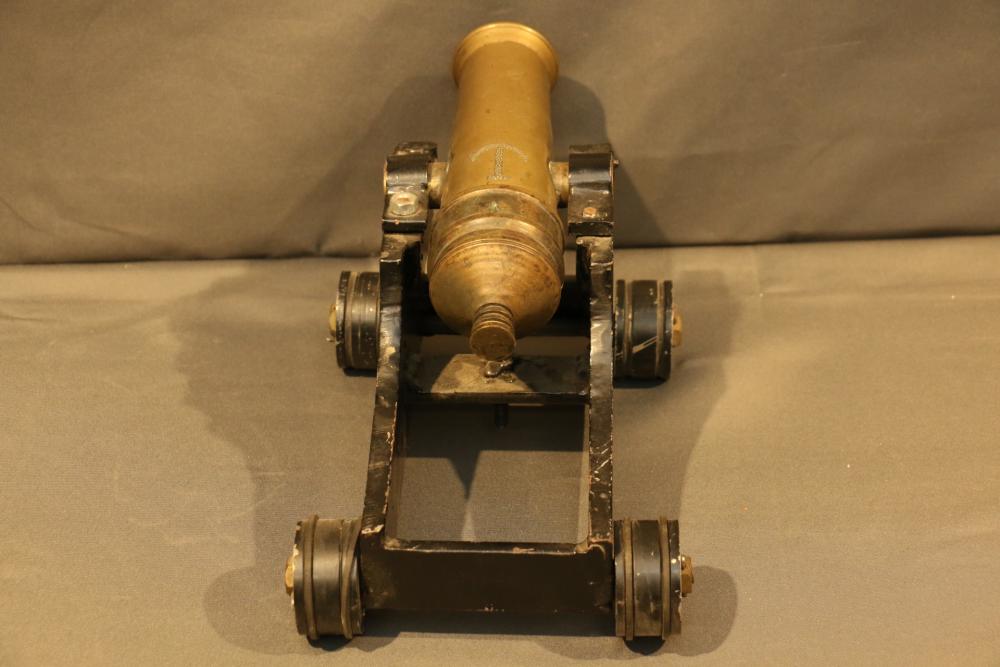 Believed to be bronze miniature cannon on metal carriage, anchor decoration at cannon top, light can be seen through the fuse hole approx 11" X 6.5" X 5.75"T.