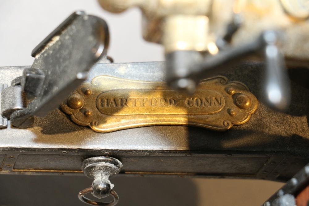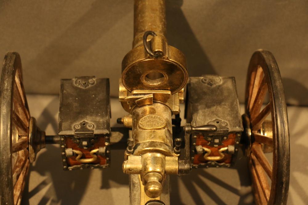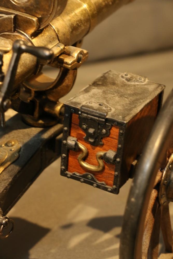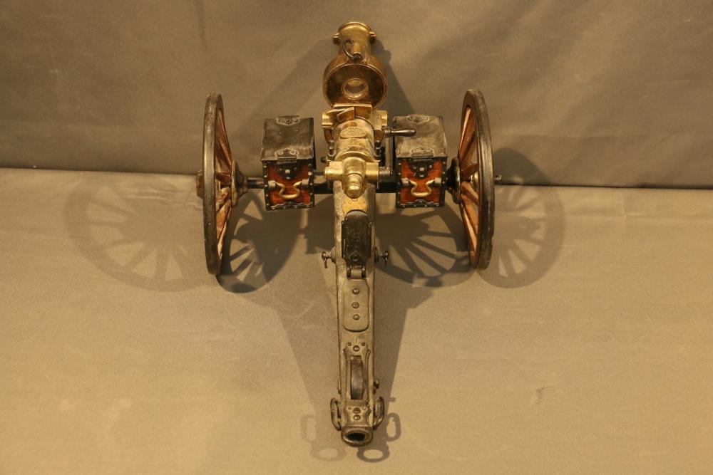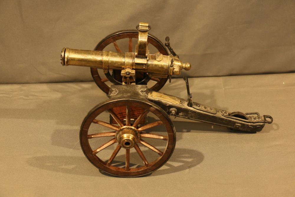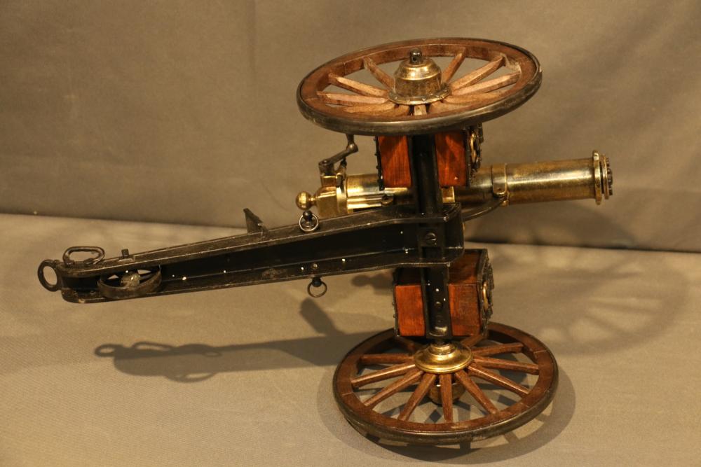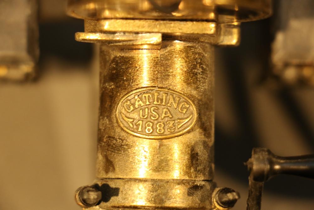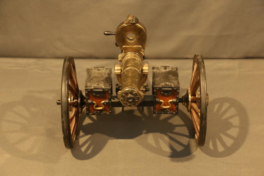 Miniature replica 1883 Military Gatling gun, plaque on cannon "Gatling USA 1883", plaque on carriage "Hartford, Conn", approx 14" X 9" X 8.5"T.
