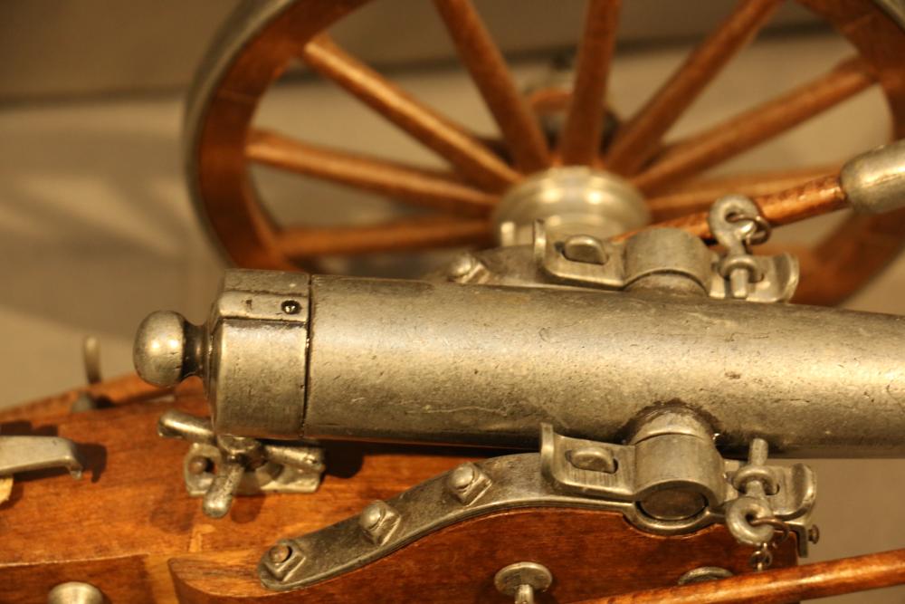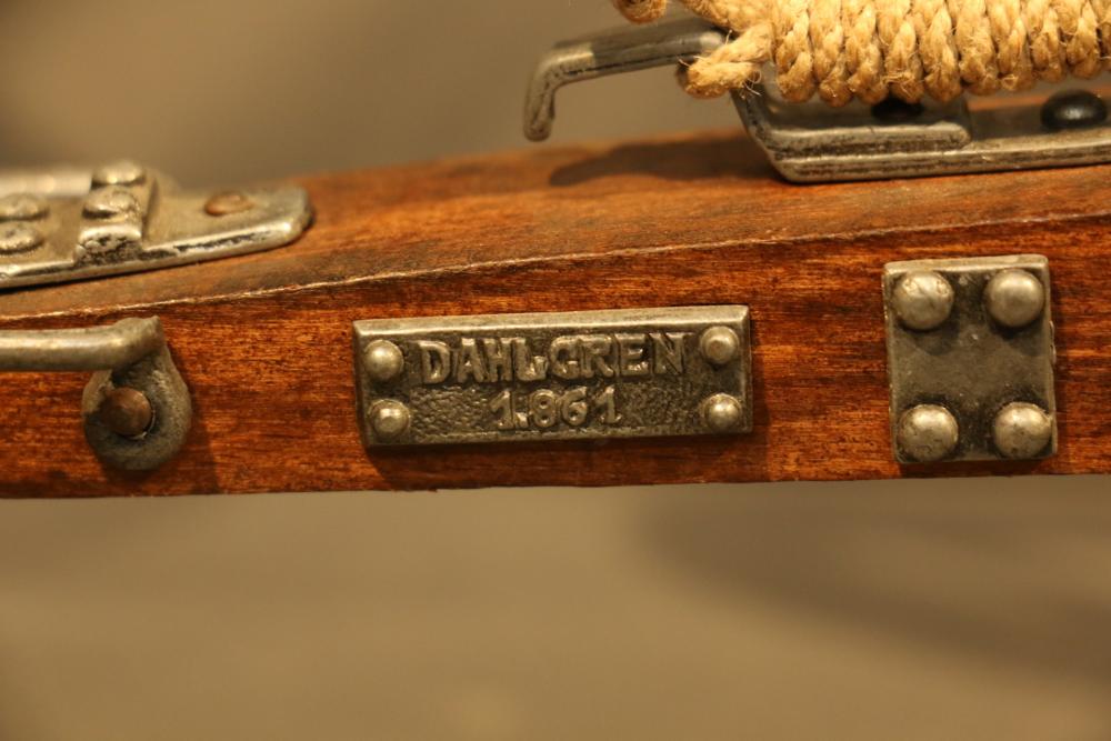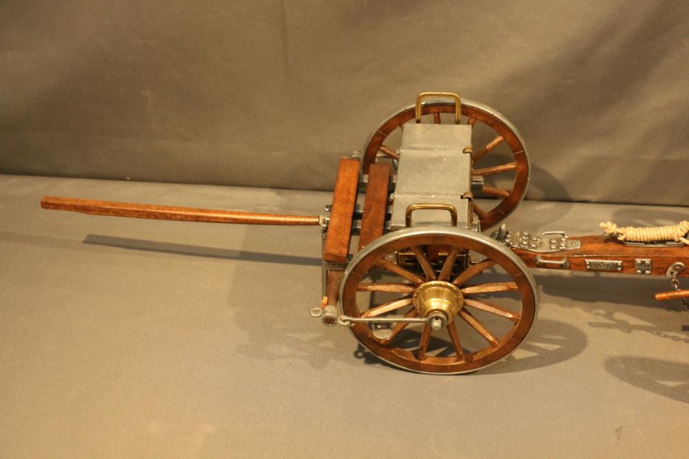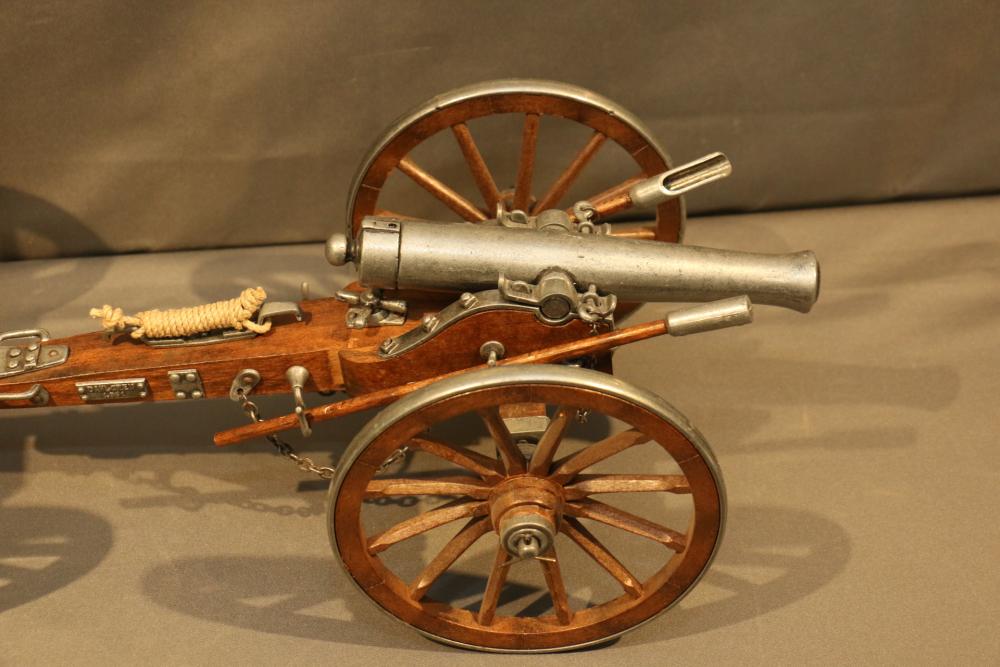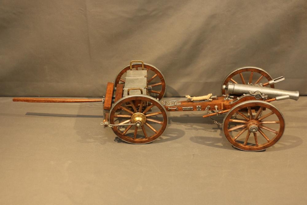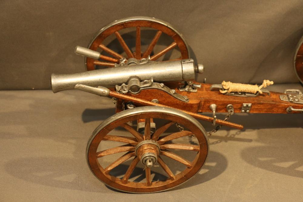 Pewter and wood replica of an American Civil War cannon and limber with label "Dahlgren 1861", approx 29"L X 9.25" X 6.5"T.