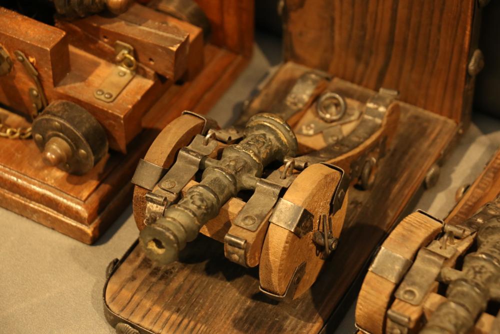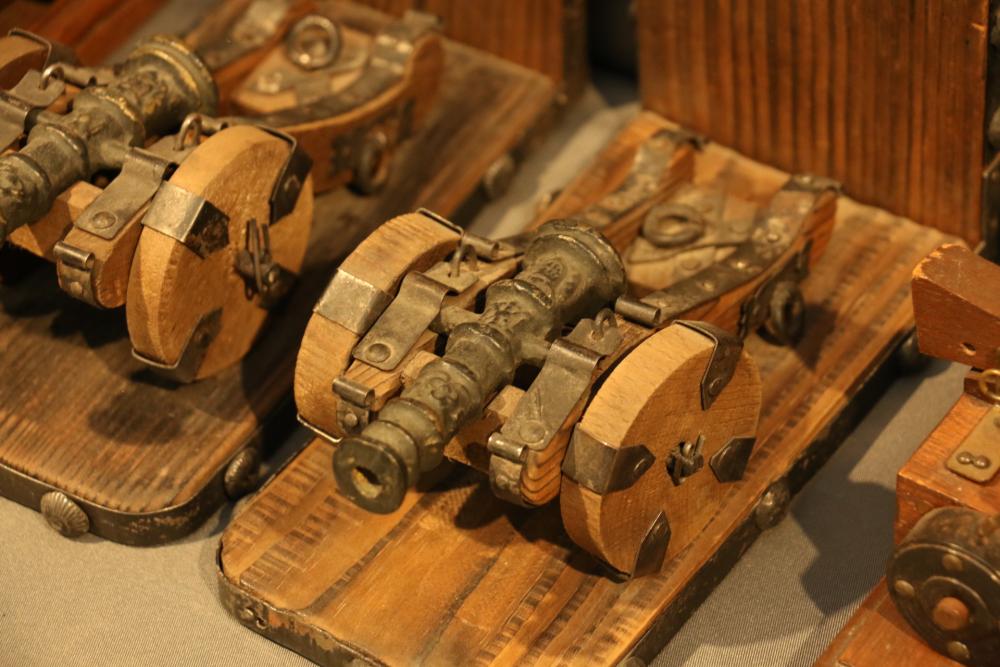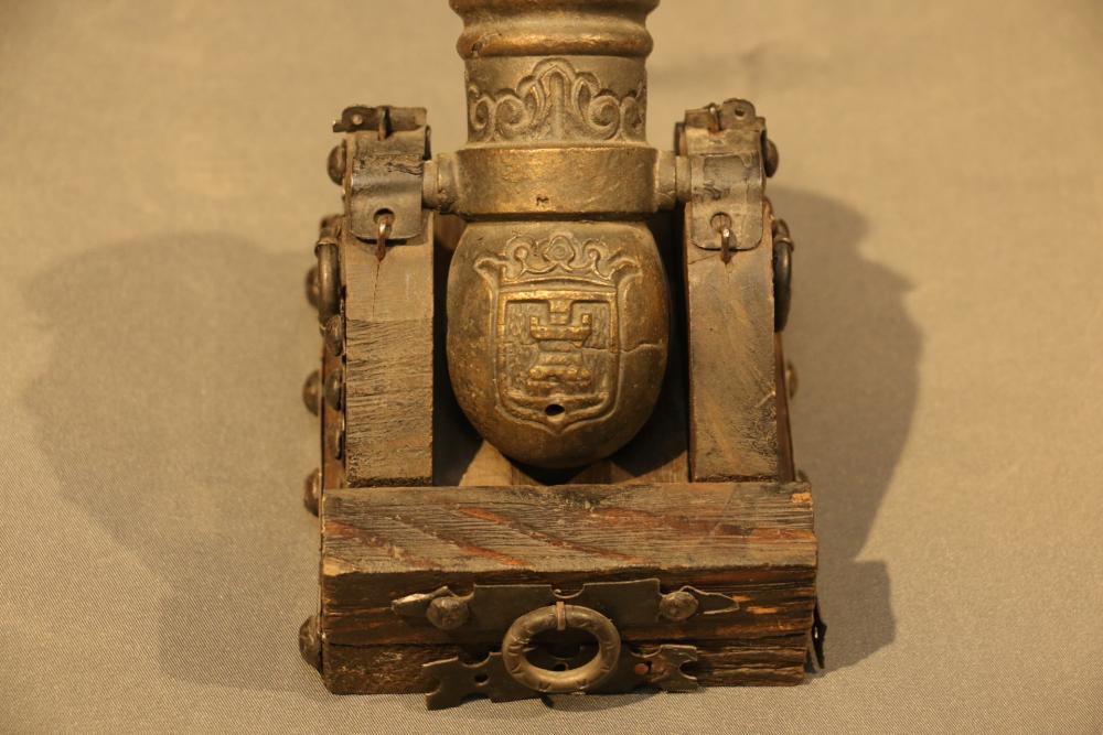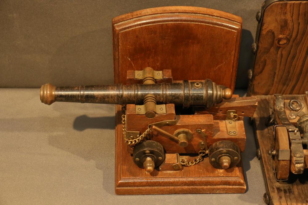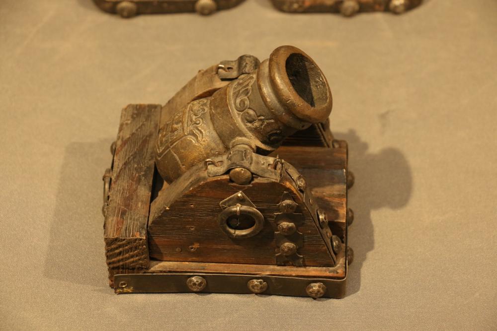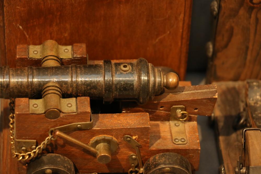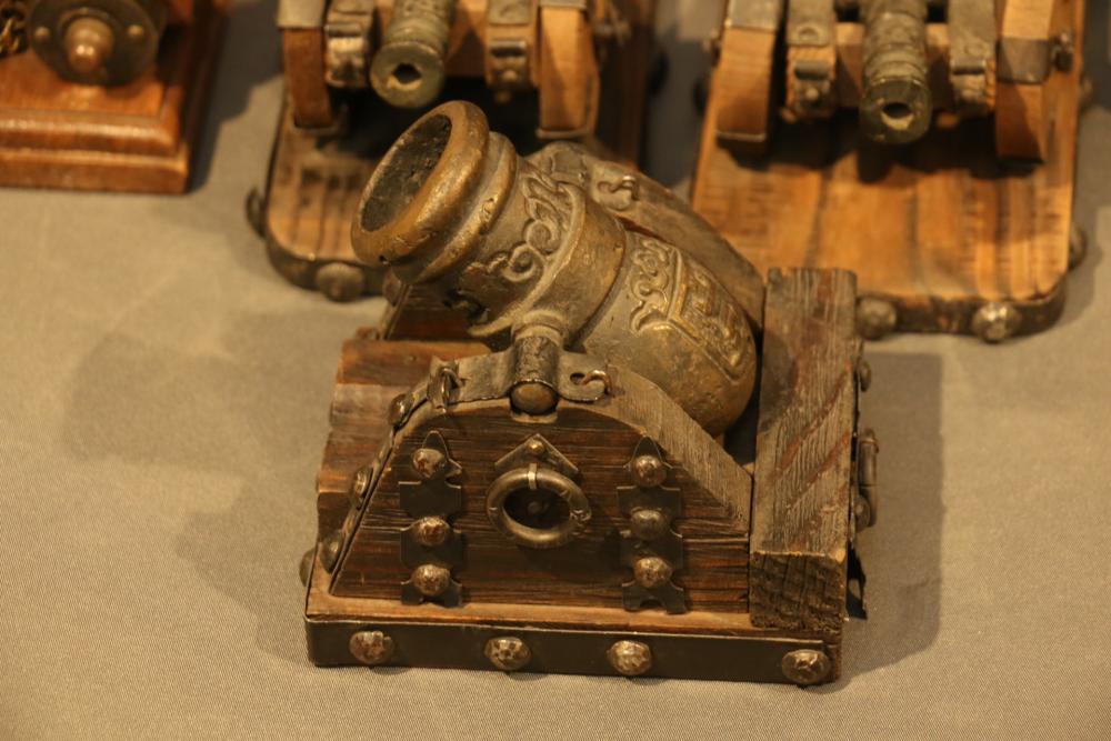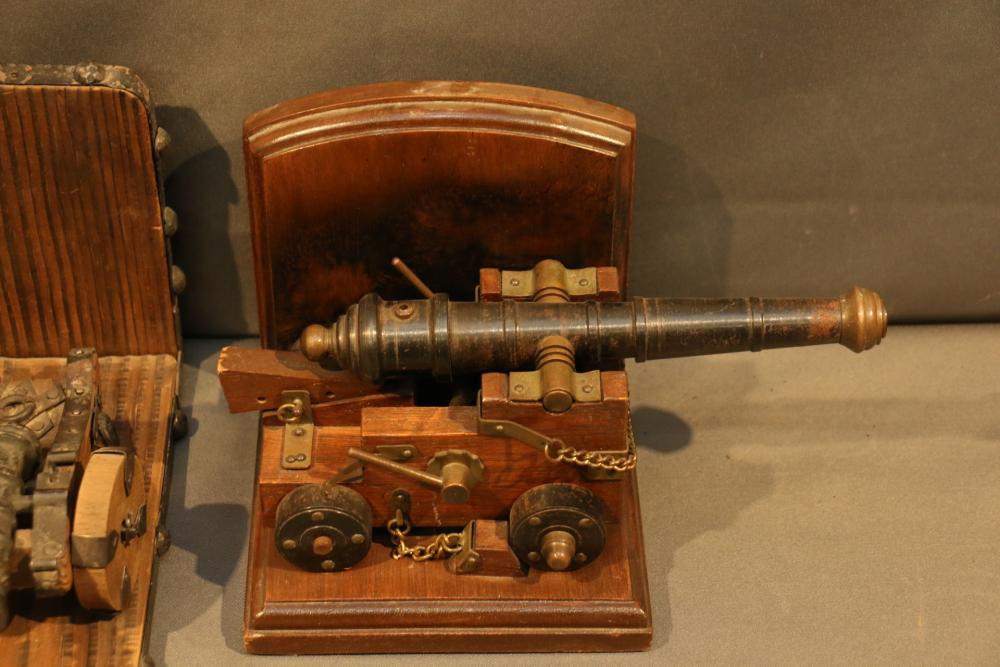 Two pairs of miniature cannons on carriage book ends larger being 8.75" X 5.25" X 5.5"T, also incl one miniature mortar cannon on wood base 4" X 4.75" X 4.5"T.
