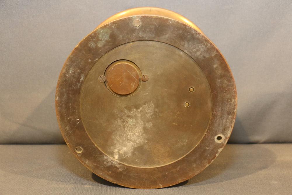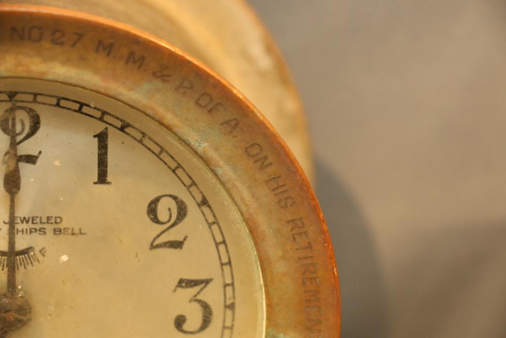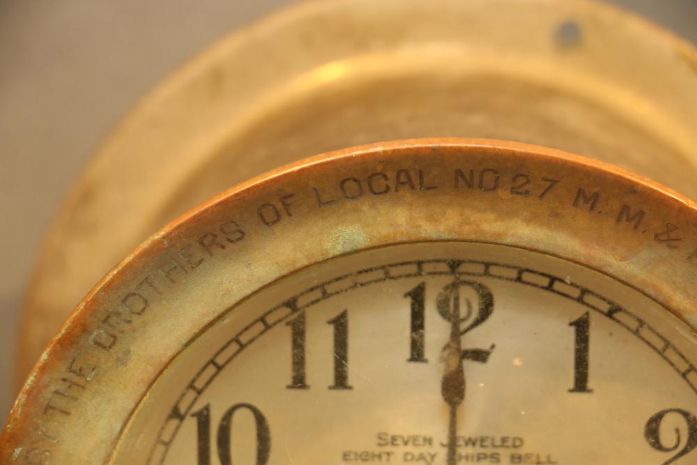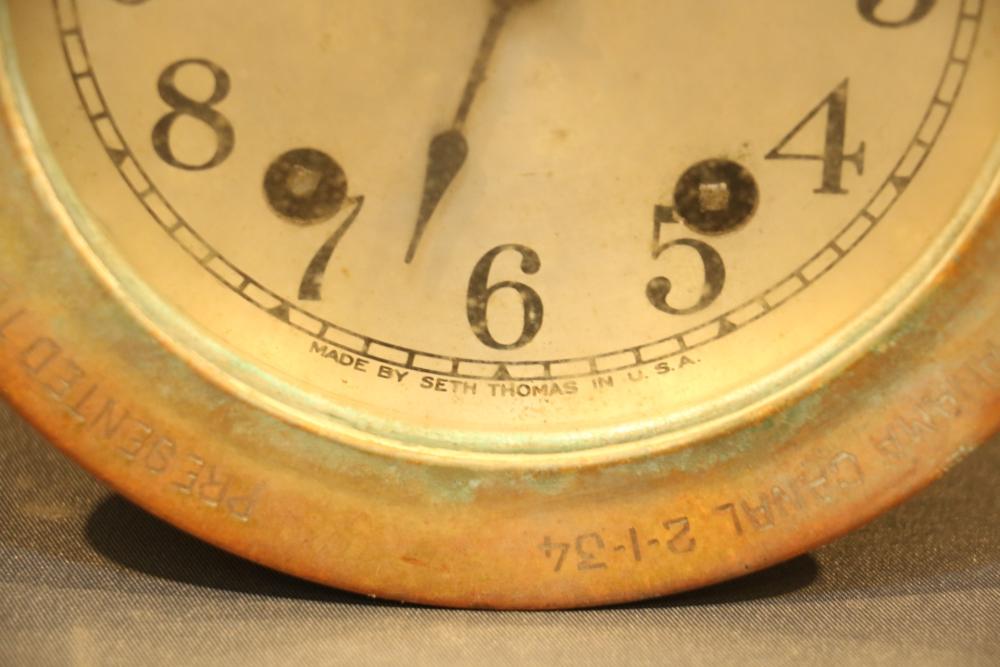 Seth Thomas "Seven Jeweled eight day Ships bell marked around bezel "Presented to Martin T Svenson by The Brothers of Local No 37 M.M. & P. of A. On His Retirement From The Panama Canal 2-1-34", 5.75"dia X 5-3/8".