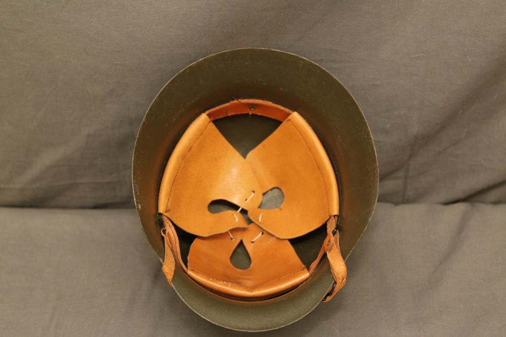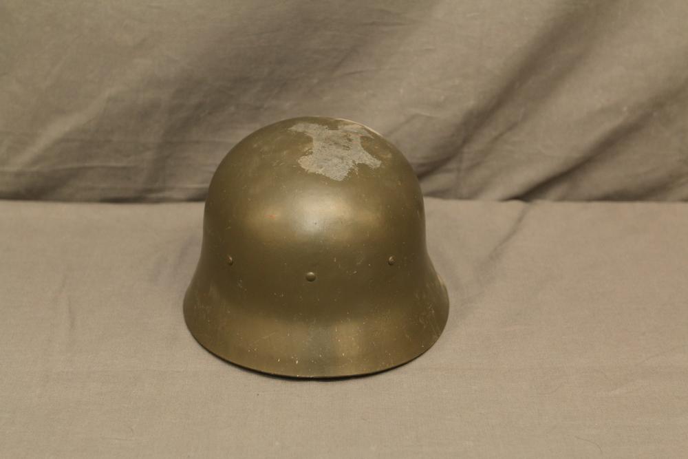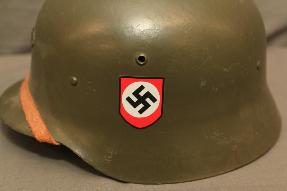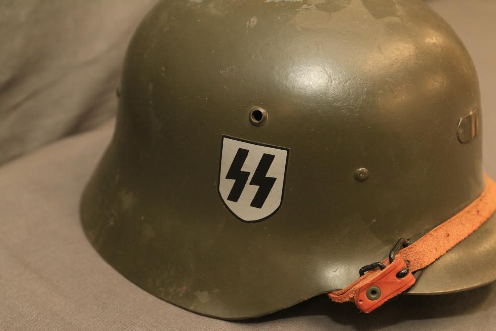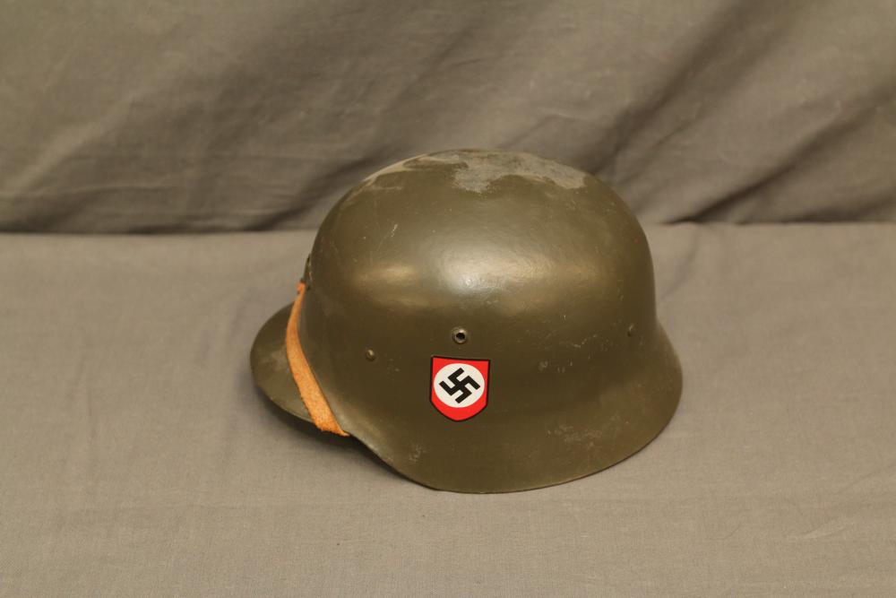 German WWII double decal helmet having swastika on one side and "SS" on other both in shields with helmet liner, and chin strap.