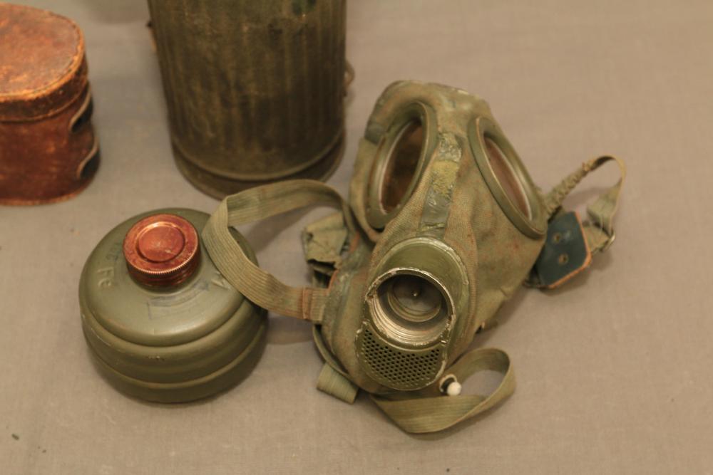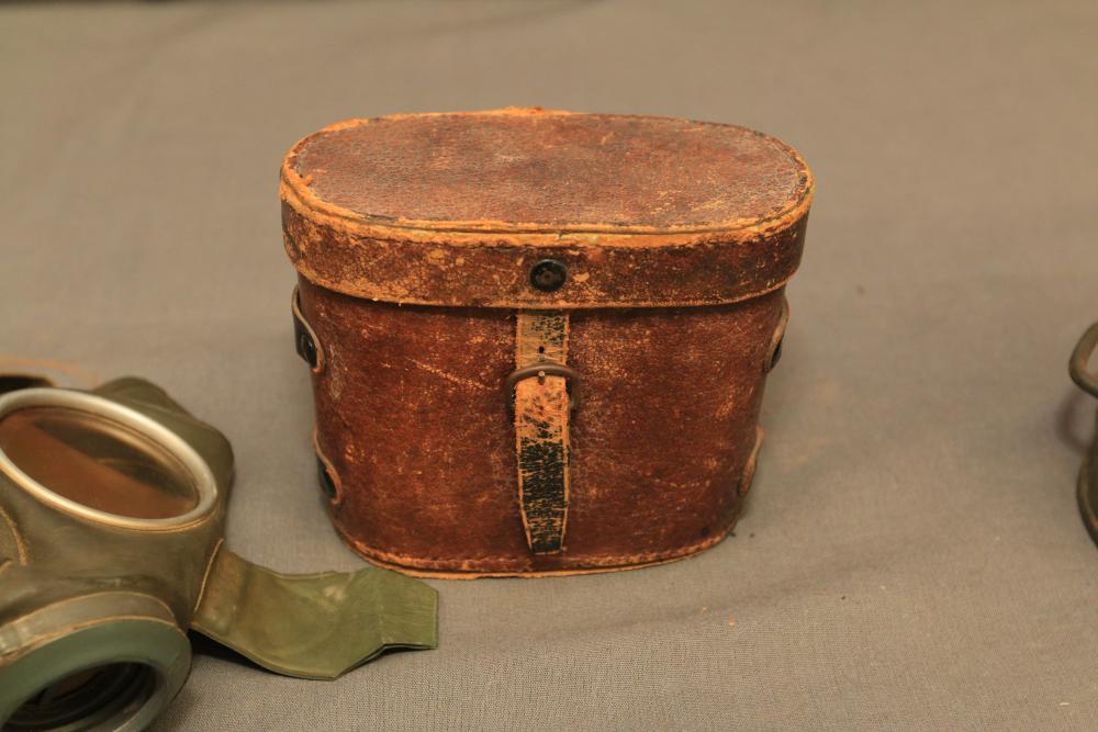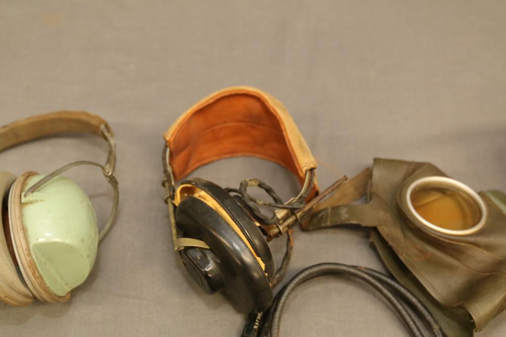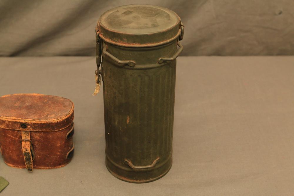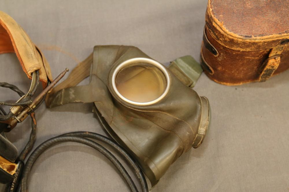 Wehrmacht model long case 1938-1945 maker code on pull strap "FRN44", eye piece marked "1940", also incl smaller gas mask believed to be child's gas mask having stamped Reichsadler on inside, headphones with canvas cover, Willson "sound barrier" ear muffs, binoculars marked on eye piece "Naval Officer 3X50".