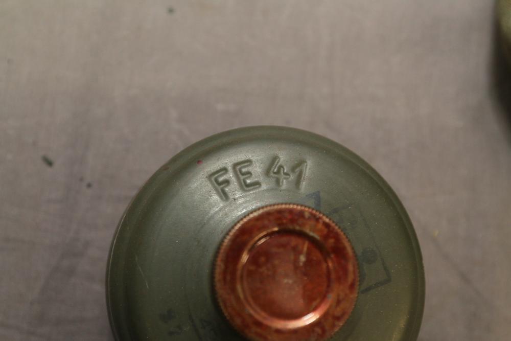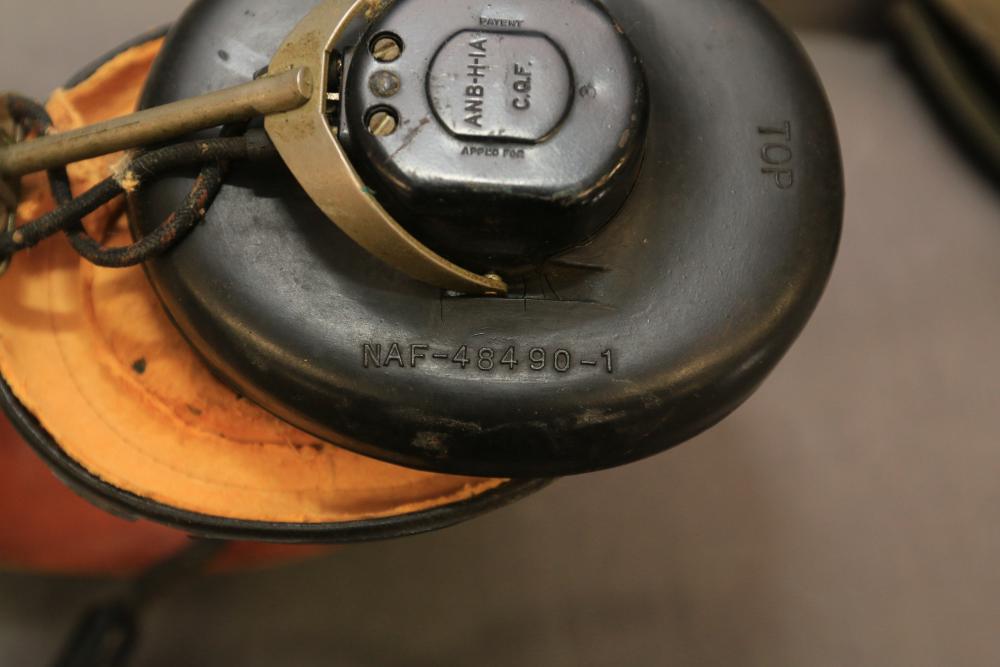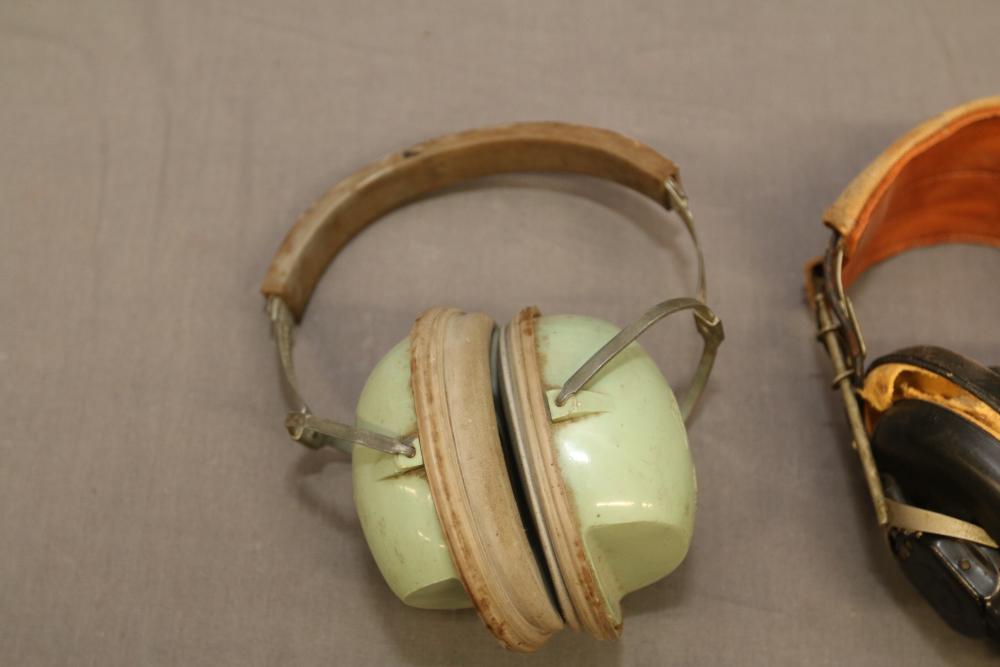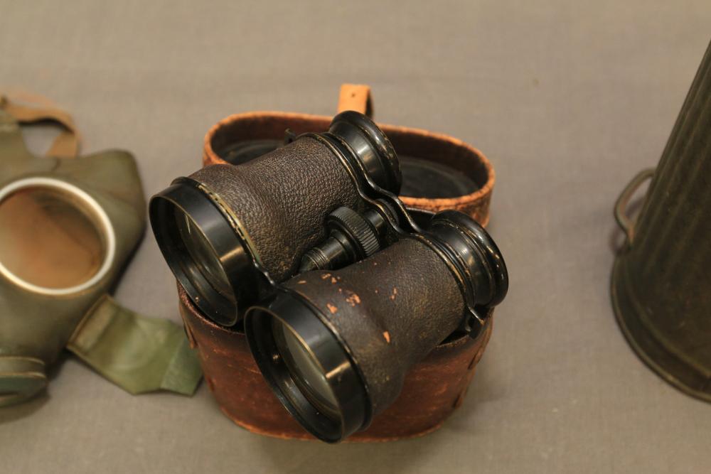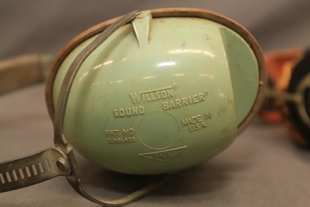 Wehrmacht model long case 1938-1945 maker code on pull strap "FRN44", eye piece marked "1940", also incl smaller gas mask believed to be child's gas mask having stamped Reichsadler on inside, headphones with canvas cover, Willson "sound barrier" ear muffs, binoculars marked on eye piece "Naval Officer 3X50".
