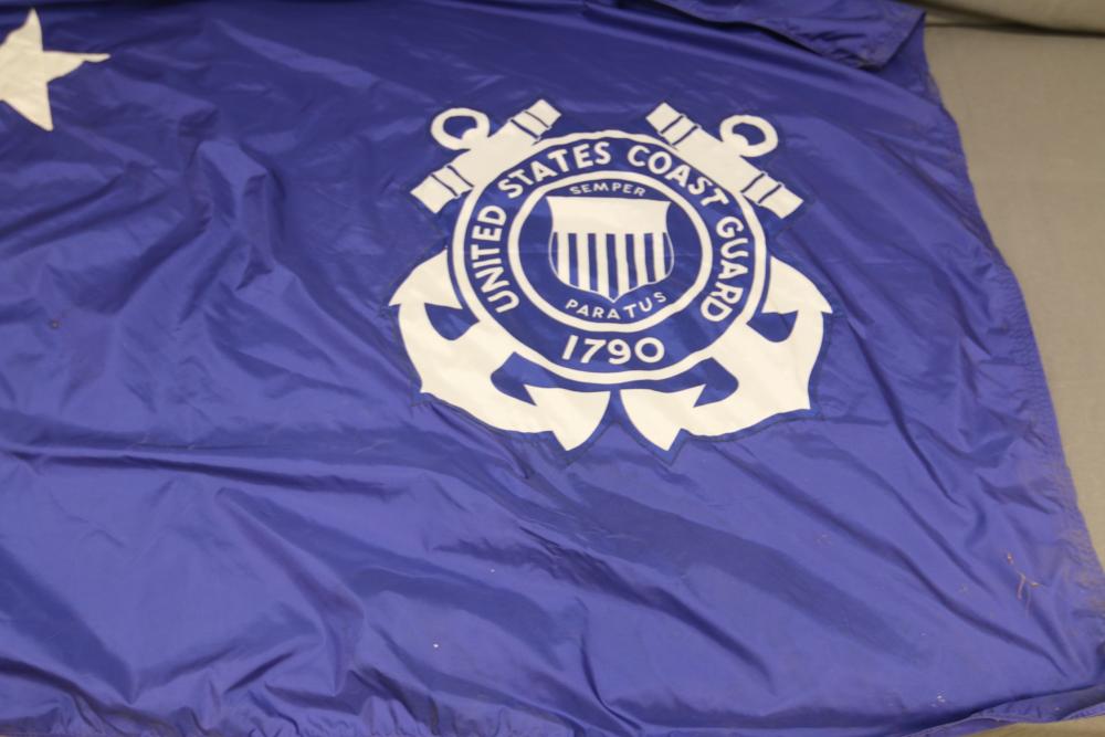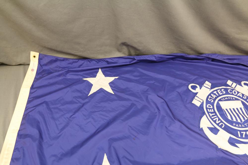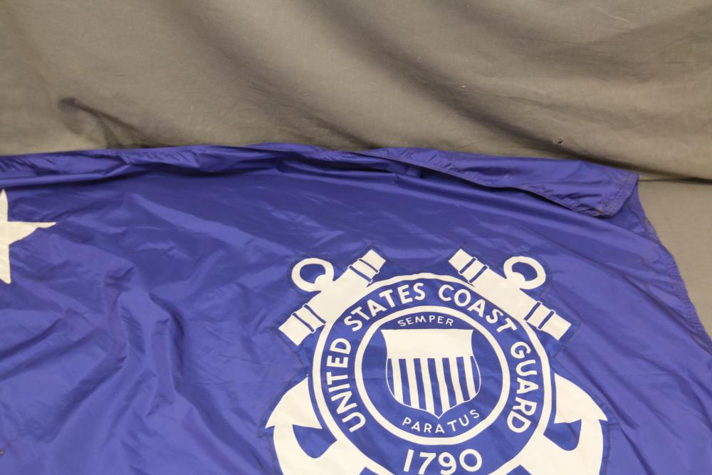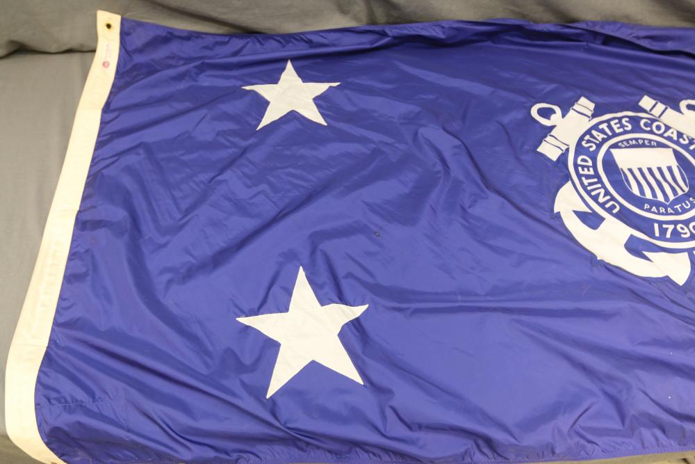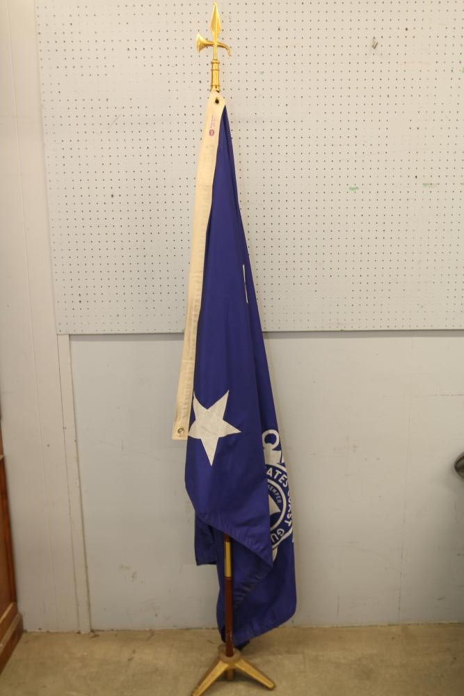 Nylglo 100% nylon Coast guard flag on flagpole, marked next to tag "Rear Admiral 6", 54.5" X 42", flag pole having halberd style finial 86.5"T.