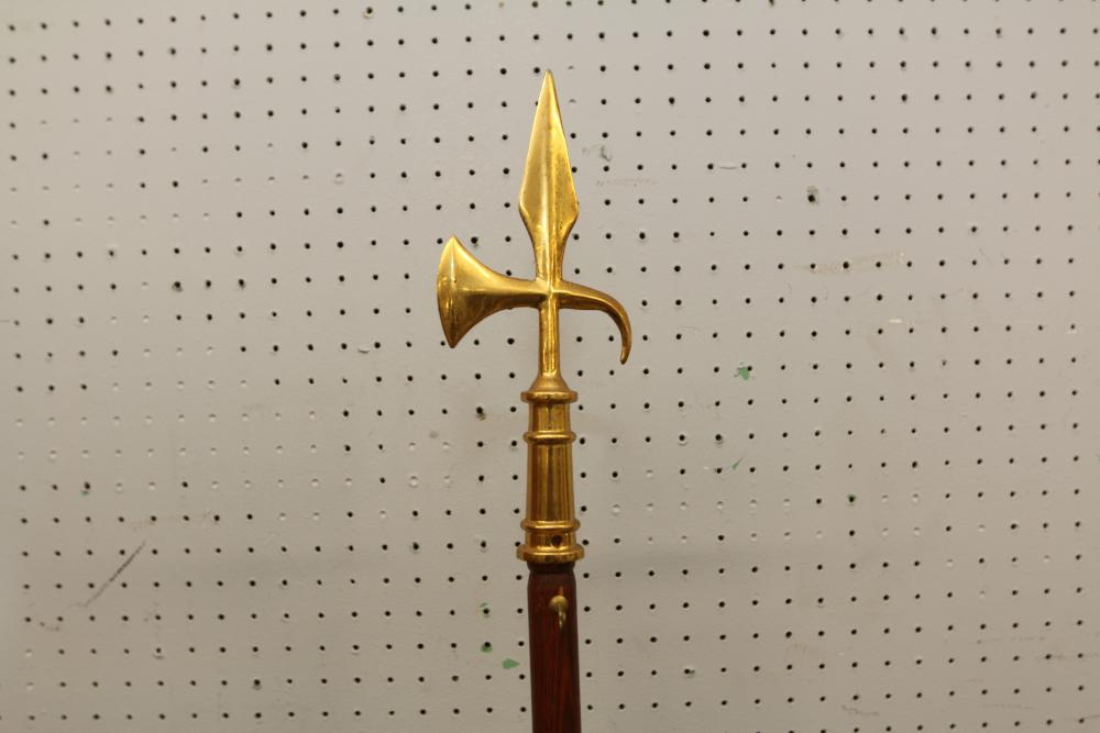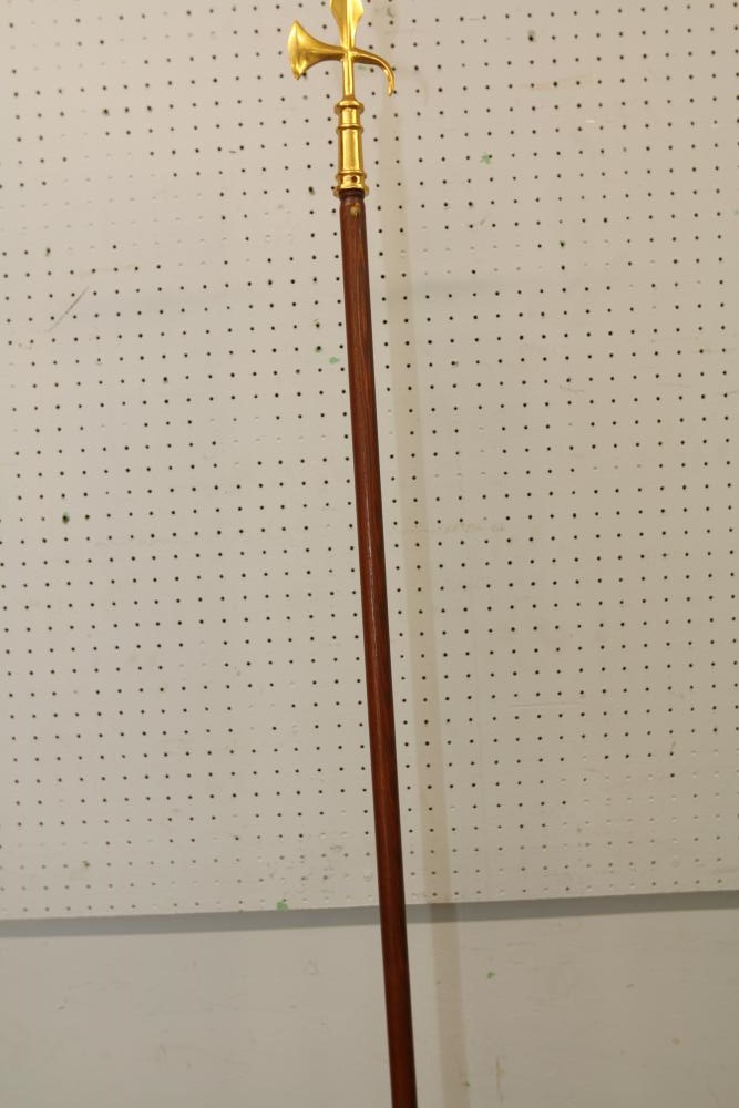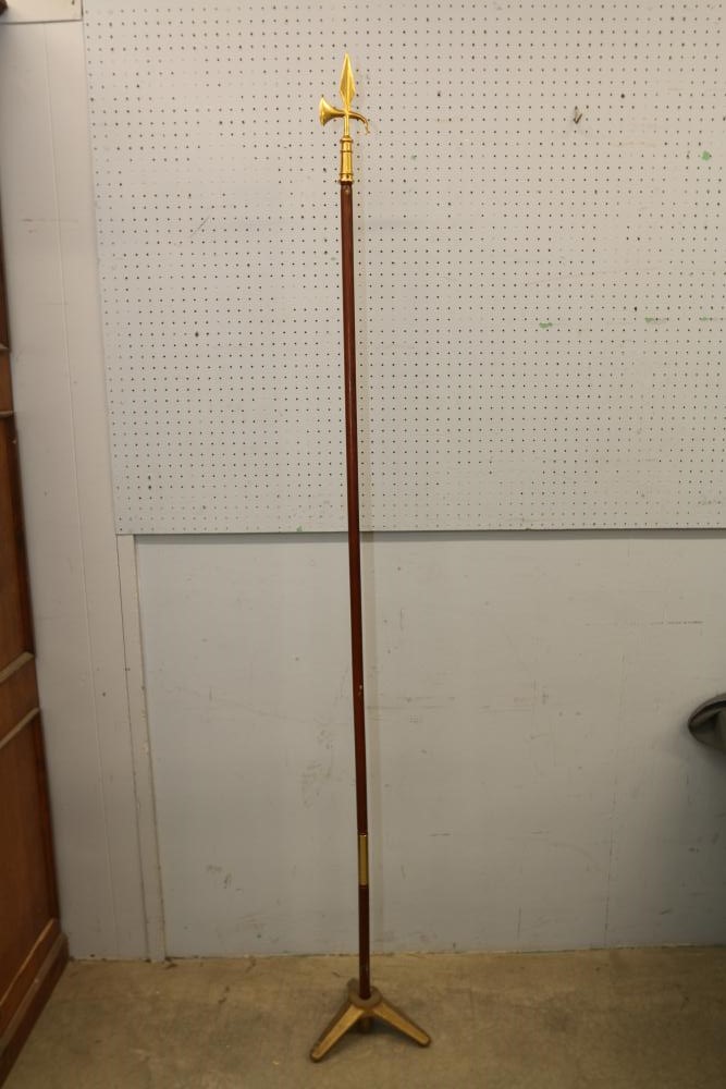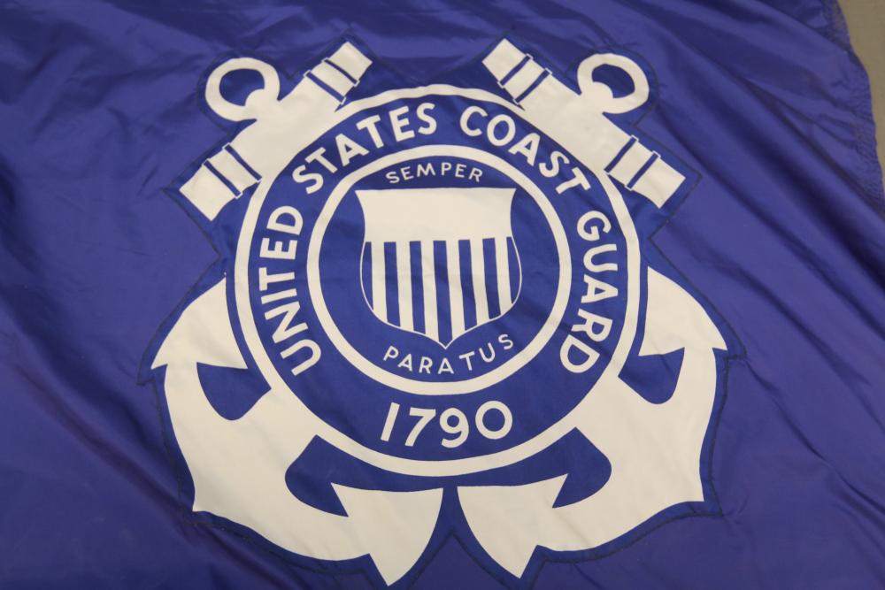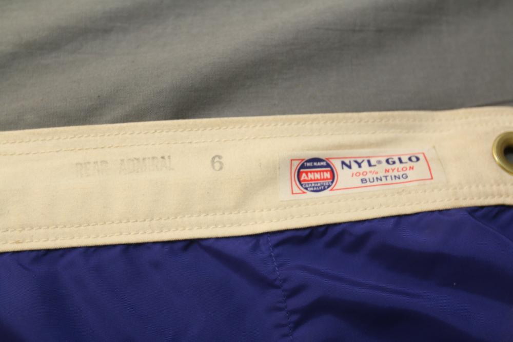 Nylglo 100% nylon Coast guard flag on flagpole, marked next to tag "Rear Admiral 6", 54.5" X 42", flag pole having halberd style finial 86.5"T.