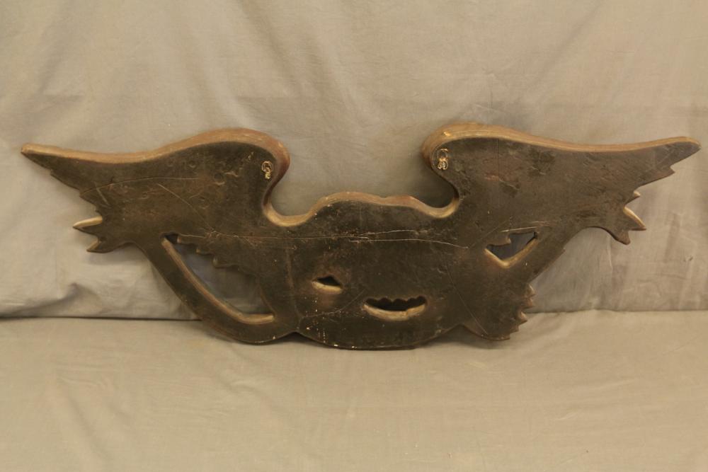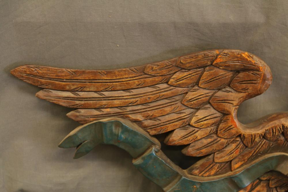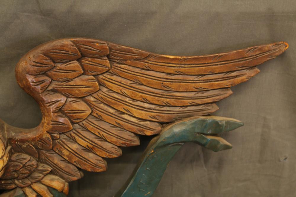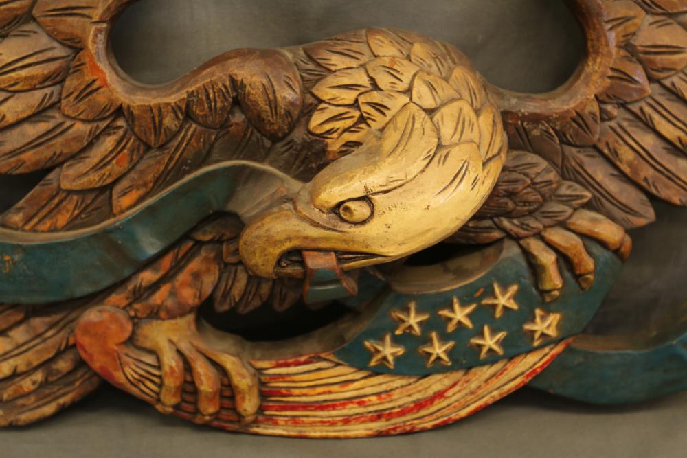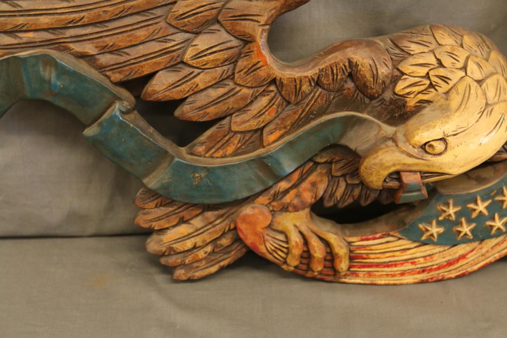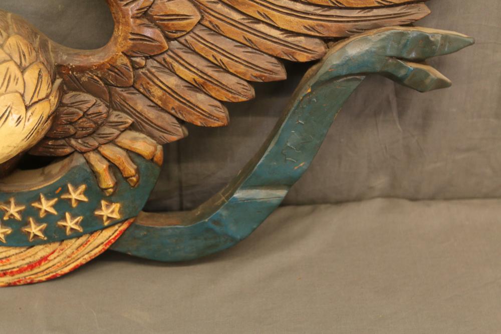 Carved wooden wall hanging of bald eagle having American flag clenched in talons, approx 46" x 17".