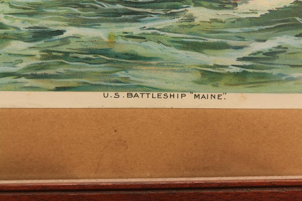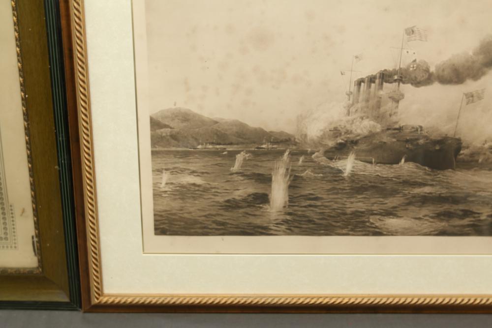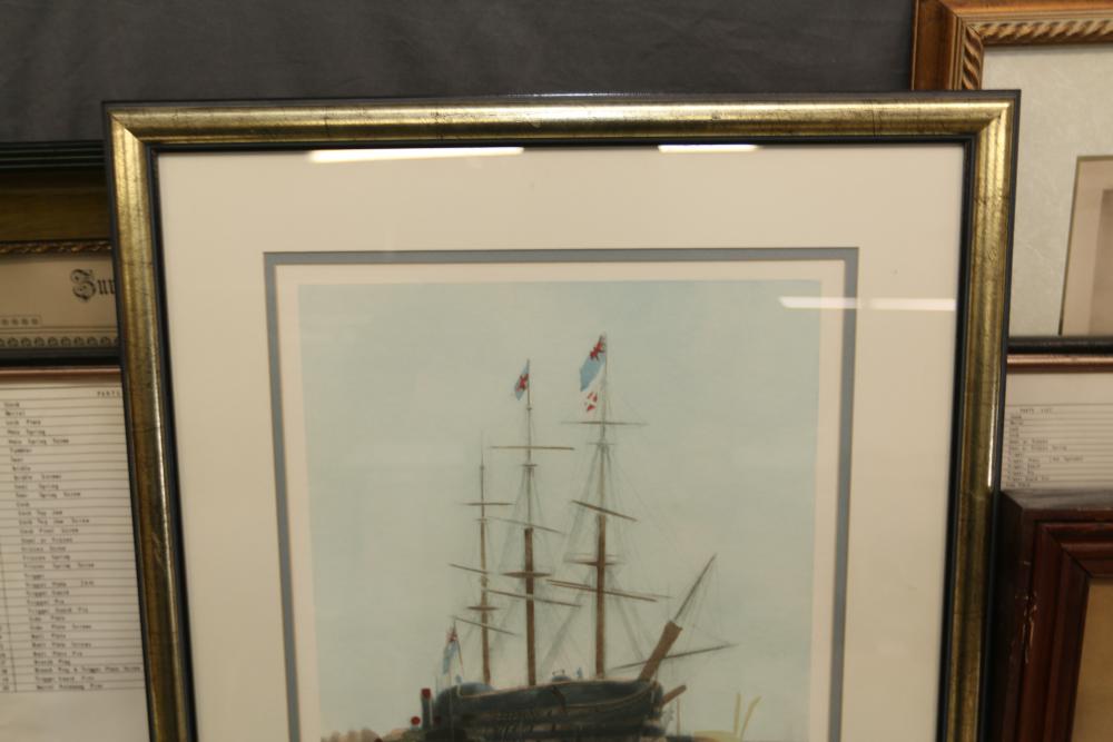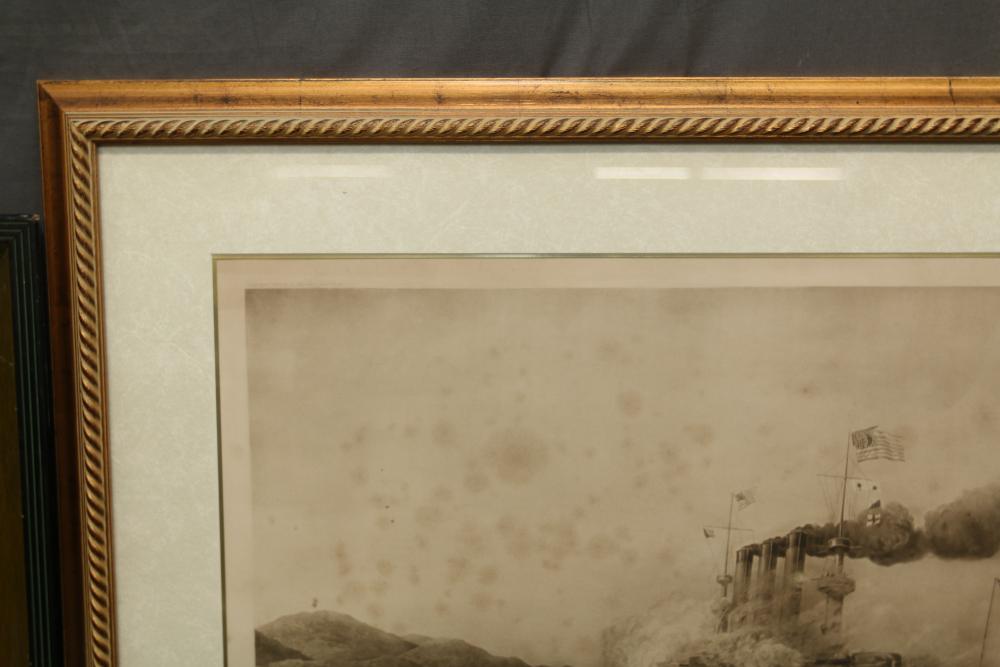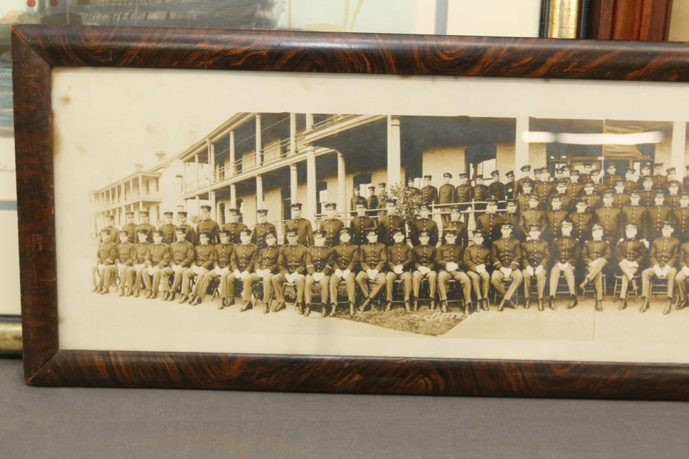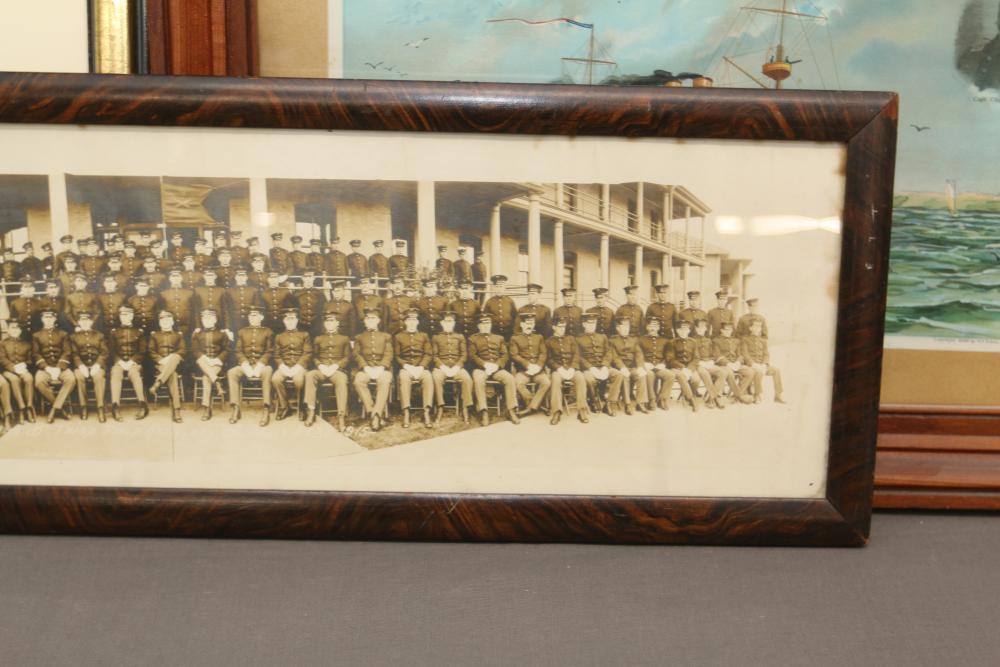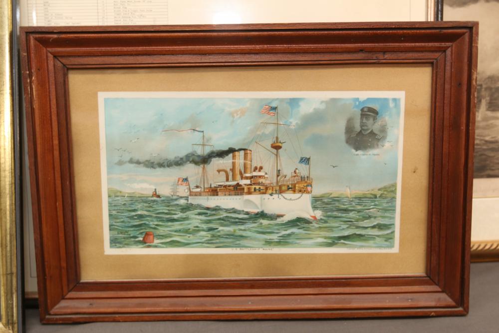 Framed prints incl "U.S.Battleship "Maine", "Battery "B" Third Field Artillery U.S. Army Feby 1915", "naval scene pencil signed lower right illegible, signed in print appearing to read "A.R. Dugi** 1898", 1899-1901 class photo, ship scene marked at bottom "The Last Journey of "Victory", 1922.", assembly diagram of "Replica "Brown Bess" Long Land Pattern British Military Muskey", and exploded diagram of "Replica "Brown Bess" Long Land Pattern British Military Musket", etc largest being 36.25" X 27.5". Paper weights not included.