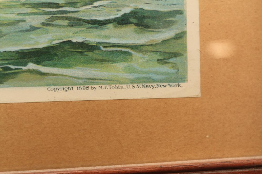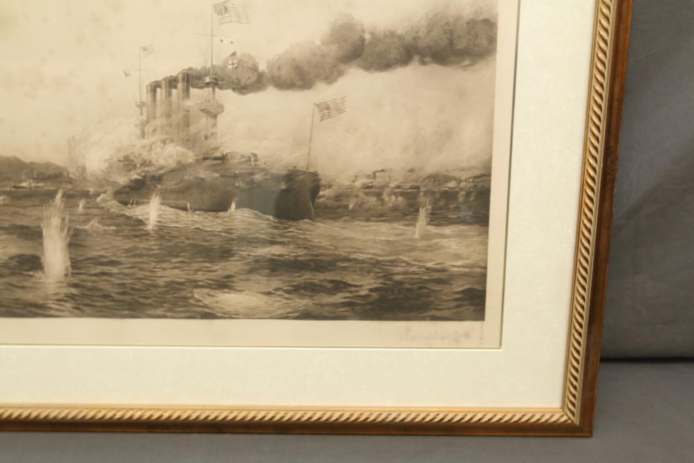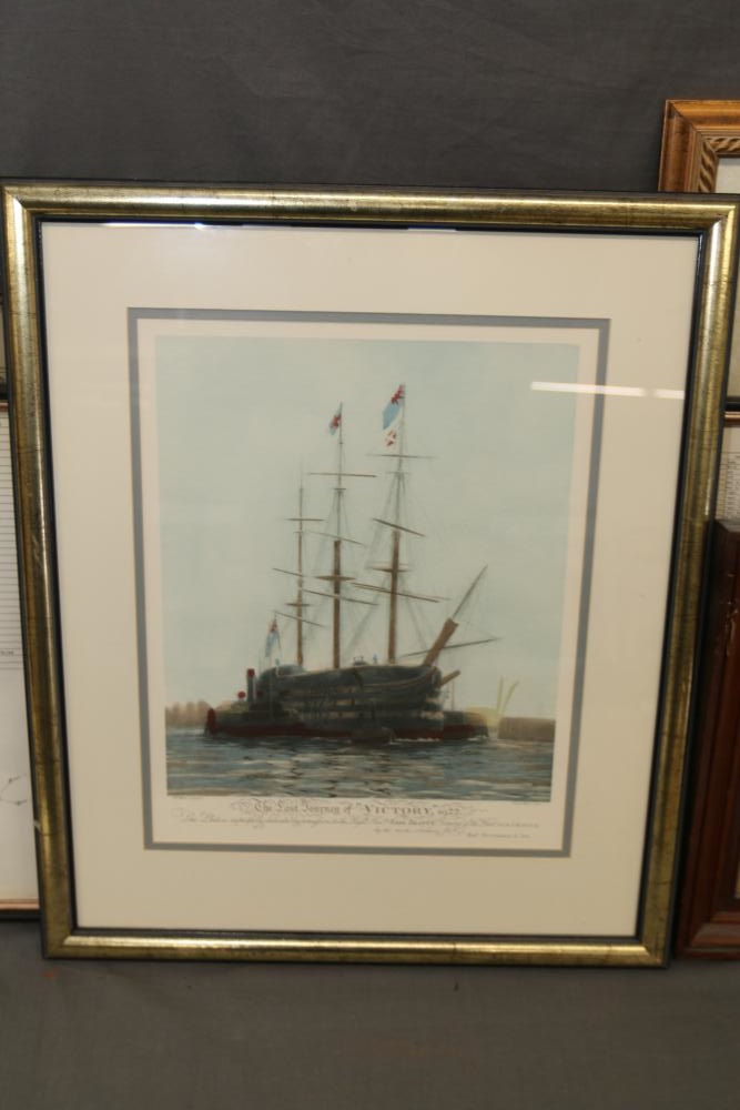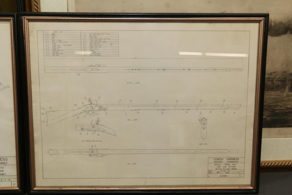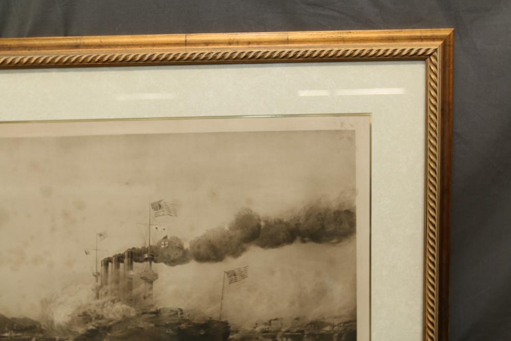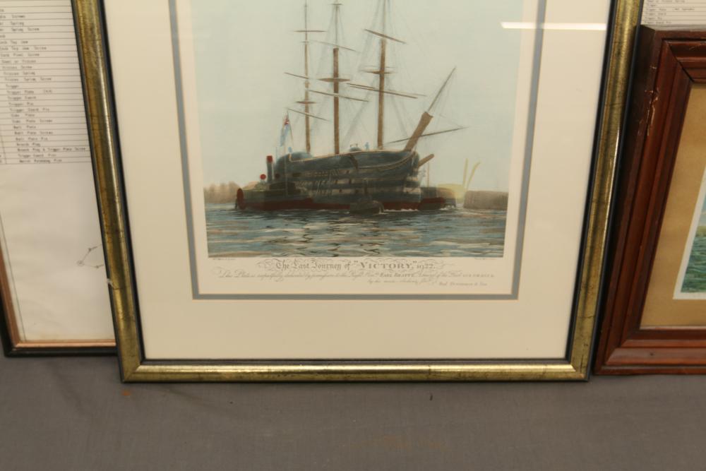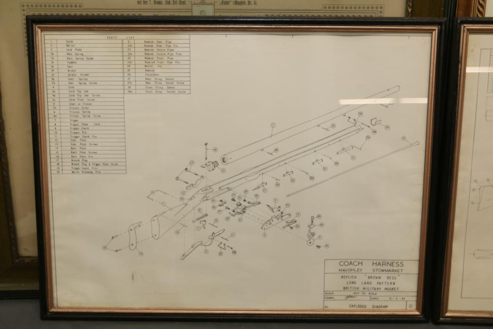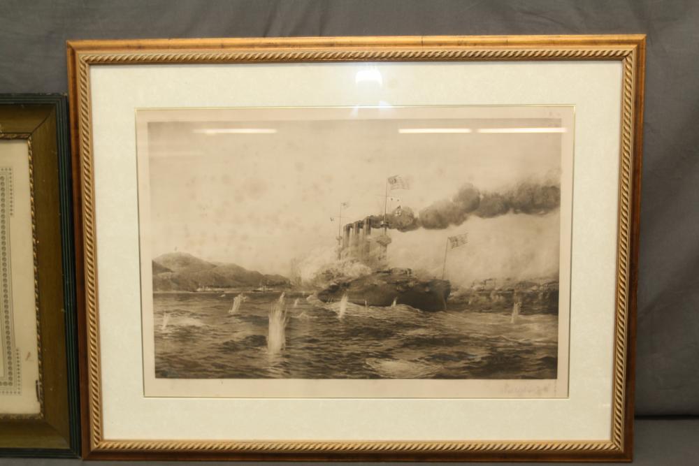 Framed prints incl "U.S.Battleship "Maine", "Battery "B" Third Field Artillery U.S. Army Feby 1915", "naval scene pencil signed lower right illegible, signed in print appearing to read "A.R. Dugi** 1898", 1899-1901 class photo, ship scene marked at bottom "The Last Journey of "Victory", 1922.", assembly diagram of "Replica "Brown Bess" Long Land Pattern British Military Muskey", and exploded diagram of "Replica "Brown Bess" Long Land Pattern British Military Musket", etc largest being 36.25" X 27.5". Paper weights not included.