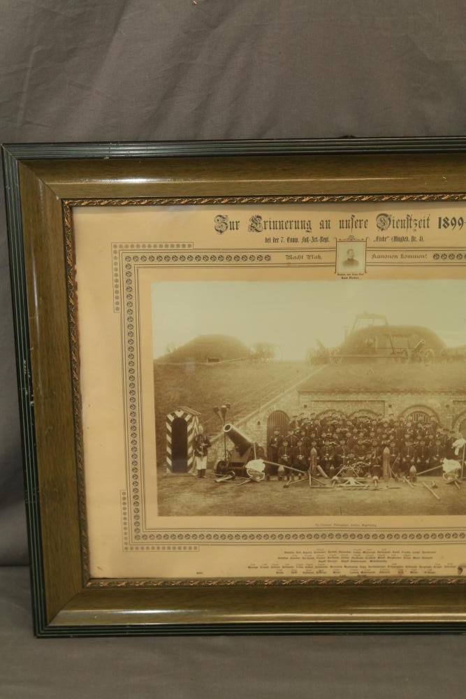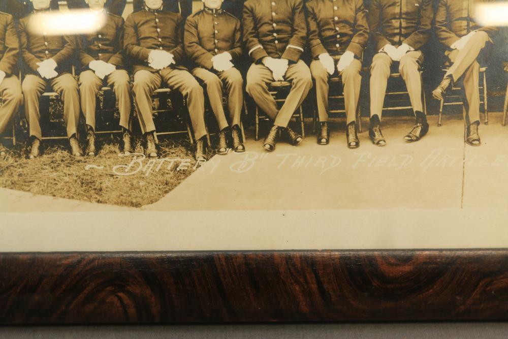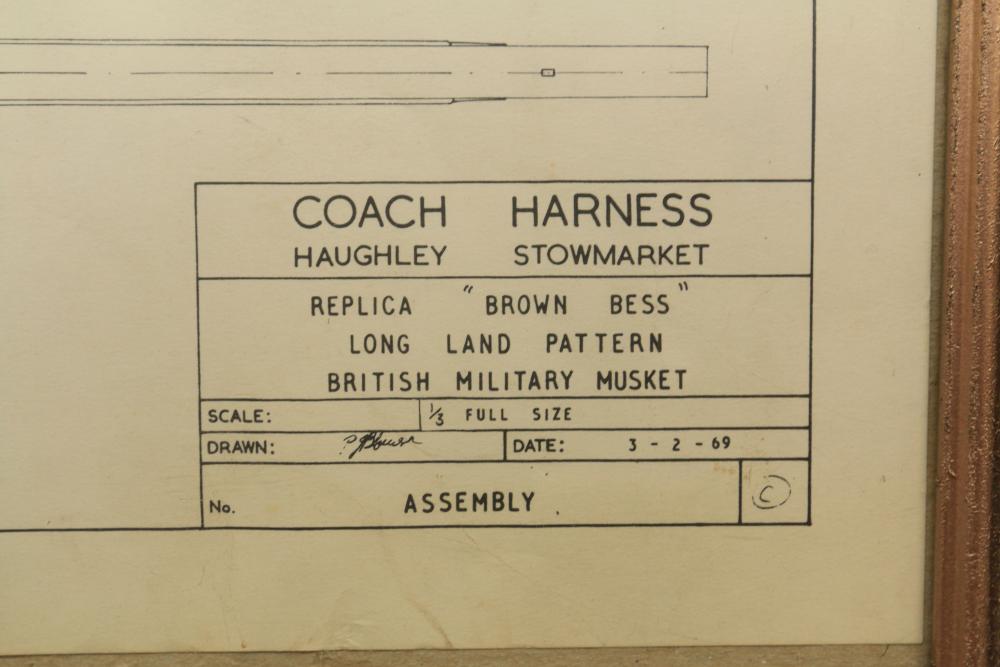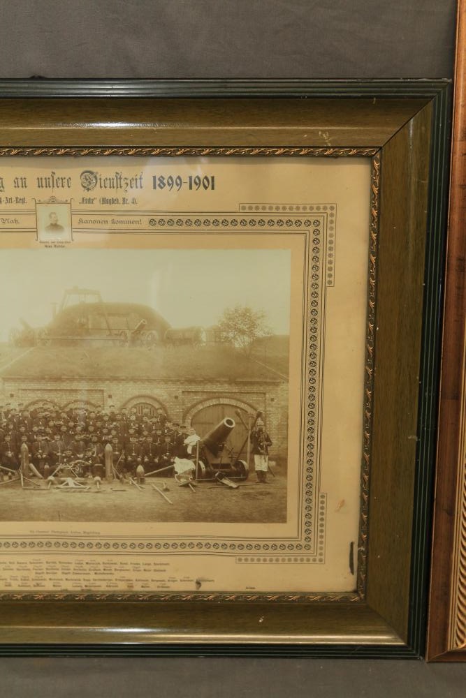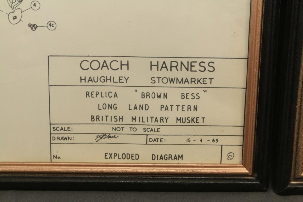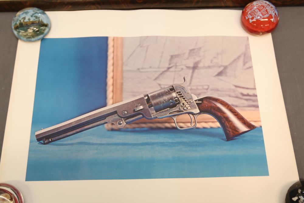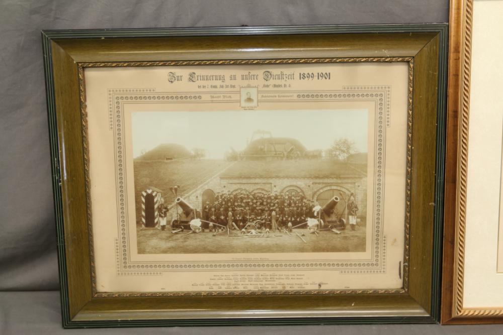 Framed prints incl "U.S.Battleship "Maine", "Battery "B" Third Field Artillery U.S. Army Feby 1915", "naval scene pencil signed lower right illegible, signed in print appearing to read "A.R. Dugi** 1898", 1899-1901 class photo, ship scene marked at bottom "The Last Journey of "Victory", 1922.", assembly diagram of "Replica "Brown Bess" Long Land Pattern British Military Muskey", and exploded diagram of "Replica "Brown Bess" Long Land Pattern British Military Musket", etc largest being 36.25" X 27.5". Paper weights not included.