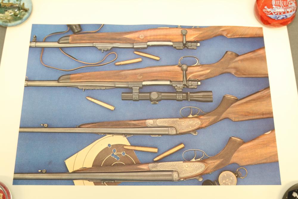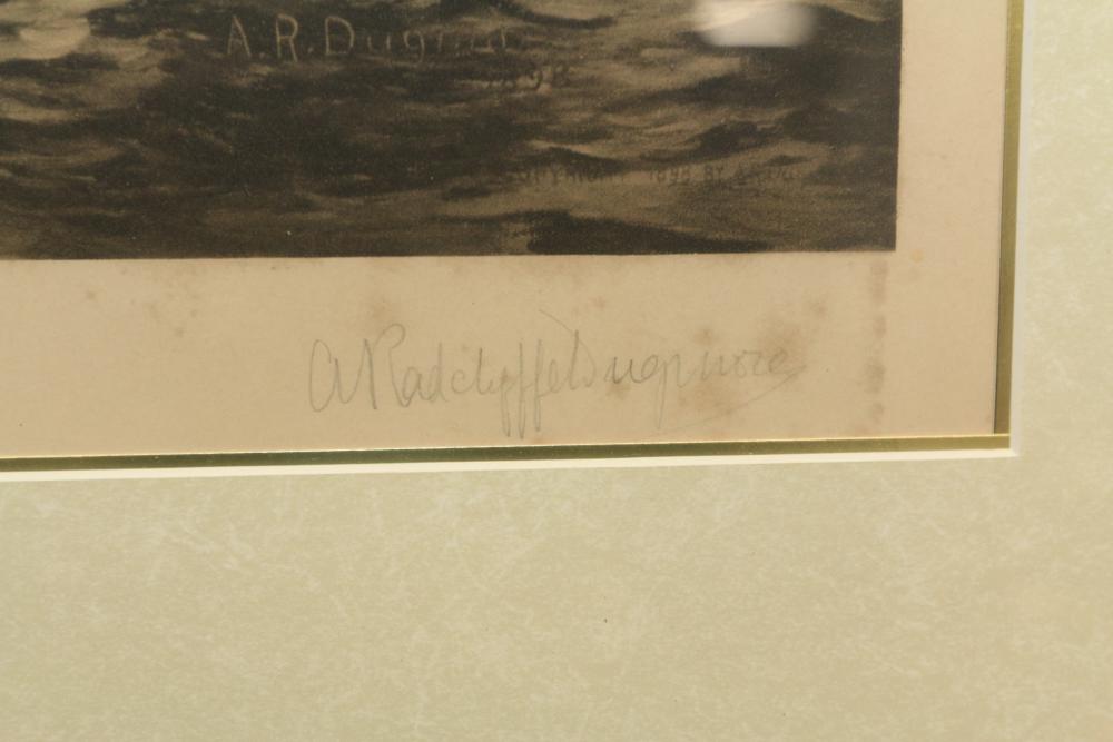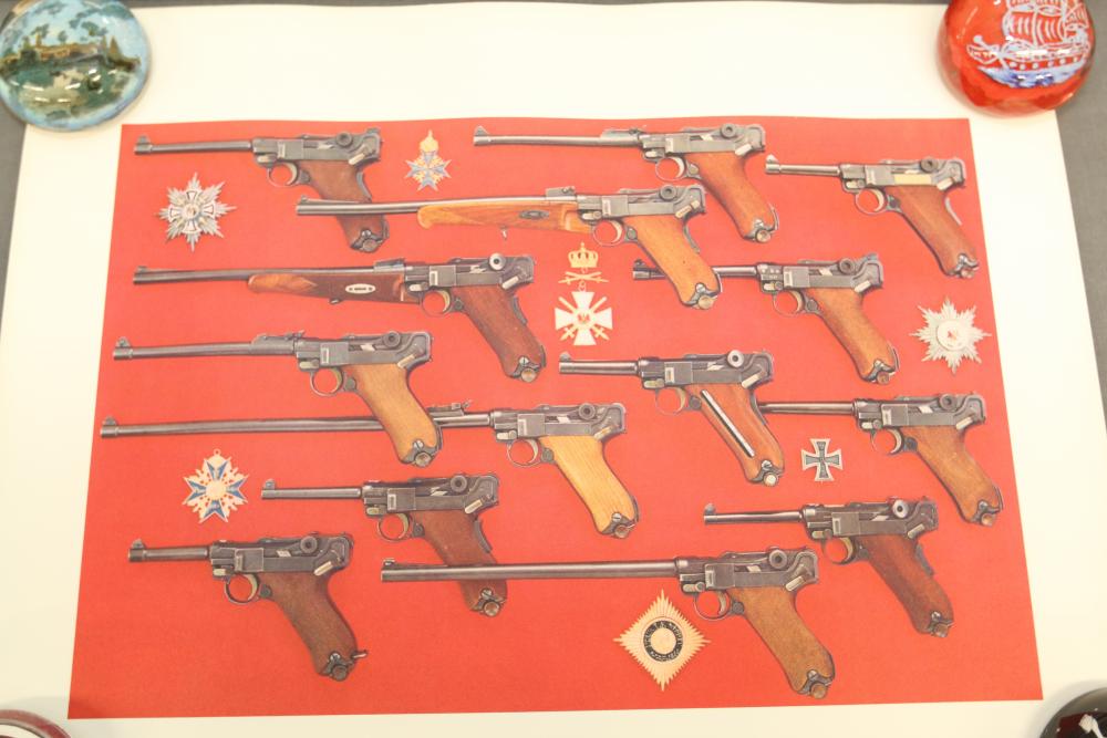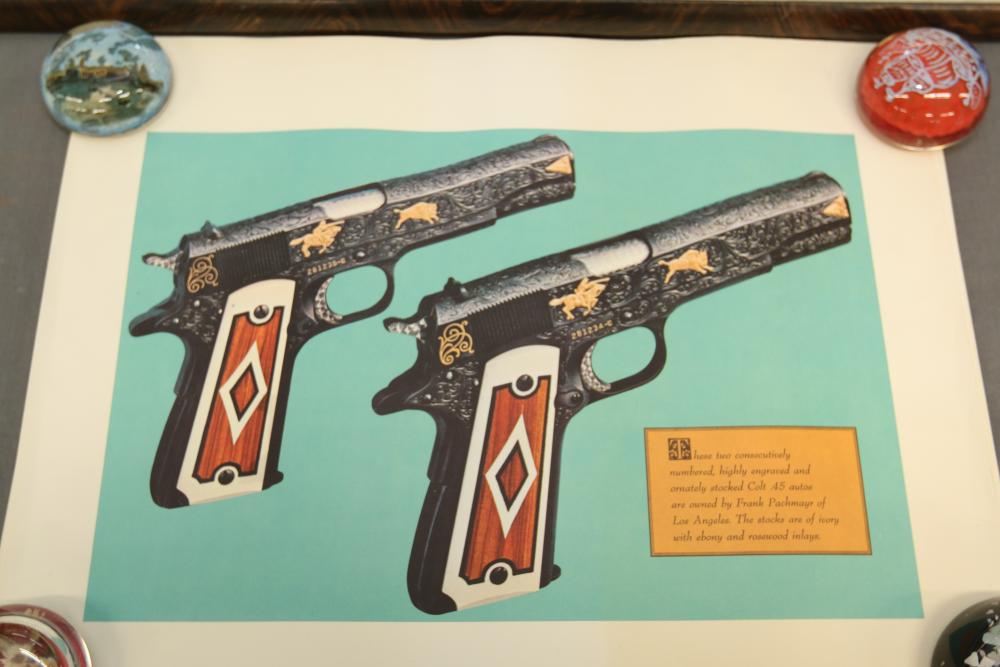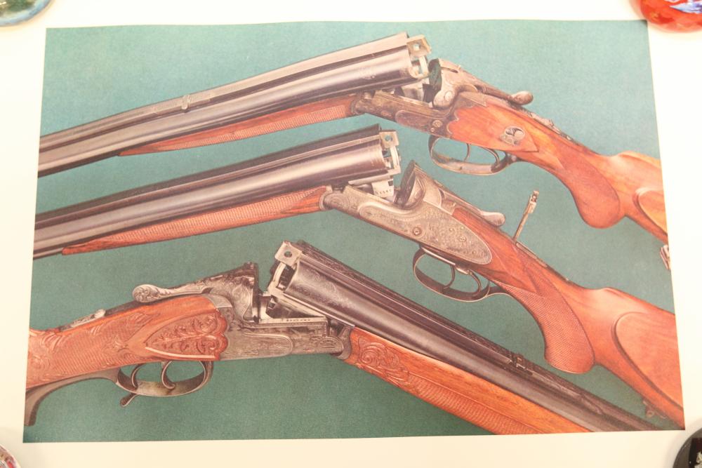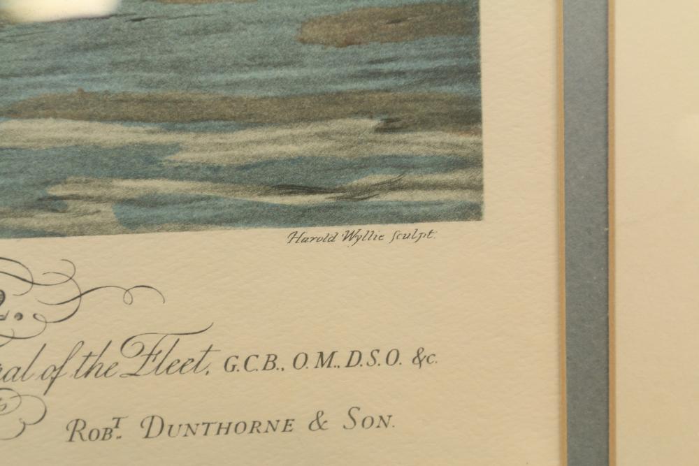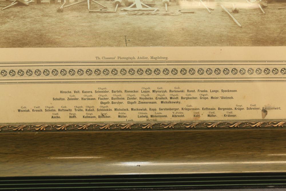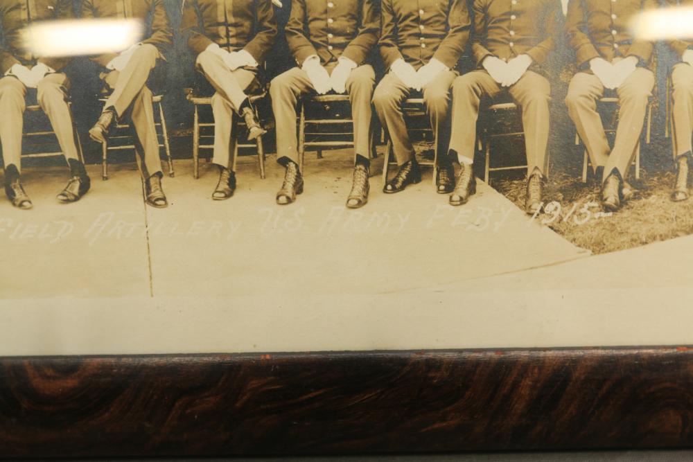 Framed prints incl "U.S.Battleship "Maine", "Battery "B" Third Field Artillery U.S. Army Feby 1915", "naval scene pencil signed lower right illegible, signed in print appearing to read "A.R. Dugi** 1898", 1899-1901 class photo, ship scene marked at bottom "The Last Journey of "Victory", 1922.", assembly diagram of "Replica "Brown Bess" Long Land Pattern British Military Muskey", and exploded diagram of "Replica "Brown Bess" Long Land Pattern British Military Musket", etc largest being 36.25" X 27.5". Paper weights not included.