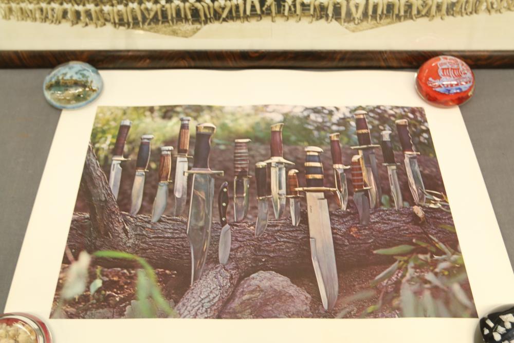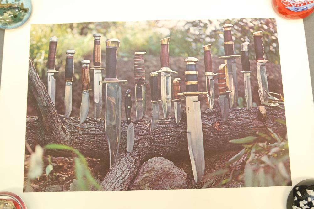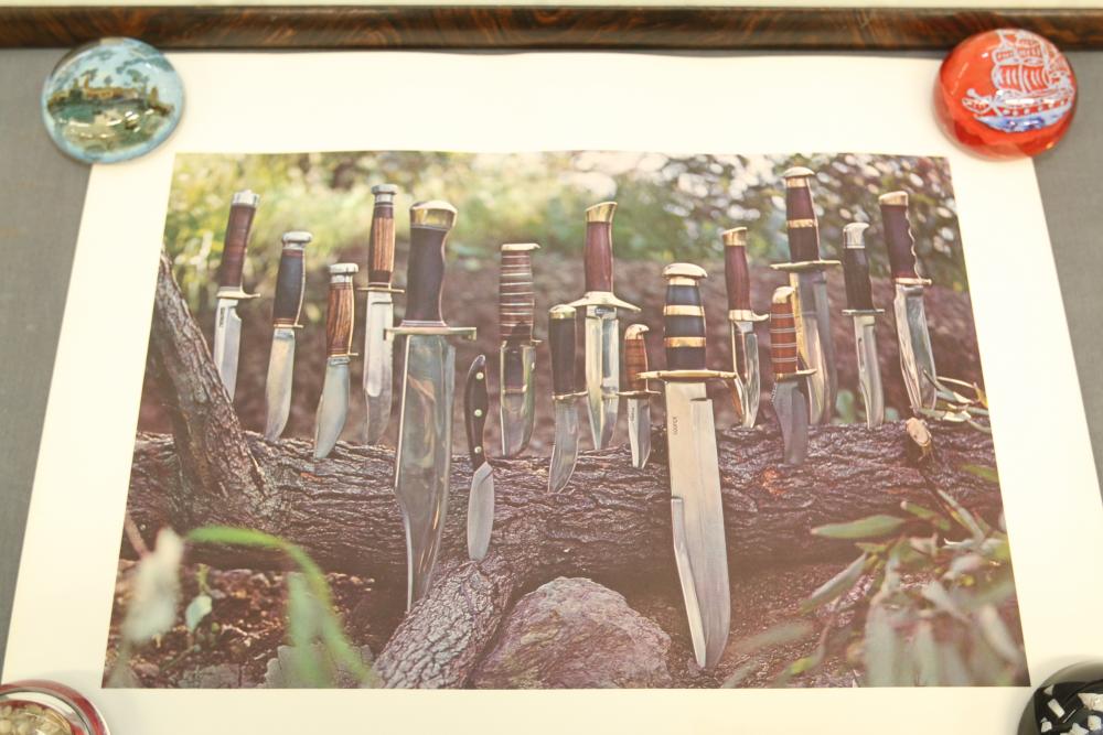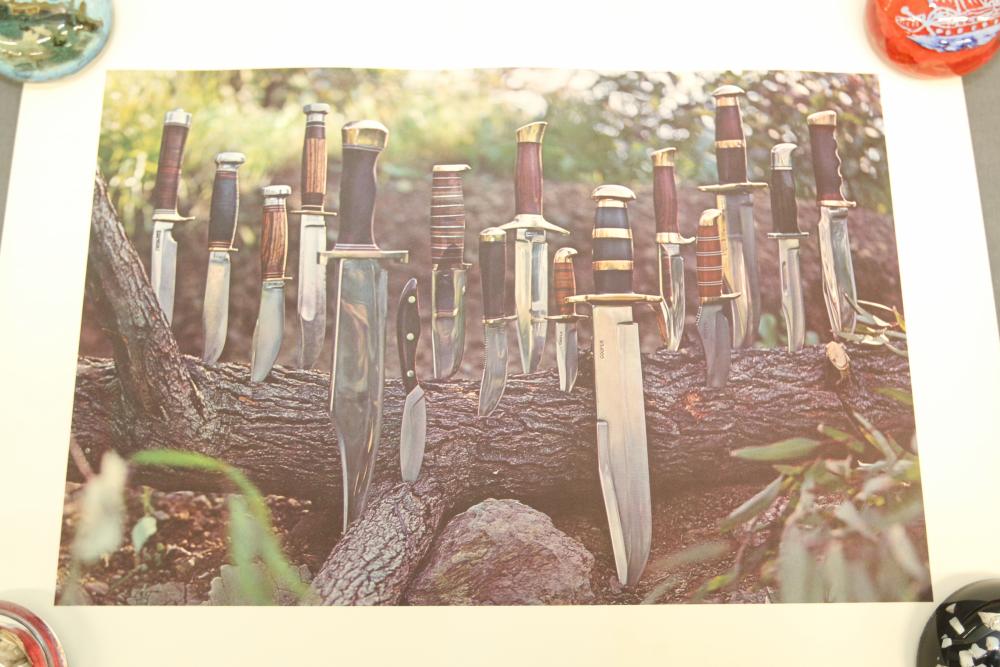Items include Deutsches Rotes Kereuz (DRK) subordinate's hewer; WWI U.S. 1917 trench knife knuckle duster; Moroccan sword scimitar; French Yataghan sword bayonet; Buffalo Bill Bowie knife; Inox boot knives in sheaths; Spanish Cavalry Officer's sword; Japanese Gunto sword in scabbard; decorative hanging chest armor with crest; fencing swords; miniature cannons; Chelsea Clock Co. U.S. Army clock; Harvard Lock Company cast iron bell; Nylglo 100% nylon Coast guard flag on flagpole; military literature; military clothing camouflages, hat, belts; U.S. Navy MK1 spyglass; metal ammo can and more. Items located in Pleasant Valley, NY.